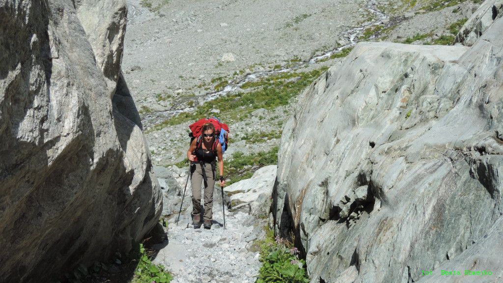 Następnego dnia rano wyruszyliśmy w stronę schroniska Écrins. Pierwszy etap naszej drogi – do schroniska Cezanne (1874 m n.p.m.) pokonaliśmy samochodem. Wzdłuż krętej, asfaltowej jezdni na dzikich campingach stało mnóstwo namiotów i samochodów. Droga ciągnąca się przez około 5 kilometrów kończyła się przy budynku schroniska. Znajdował się tam spory parking, gdzie za cenę dwóch euro można było zostawić samochód na 48 godzin. Według planu, tego dnia mieliśmy dotrzeć do schroniska Écrins i tam przenocować (po uprzedniej telefonicznej rezerwacji miejsc). Jednak fakt, że nie zabraliśmy namiotów i paru innych rzeczy potrzebnych do biwaku wcale nie sprawił, że nasze plecaki stały się dużo lżejsze (a w szczególności mój). Lina i sprzęt do asekuracji ważyły swoje, a im dłużej trwał nasz marsz tym częściej myślałem o tym, czego jeszcze nie musiałem brać ze sobą (uzbierała się tego spora lista). Początkowo szliśmy piarżystymi polami do mostku nad potokiem; dalej za mostkiem droga prowadziła zakosami po trawiastych stokach. Stopniowo trawy zanikały i trasa zaczęła nabierać skalno – kamienistego charakteru; w kilku miejscach pojawiły się też ubezpieczenia w postaci łańcuchów i drabinek. Minęliśmy po drodze ruiny starego schroniska Tucket i dotarliśmy do schroniska Glacier Blanc (2550 m n.p.m.). W tym miejscu Beata zawróciła, natomiast my z Kaśką szliśmy dalej. Droga prowadziła jeszcze kawałek do góry, a następnie zaczynała schodzić w dół, w stronę lodowca. Warunki na lodowcu były na tyle dobre, że praktycznie żaden z idących razem z nami zespołów nie związał się liną; sporo osób nie wyciągnęło nawet raków. My z Kaśką na wszelki wypadek zdecydowaliśmy się założyć raki, natomiast „sznurek” zostawiliśmy w plecaku.