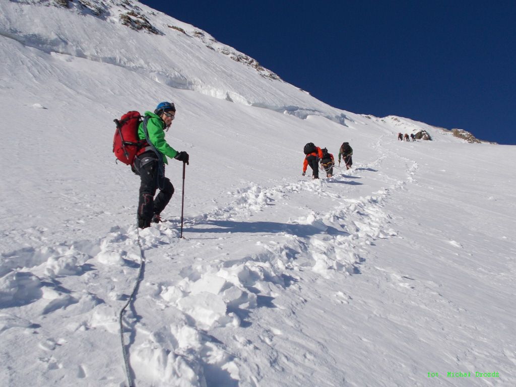 Największe trudności sprawiało wymijanie się z innymi zespołami wracającymi ze szczytu – momentami grań była bardzo wąska i uniknięcie wypadku przy takich manewrach wymagało sporej gimnastyki. Szczególnie mocno dała nam się we znaki trójka Węgrów, z którymi mijaliśmy się 15 metrów przed szczytem, na jednym z najwęższych i najbardziej eksponowanych odcinków drogi. Cała operacja trwała prawie dziesięć minut i zjadła sporo nerwów obu stronom. A wystarczyło żeby poczekali minutę dłużej na szczycie i obyłoby się bez tych wszystkich komplikacji!