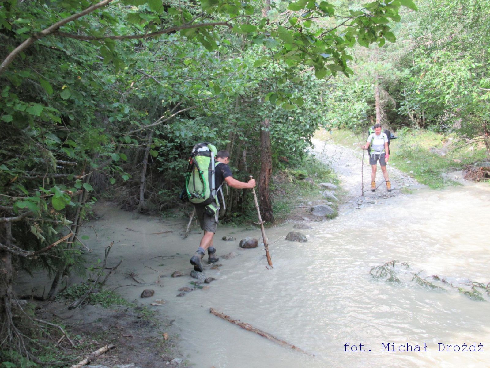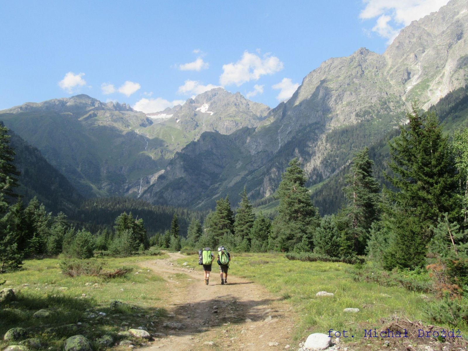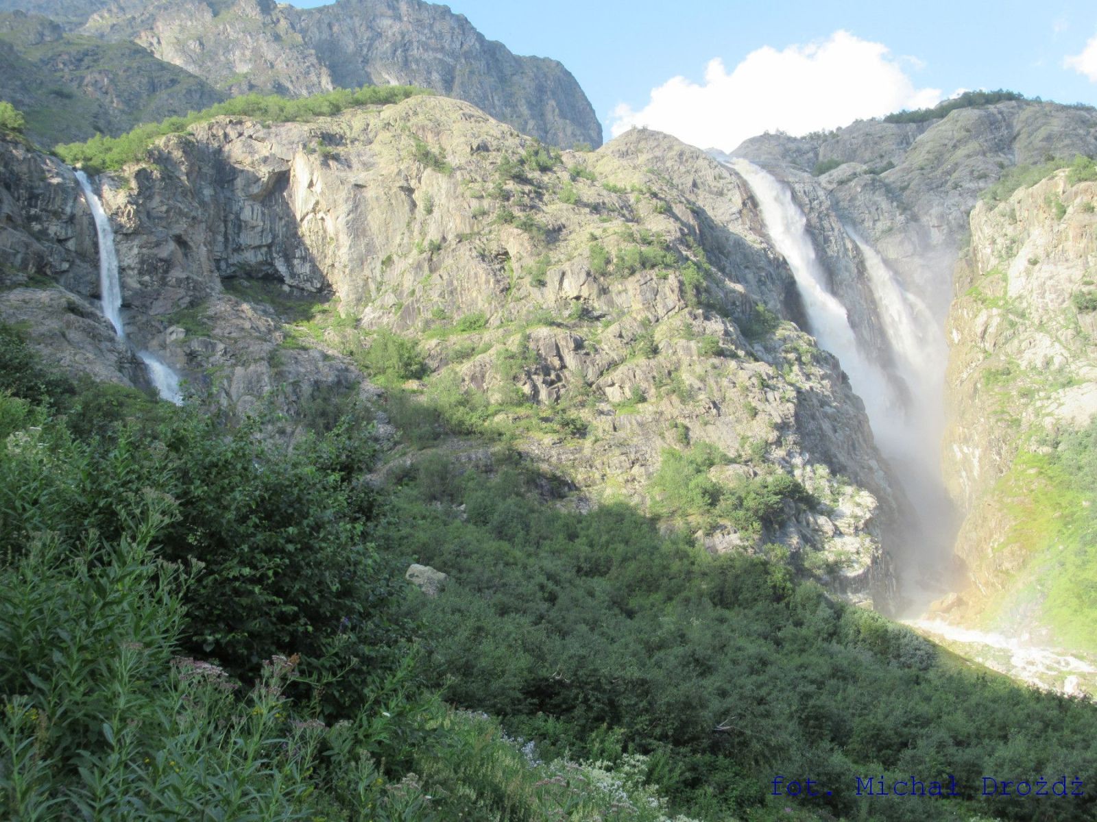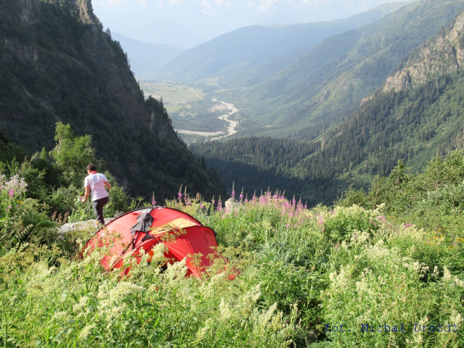 Niestety po zejściu z Tetnuldi okazało się, że Sebastian ma problemy ze stopą i musi wracać do Polski. Na Uszbę poszliśmy więc we trójkę: Kuba, Marta i ja. Z Mestii pojechaliśmy taksówką do niewielkiej wioski Mazeri, gdzie po uzupełnieniu zapasów wody ze źródeł mineralnych ruszyliśmy w stronę wodospadu Becho. Szliśmy polną ścieżką po płaskim terenie mijając po drodze niewielki guesthouse połączony z restauracją. Następnie przekroczyliśmy potok i weszliśmy do lasu. Stan wody był podniesiony, ale udało się nam przejść suchą stopą. Idąc lasem niespodziewanie spotkaliśmy znanego mi dotychczas tylko z mediów Denisa Urubko, który zmierzał w przeciwną stronę. Po krótkiej wymianie zdań okazało się, że nie miał wymaganego pozwolenia na przebywanie w strefie przygranicznej i został cofnięty z powrotem przez gruzińskich strażników. „Ale za trzy dni będę z powrotem” – powiedział na pożegnanie. My na szczęście mieliśmy wymagane dokumenty. Po przejściu mostu wiszącego nad rwącą rzeką, doszliśmy do posterunku granicznego, gdzie po pobieżnym sprawdzeniu dokumentów gruzińscy strażnicy puścili nas dalej. Droga w dalszym ciągu prowadziła przez las, ale zrobiło się już bardziej stromo. Cały dotychczasowy wysiłek został szybko wynagrodzony fantastycznym widokiem na ogromny wodospad Becho. Tuż za jego progiem miało się znajdować dogodne miejsce do założenia obozu. Najpierw jednak trzeba było wspiąć się tam idąc do góry krętą ścieżką. My swój namiot rozbiliśmy nieco poniżej tego miejsca, na łące w pobliżu strumienia. Na marginesie dodam, że istnieje możliwość wynajęcia koni, którymi można przetransportować bagaż do „jedynki”.