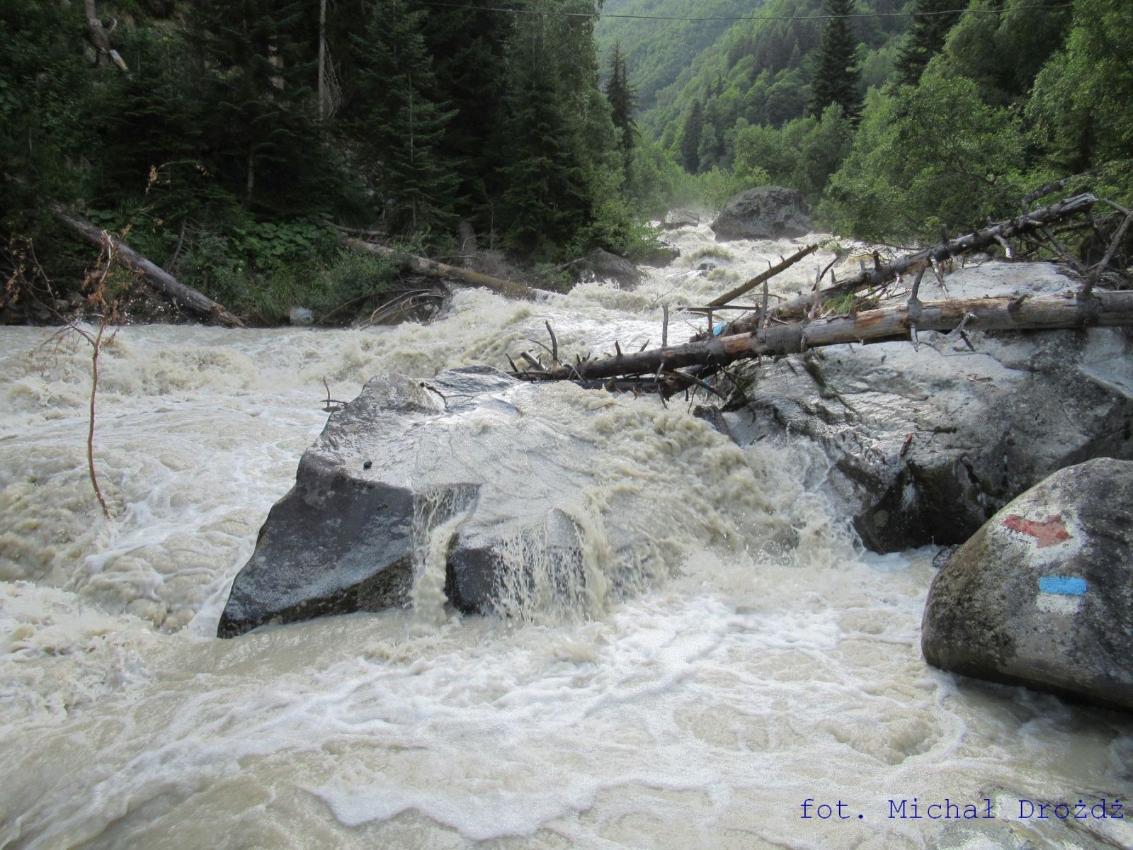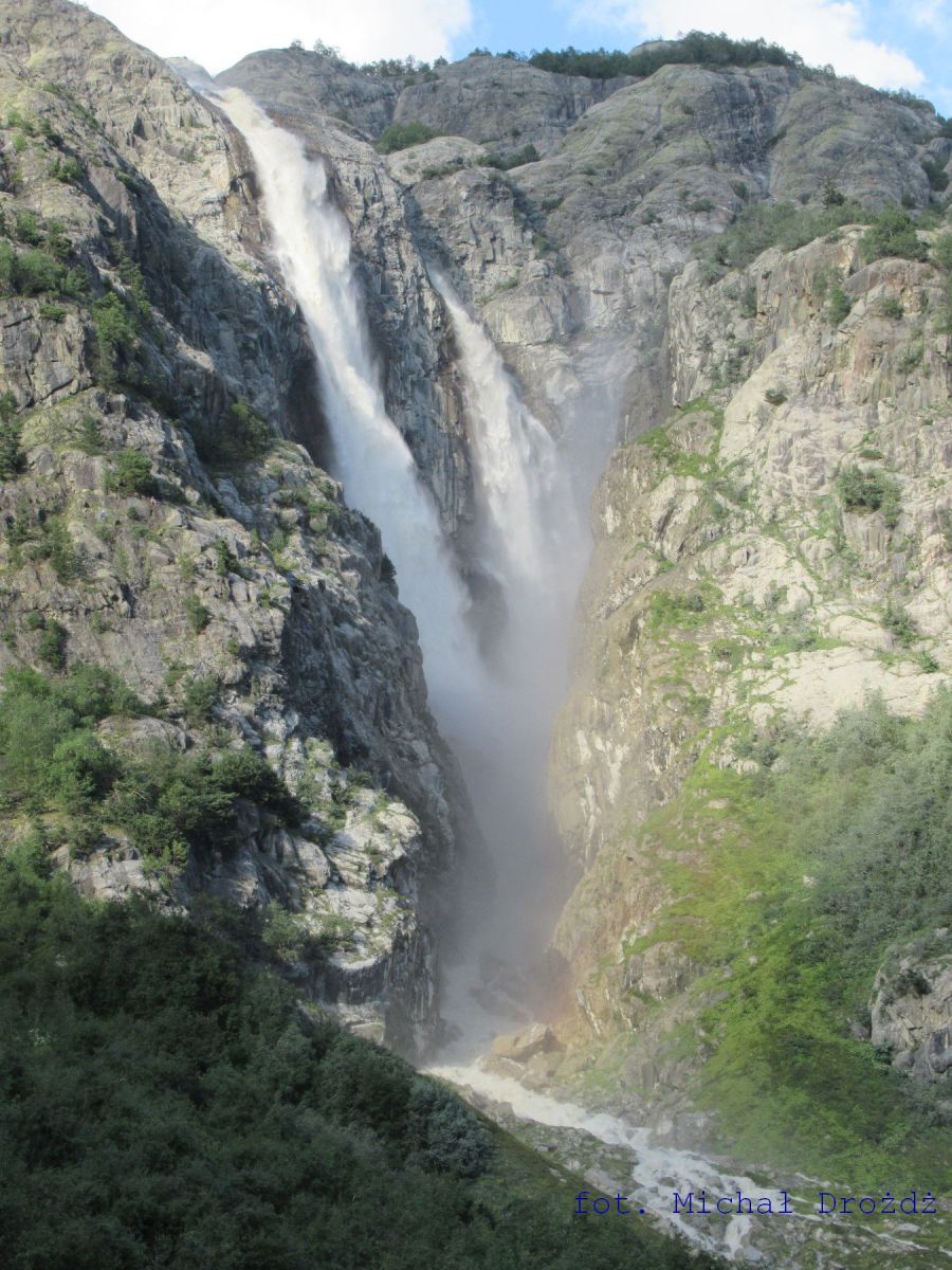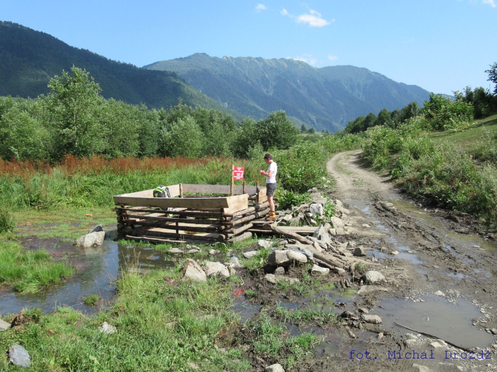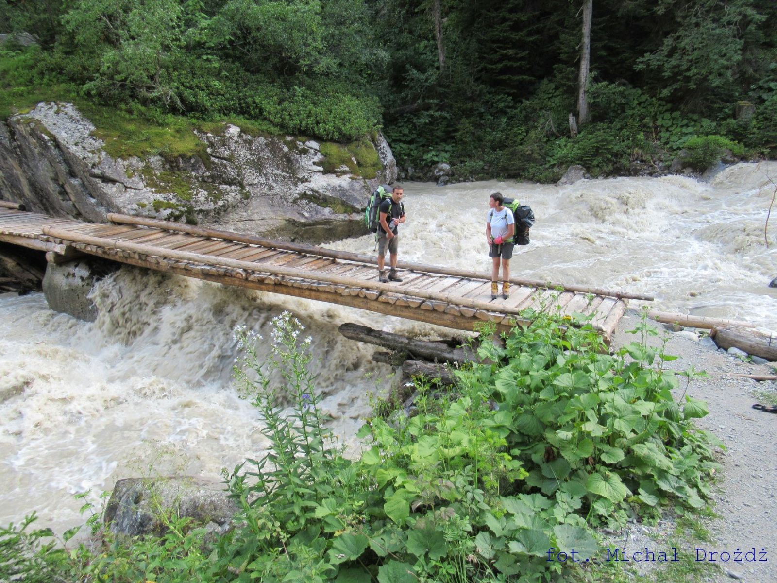 Niestety po zejściu z Tetnuldi okazało się, że Sebastian ma problemy ze stopą i musi wracać do Polski. Na Uszbę poszliśmy więc we trójkę: Kuba, Marta i ja. Z Mestii pojechaliśmy taksówką do niewielkiej wioski Mazeri, gdzie po uzupełnieniu zapasów wody ze źródeł mineralnych ruszyliśmy w stronę wodospadu Becho. Szliśmy polną ścieżką po płaskim terenie mijając po drodze niewielki guesthouse połączony z restauracją. Następnie przekroczyliśmy potok i weszliśmy do lasu. Stan wody był podniesiony, ale udało się nam przejść suchą stopą. Idąc lasem niespodziewanie spotkaliśmy znanego mi dotychczas tylko z mediów Denisa Urubko, który zmierzał w przeciwną stronę. Po krótkiej wymianie zdań okazało się, że nie miał wymaganego pozwolenia na przebywanie w strefie przygranicznej i został cofnięty z powrotem przez gruzińskich strażników. „Ale za trzy dni będę z powrotem” – powiedział na pożegnanie. My na szczęście mieliśmy wymagane dokumenty. Po przejściu mostu wiszącego nad rwącą rzeką, doszliśmy do posterunku granicznego, gdzie po pobieżnym sprawdzeniu dokumentów gruzińscy strażnicy puścili nas dalej. Droga w dalszym ciągu prowadziła przez las, ale zrobiło się już bardziej stromo. Cały dotychczasowy wysiłek został szybko wynagrodzony fantastycznym widokiem na ogromny wodospad Becho. Tuż za jego progiem miało się znajdować dogodne miejsce do założenia obozu. Najpierw jednak trzeba było wspiąć się tam idąc do góry krętą ścieżką. My swój namiot rozbiliśmy nieco poniżej tego miejsca, na łące w pobliżu strumienia. Na marginesie dodam, że istnieje możliwość wynajęcia koni, którymi można przetransportować bagaż do „jedynki”.