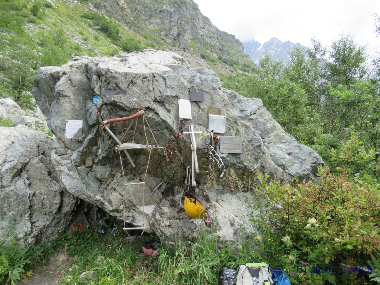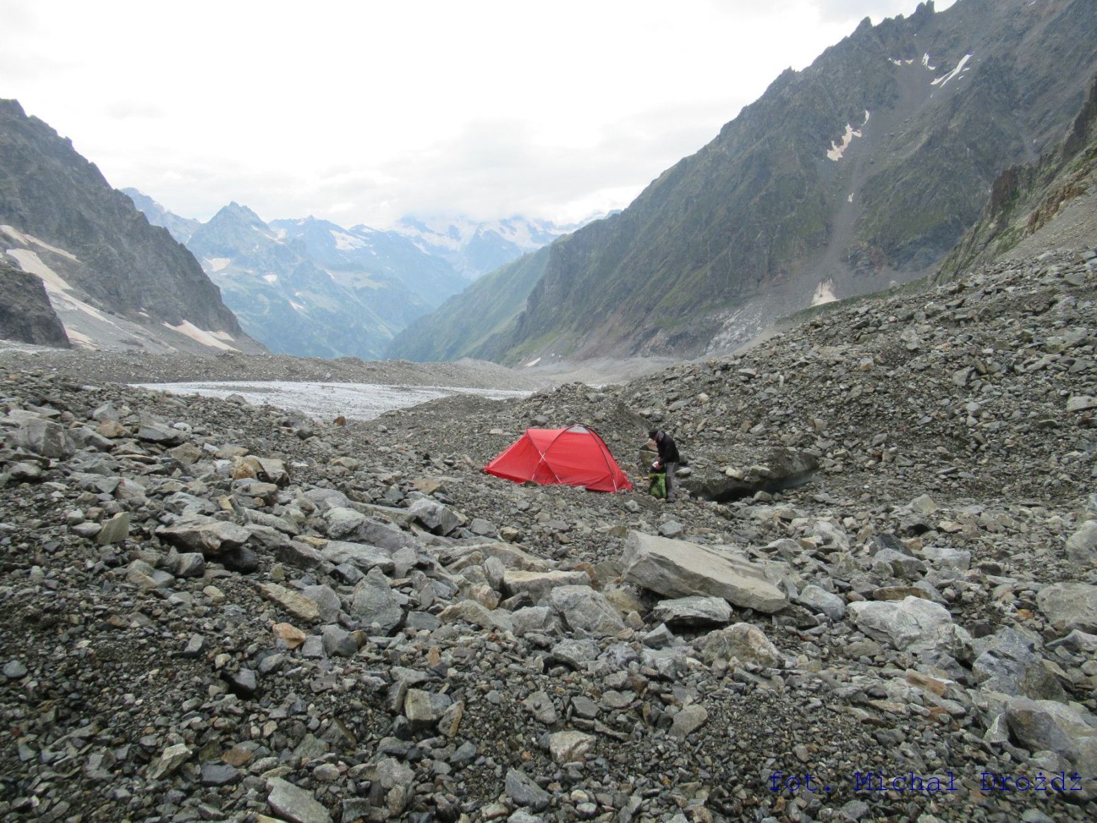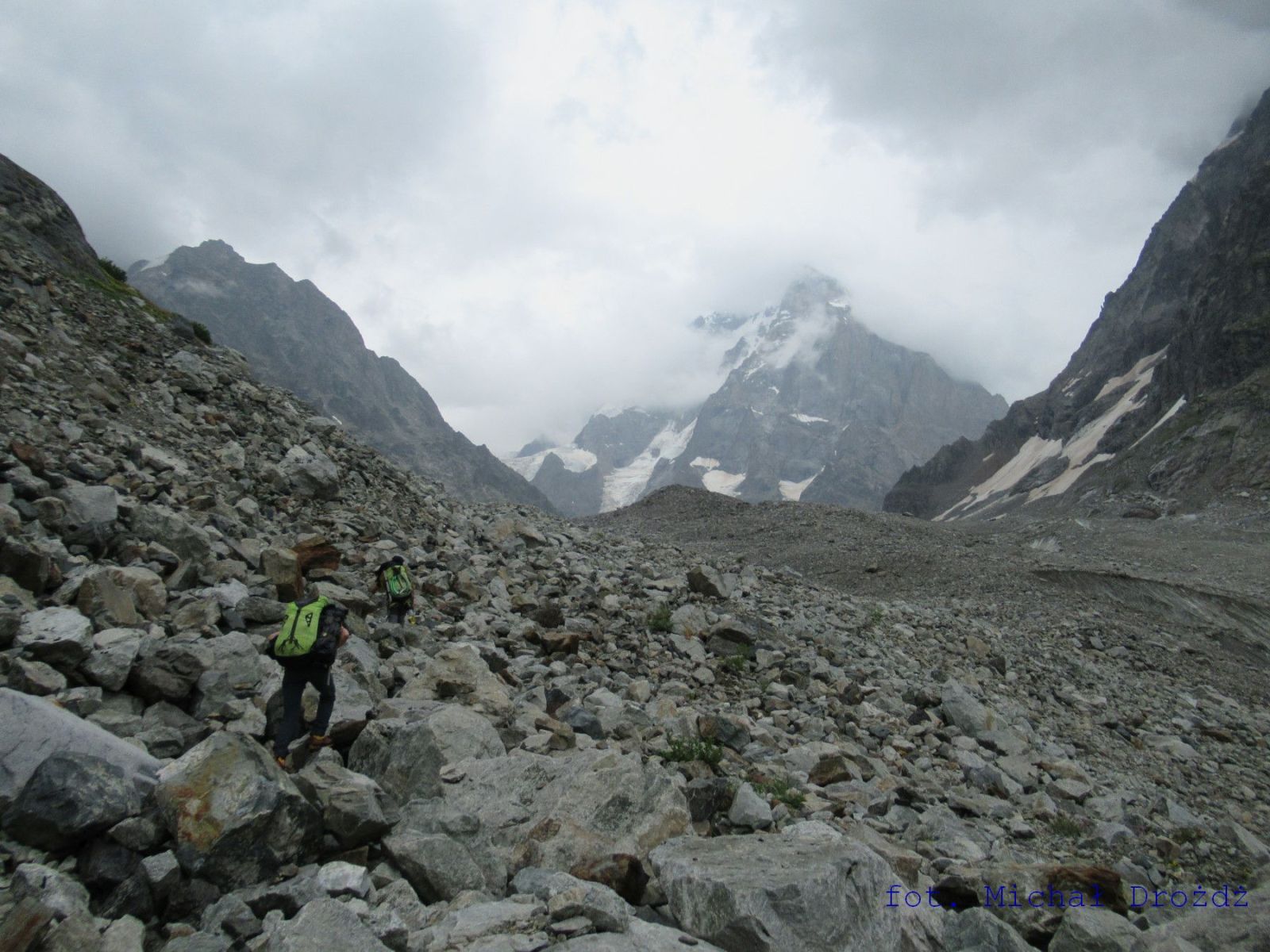 Następnego dnia ruszyliśmy dalej. Po drodze minęliśmy symboliczny cmentarz wspinaczy, którzy zginęli na Uszbie. Niestety wśród przedmiotów upamiętniających ofiary szczytu zauważyliśmy też mnóstwo śmieci. Wkrótce potem opuściliśmy obszar zielonych łąk i weszliśmy na mniej przyjemne piargi. Nieco dalej zaczynał się już lodowiec również pokryty kamieniami. Przez prawie cały czas siąpił lekki deszcz, co jeszcze bardziej potęgowało ponury obraz okolicy. Majaczący się przed nami masyw Uszby był prawie przez cały czas pokryty chmurami. Późnym popołudniem dotarliśmy do miejsca, gdzie można było założyć obóz drugi. Z obawy przed spadającymi kamieniami namiot rozstawiliśmy mniej więcej pośrodku lodowca z dala od skalnych ścian. Wodę czerpaliśmy w jednym z niewielkich strumieni płynących przez lodowiec.