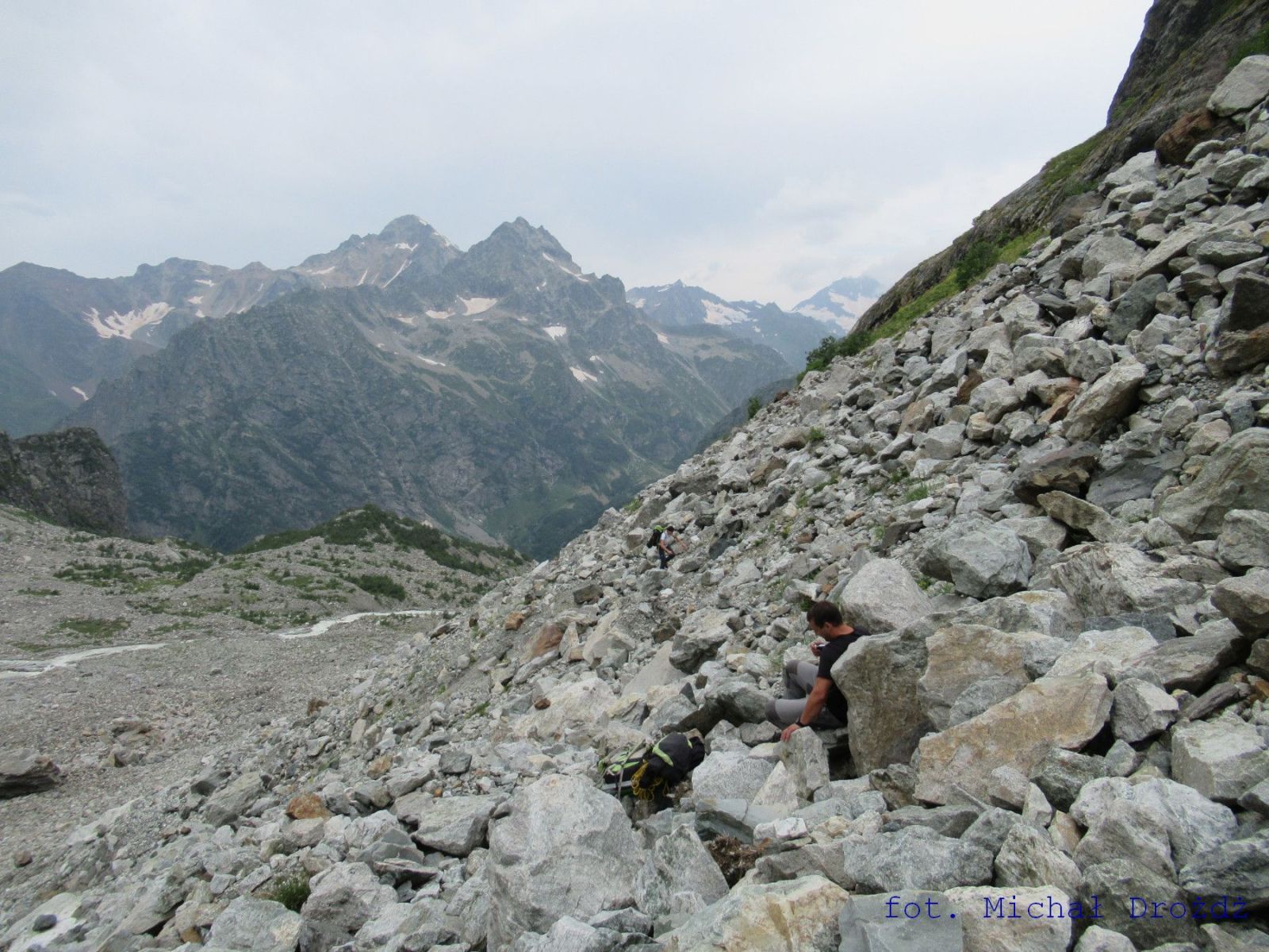 Jeszcze tego samego dnia przenieśliśmy namiot z Uszbijskiego Plateu do naszego dawnego obozu trzeciego. Nazajutrz schodziliśmy dalej docierając z powrotem w okolice cmentarza ofiar Uszby. I wtedy, pierwszy raz od pięciu dni spotkaliśmy jakiś ludzi – było to dwóch wspinaczy z Francji albo Szwajcarii idących w kierunku Uszbijskiego Plateu. Później okazało się, że wieczorem tego samego dnia złapała ich tam straszna burza, zmuszając ich do przyspieszonego odwrotu w dół. Przy cmentarzu spotkaliśmy z kolei dwóch Ukraińców, którzy poczęstowali nas napojami i jedzeniem (nasze zapasy były już prawie na wyczerpaniu). Próbowali już trzeci rok z rzędu wejść na Uszbę drogą normalną; dotychczas za każdym razem pogoda krzyżowała im plany. My następnego dnia byliśmy już w Mestii.
