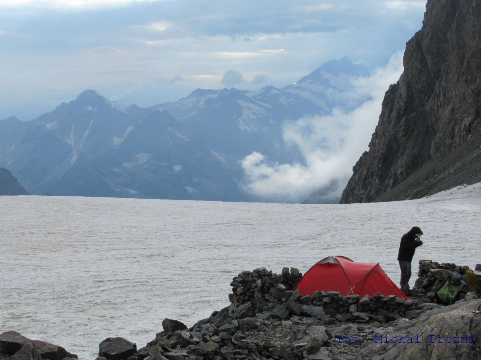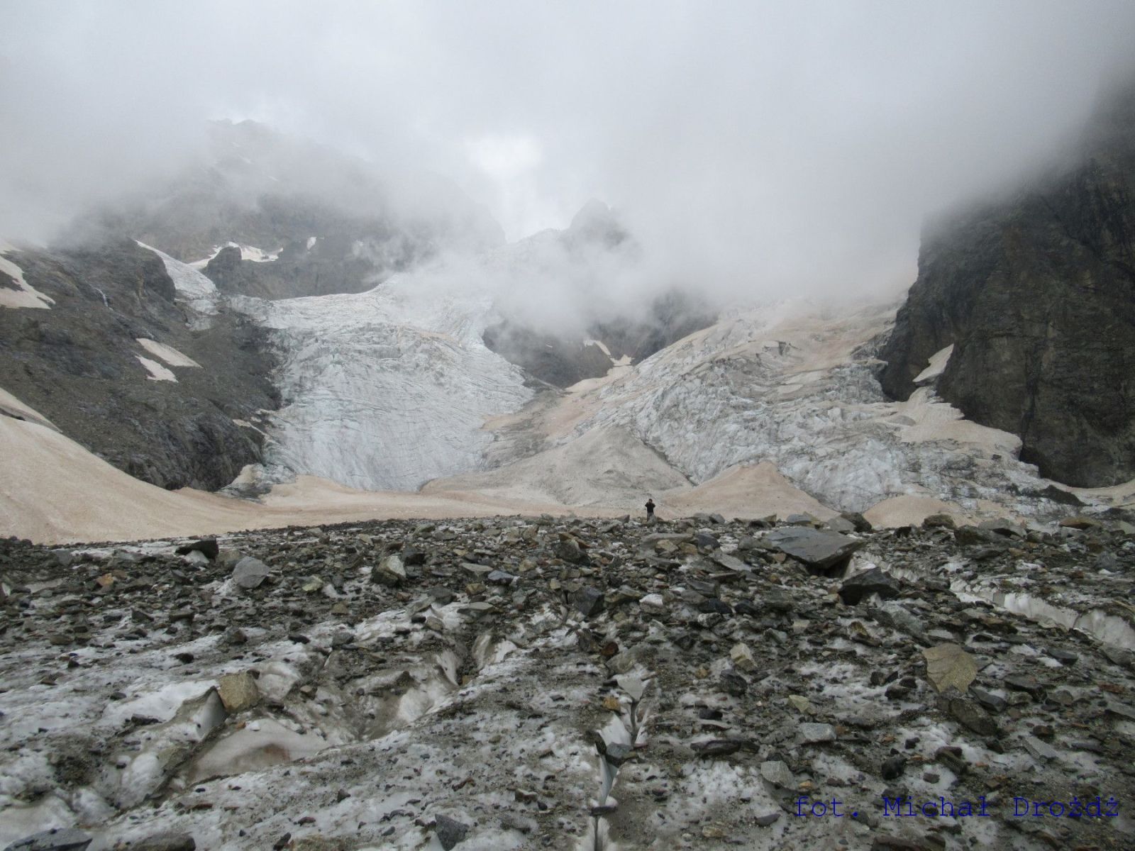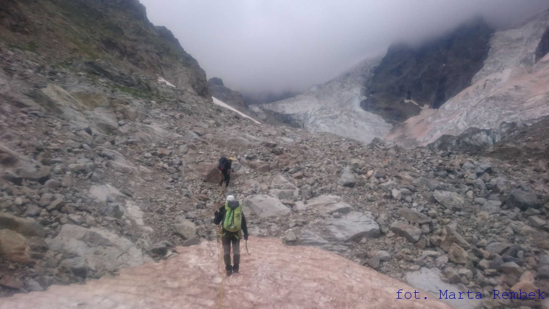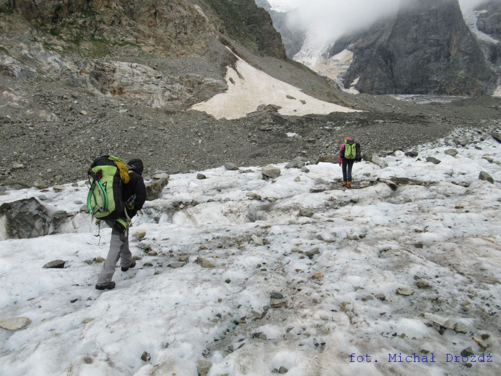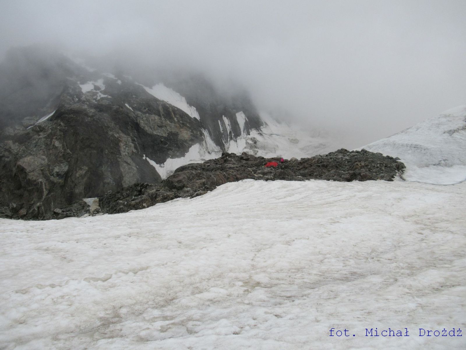 Kolejny dzień postawił przed nami poważniejsze wyzwanie – musieliśmy przejść przez Uszbijski Lodowiec i dotrzeć na znajdujące się powyżej niego plateu. We wszystkich relacjach i przewodnikowych opisach znajdowały się informacje, że jest on mocno uszczeliniony i ostrzegano przed kamieniami spadającymi z okolicznych ścian i szczytów. Dlatego zalecany jest start we wczesnych godzinach rannych, kiedy wszystko było jeszcze w miarę zmrożone. Ze względu na opisane wyżej zagrożenia odradzane było robienie jakichkolwiek postojów na lodowcu. Wystartowaliśmy idąc kamienistym terenem, a następnie weszliśmy na dwa śnieżne pola przedzielone piarżystymi zboczami. Cały czas siąpił deszcz, a wierzchołek Uszby w dalszym ciągu był schowany za gęstymi chmurami. W końcu, po wspięciu się na lodowy prożek znaleźliśmy się na Uszbijskim Lodowcu (Lodospadzie). Był on jedną wielką plątaniną szczelin. Cały był pokryty drobnymi kamyczkami, które uniemożliwiały porządne wbijanie raków w lód. Z kolei zdjęcie raków i poruszanie się w samych butach nie wchodziło w rachubę – było na to zdecydowanie za ślisko. Na lodowiec weszliśmy podchodząc jego lewą stroną, a następnie kluczyliśmy wśród szczelin starając znaleźć właściwą drogę w tym labiryncie. Później zostało nam już tylko wejście długim śnieżnym zboczem, a następnie trawers po przykrytym drobnym żwirem lodzie i w końcu wyszliśmy na rozległe śnieżne plateu. Na jego drugim końcu znajdowało się coś w rodzaju skalnej wyspy, na której znajdowało się kilka platform pod namioty. I tam też zdecydowaliśmy się założyć kolejny obóz. Szczęśliwie po raz kolejny udało nam się znaleźć niewielki strumień płynący po lodowcu, co uchroniło nas przed długotrwałym topieniem śniegu. Niestety w dalszym ciągu padało: w ciągu dnia deszcz, a wieczorem gęsty śnieg.