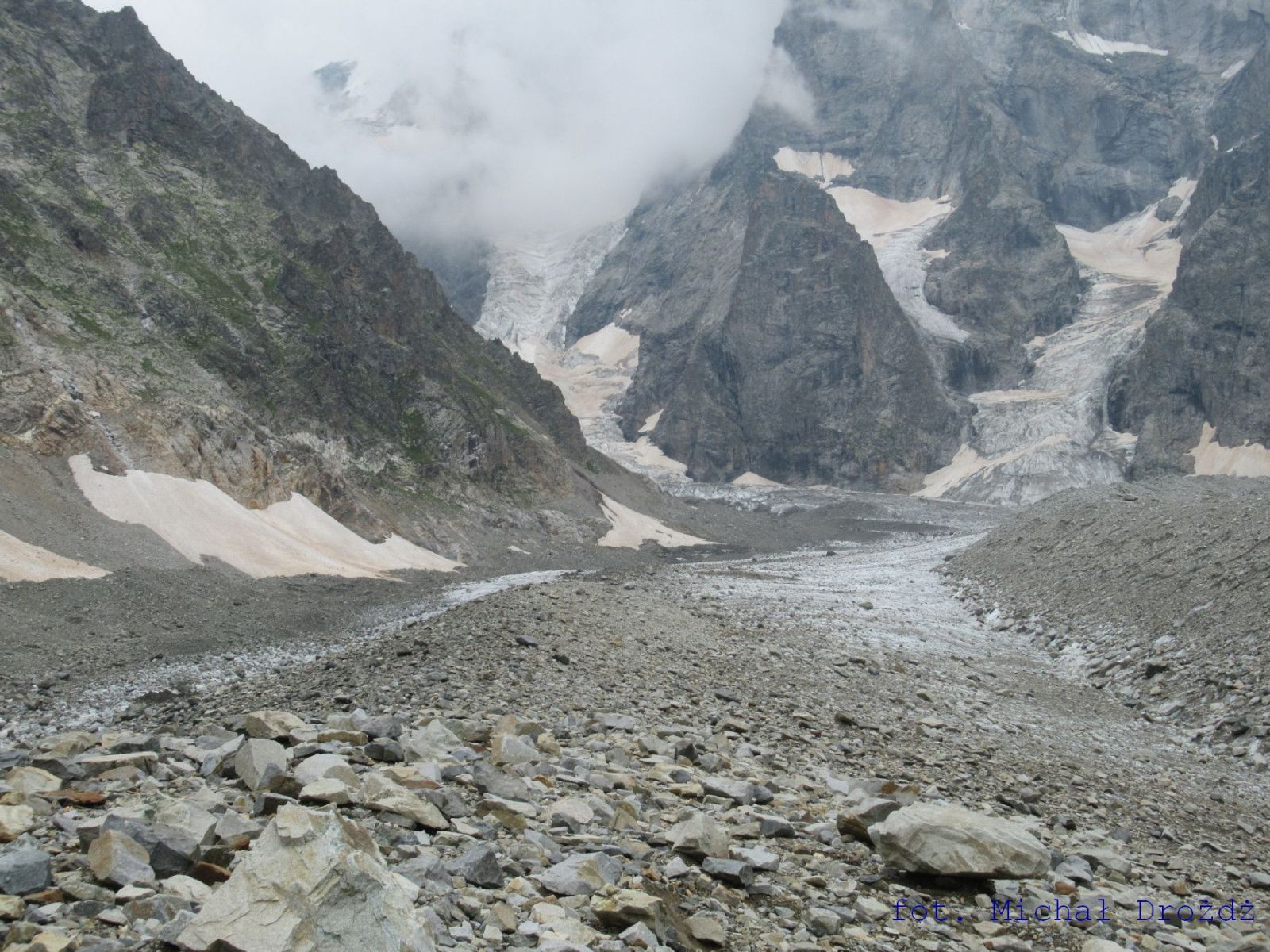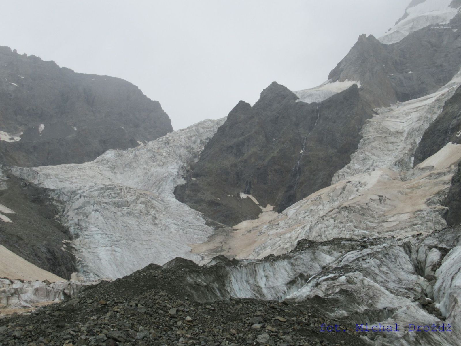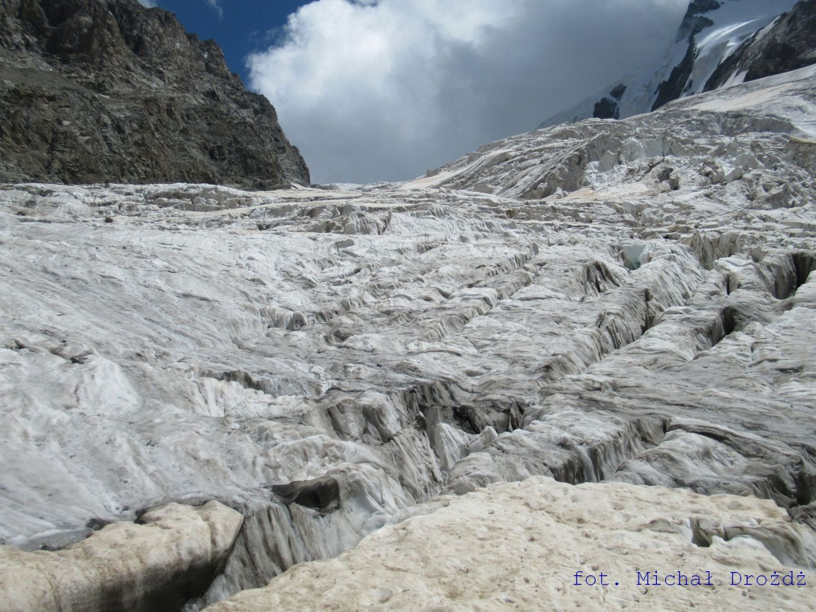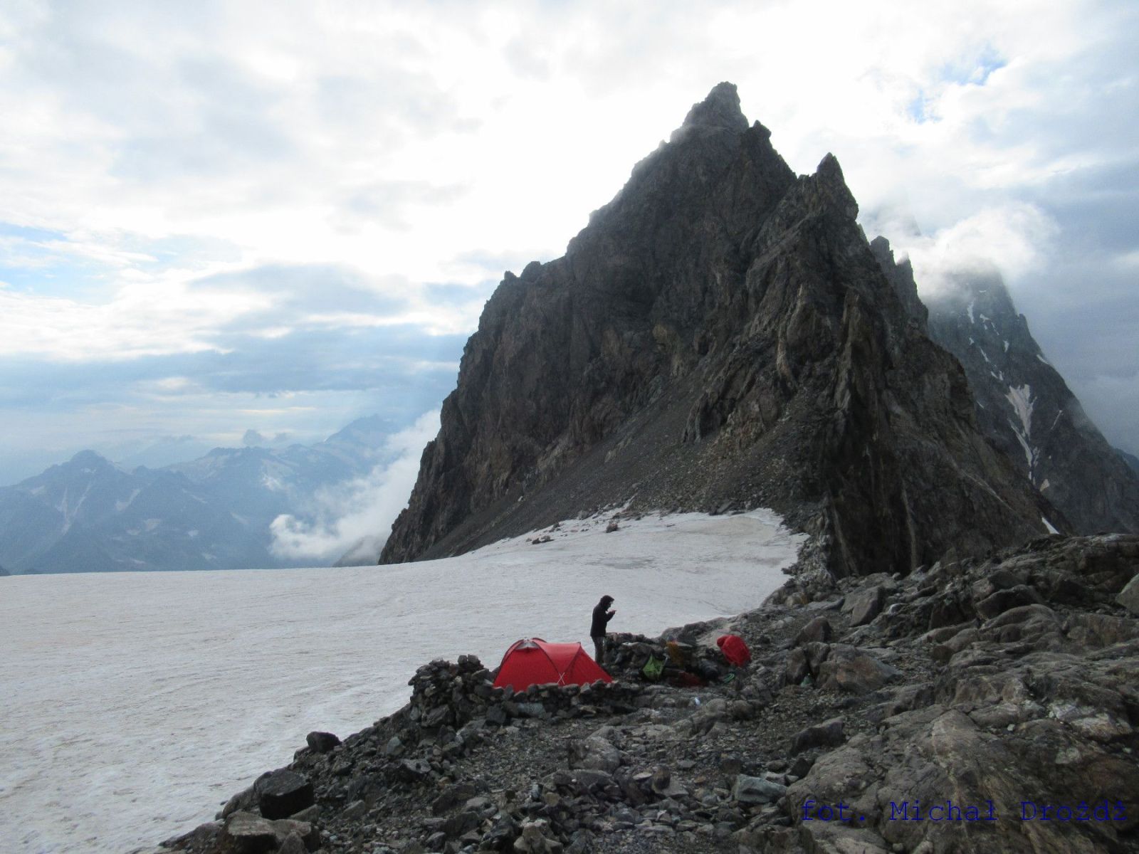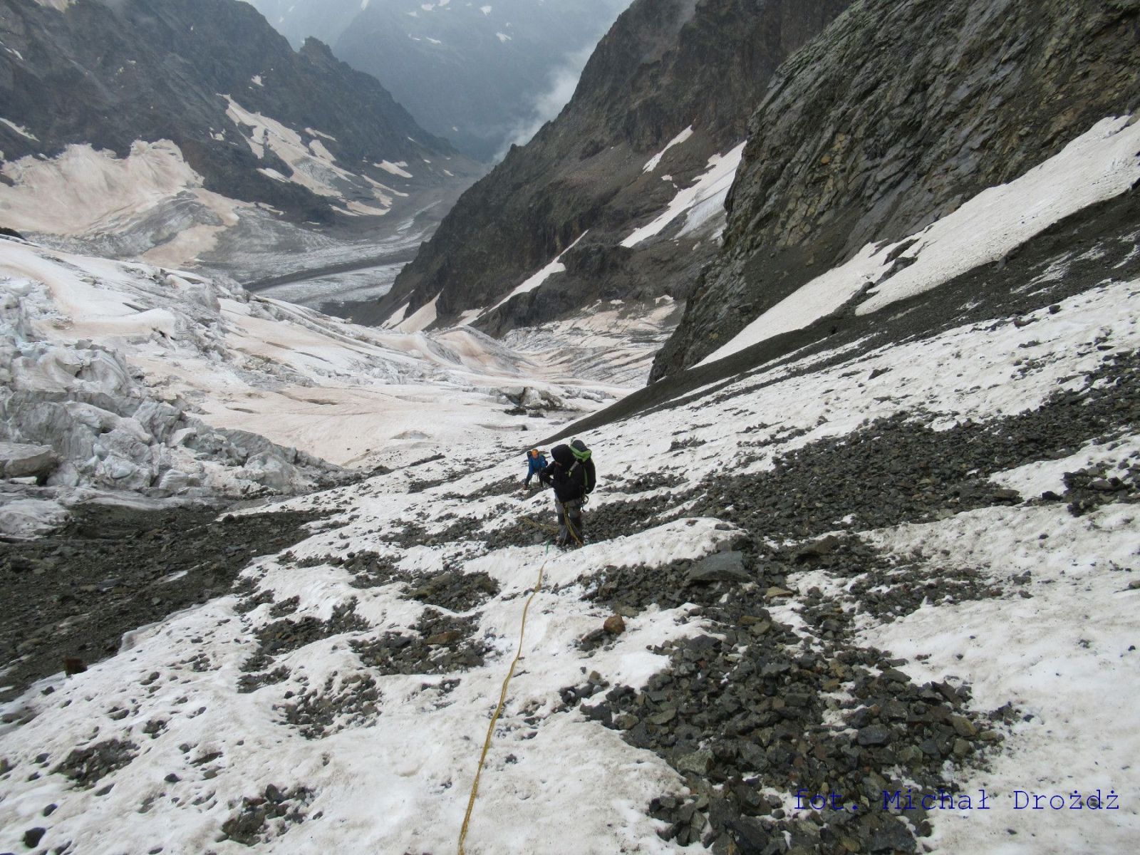 Kolejny dzień postawił przed nami poważniejsze wyzwanie – musieliśmy przejść przez Uszbijski Lodowiec i dotrzeć na znajdujące się powyżej niego plateu. We wszystkich relacjach i przewodnikowych opisach znajdowały się informacje, że jest on mocno uszczeliniony i ostrzegano przed kamieniami spadającymi z okolicznych ścian i szczytów. Dlatego zalecany jest start we wczesnych godzinach rannych, kiedy wszystko było jeszcze w miarę zmrożone. Ze względu na opisane wyżej zagrożenia odradzane było robienie jakichkolwiek postojów na lodowcu. Wystartowaliśmy idąc kamienistym terenem, a następnie weszliśmy na dwa śnieżne pola przedzielone piarżystymi zboczami. Cały czas siąpił deszcz, a wierzchołek Uszby w dalszym ciągu był schowany za gęstymi chmurami. W końcu, po wspięciu się na lodowy prożek znaleźliśmy się na Uszbijskim Lodowcu (Lodospadzie). Był on jedną wielką plątaniną szczelin. Cały był pokryty drobnymi kamyczkami, które uniemożliwiały porządne wbijanie raków w lód. Z kolei zdjęcie raków i poruszanie się w samych butach nie wchodziło w rachubę – było na to zdecydowanie za ślisko. Na lodowiec weszliśmy podchodząc jego lewą stroną, a następnie kluczyliśmy wśród szczelin starając znaleźć właściwą drogę w tym labiryncie. Później zostało nam już tylko wejście długim śnieżnym zboczem, a następnie trawers po przykrytym drobnym żwirem lodzie i w końcu wyszliśmy na rozległe śnieżne plateu. Na jego drugim końcu znajdowało się coś w rodzaju skalnej wyspy, na której znajdowało się kilka platform pod namioty. I tam też zdecydowaliśmy się założyć kolejny obóz. Szczęśliwie po raz kolejny udało nam się znaleźć niewielki strumień płynący po lodowcu, co uchroniło nas przed długotrwałym topieniem śniegu. Niestety w dalszym ciągu padało: w ciągu dnia deszcz, a wieczorem gęsty śnieg.