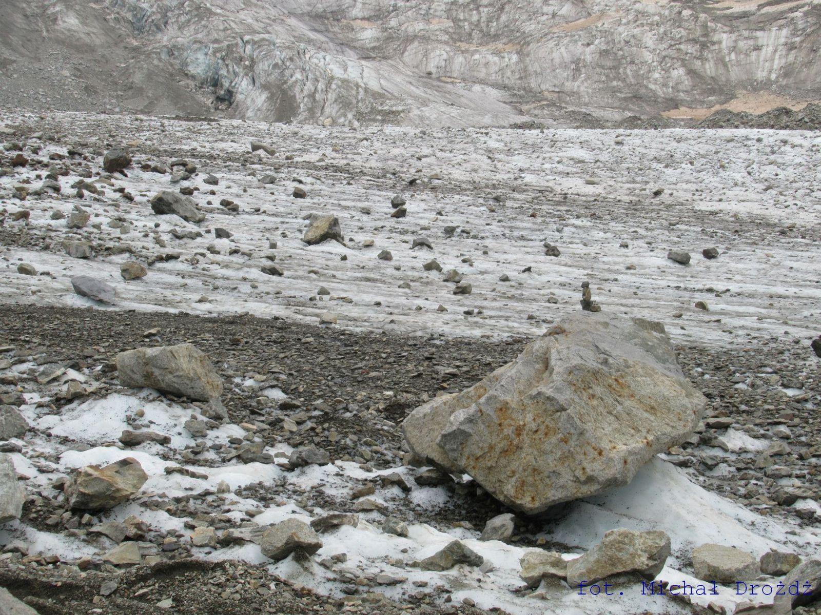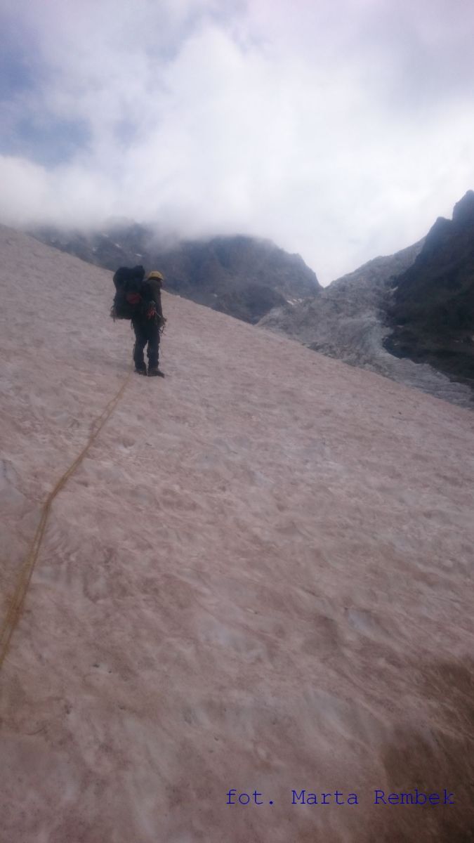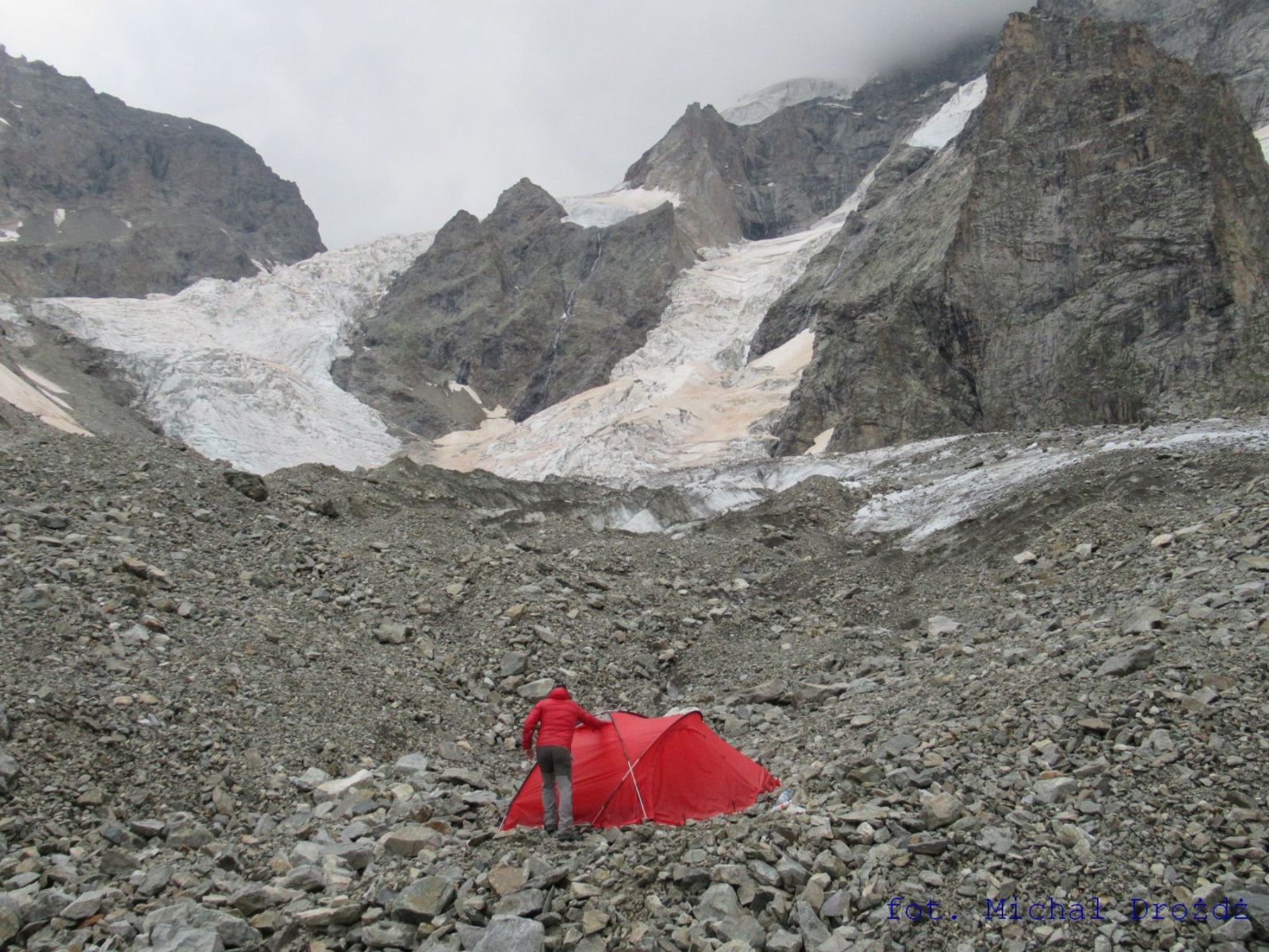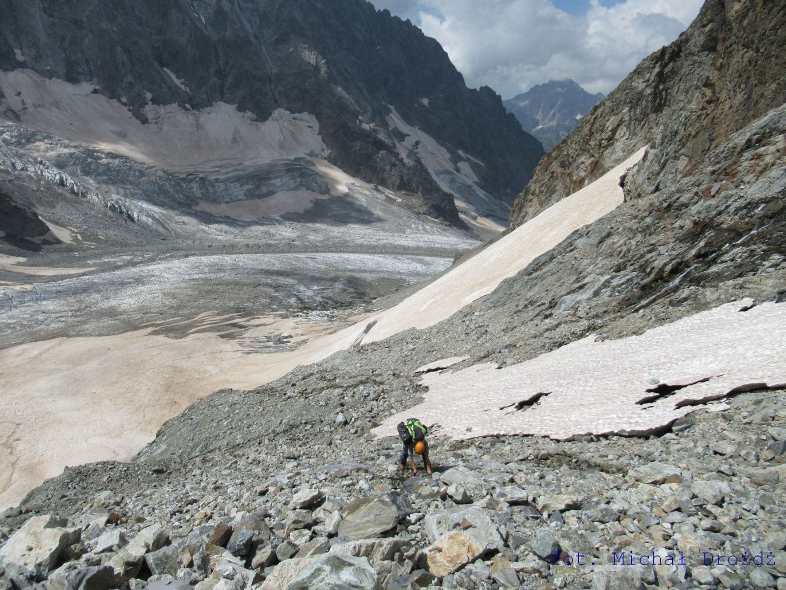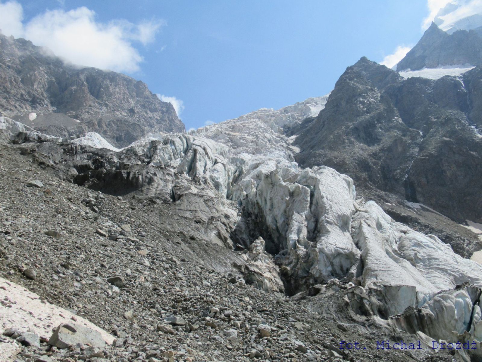 Kolejny dzień postawił przed nami poważniejsze wyzwanie – musieliśmy przejść przez Uszbijski Lodowiec i dotrzeć na znajdujące się powyżej niego plateu. We wszystkich relacjach i przewodnikowych opisach znajdowały się informacje, że jest on mocno uszczeliniony i ostrzegano przed kamieniami spadającymi z okolicznych ścian i szczytów. Dlatego zalecany jest start we wczesnych godzinach rannych, kiedy wszystko było jeszcze w miarę zmrożone. Ze względu na opisane wyżej zagrożenia odradzane było robienie jakichkolwiek postojów na lodowcu. Wystartowaliśmy idąc kamienistym terenem, a następnie weszliśmy na dwa śnieżne pola przedzielone piarżystymi zboczami. Cały czas siąpił deszcz, a wierzchołek Uszby w dalszym ciągu był schowany za gęstymi chmurami. W końcu, po wspięciu się na lodowy prożek znaleźliśmy się na Uszbijskim Lodowcu (Lodospadzie). Był on jedną wielką plątaniną szczelin. Cały był pokryty drobnymi kamyczkami, które uniemożliwiały porządne wbijanie raków w lód. Z kolei zdjęcie raków i poruszanie się w samych butach nie wchodziło w rachubę – było na to zdecydowanie za ślisko. Na lodowiec weszliśmy podchodząc jego lewą stroną, a następnie kluczyliśmy wśród szczelin starając znaleźć właściwą drogę w tym labiryncie. Później zostało nam już tylko wejście długim śnieżnym zboczem, a następnie trawers po przykrytym drobnym żwirem lodzie i w końcu wyszliśmy na rozległe śnieżne plateu. Na jego drugim końcu znajdowało się coś w rodzaju skalnej wyspy, na której znajdowało się kilka platform pod namioty. I tam też zdecydowaliśmy się założyć kolejny obóz. Szczęśliwie po raz kolejny udało nam się znaleźć niewielki strumień płynący po lodowcu, co uchroniło nas przed długotrwałym topieniem śniegu. Niestety w dalszym ciągu padało: w ciągu dnia deszcz, a wieczorem gęsty śnieg.
