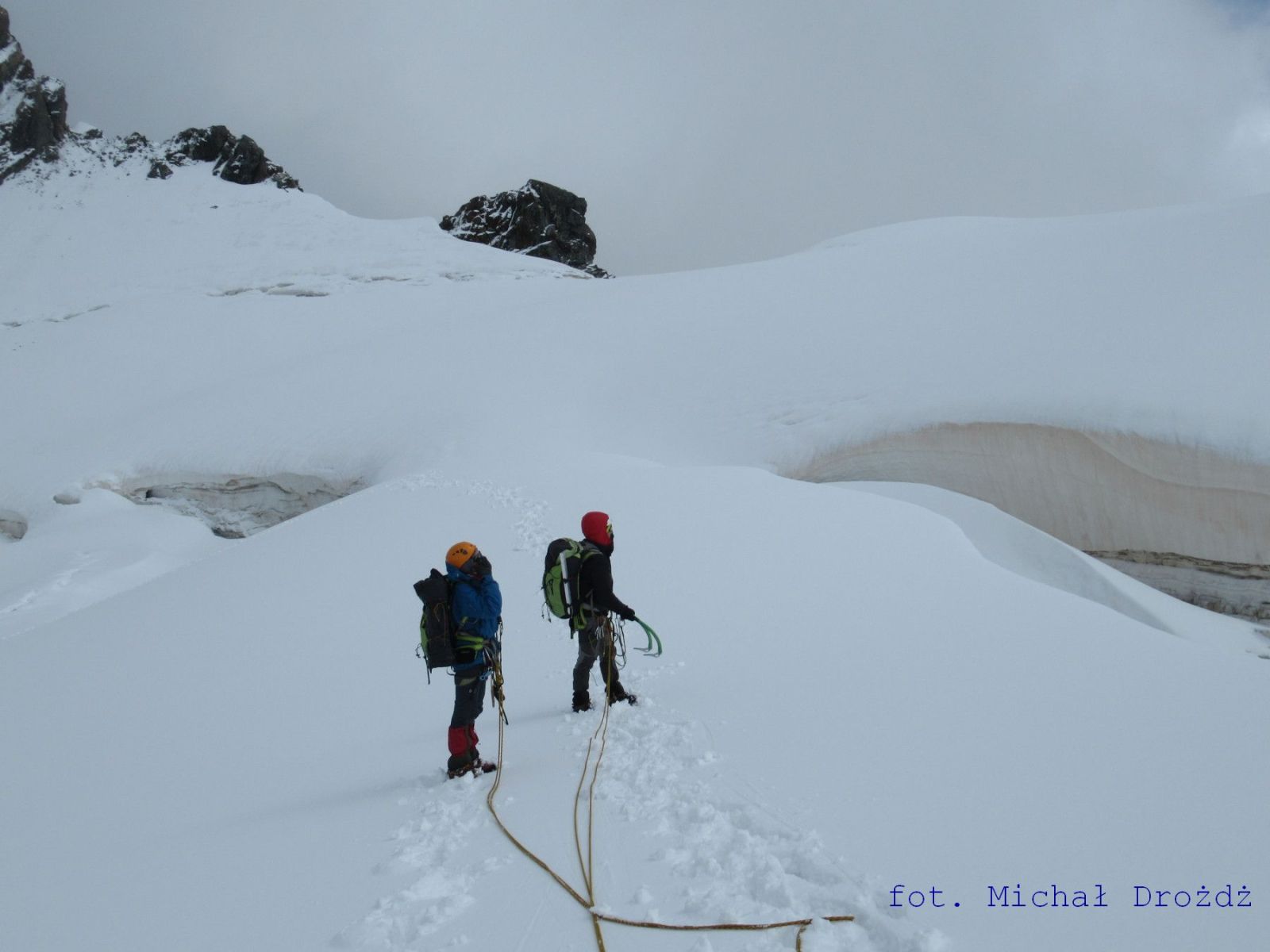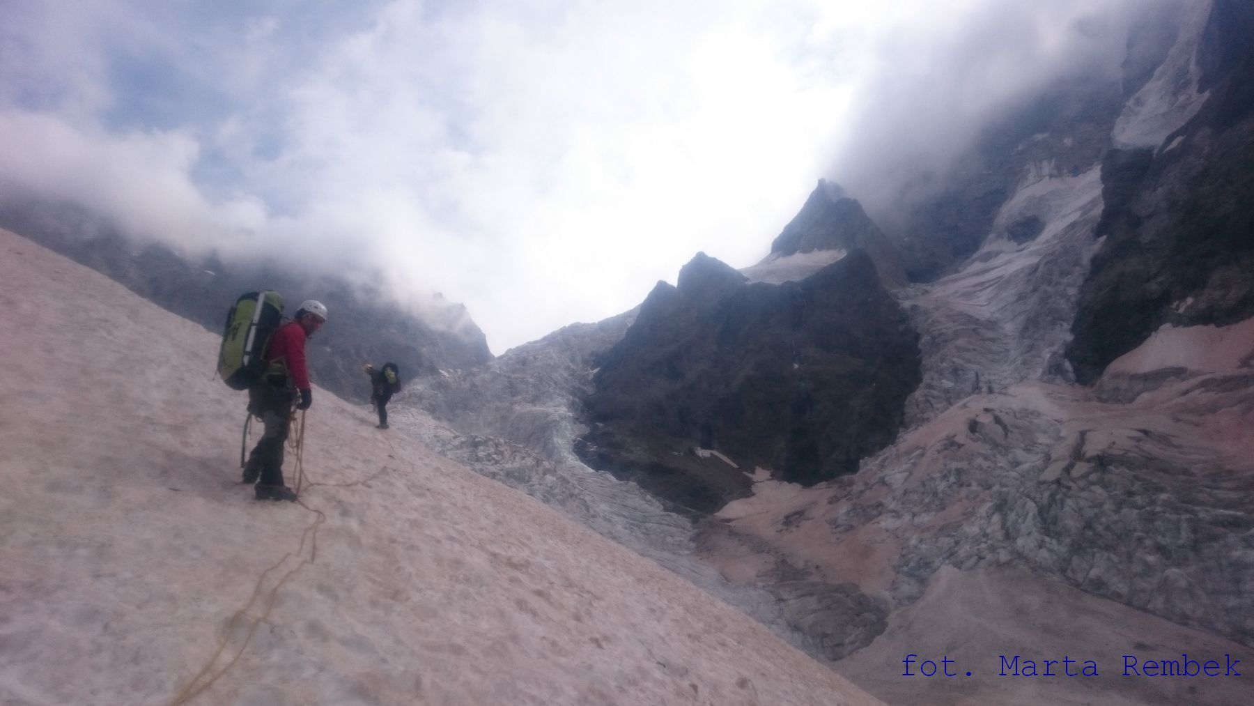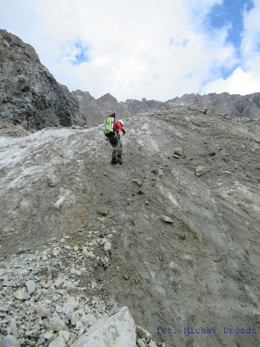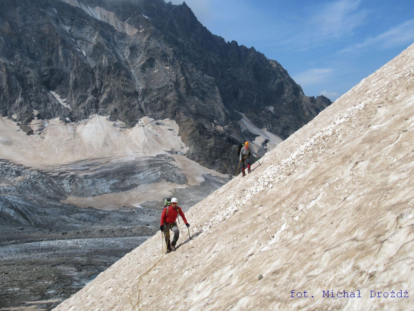 Kolejny dzień postawił przed nami poważniejsze wyzwanie – musieliśmy przejść przez Uszbijski Lodowiec i dotrzeć na znajdujące się powyżej niego plateu. We wszystkich relacjach i przewodnikowych opisach znajdowały się informacje, że jest on mocno uszczeliniony i ostrzegano przed kamieniami spadającymi z okolicznych ścian i szczytów. Dlatego zalecany jest start we wczesnych godzinach rannych, kiedy wszystko było jeszcze w miarę zmrożone. Ze względu na opisane wyżej zagrożenia odradzane było robienie jakichkolwiek postojów na lodowcu. Wystartowaliśmy idąc kamienistym terenem, a następnie weszliśmy na dwa śnieżne pola przedzielone piarżystymi zboczami. Cały czas siąpił deszcz, a wierzchołek Uszby w dalszym ciągu był schowany za gęstymi chmurami. W końcu, po wspięciu się na lodowy prożek znaleźliśmy się na Uszbijskim Lodowcu (Lodospadzie). Był on jedną wielką plątaniną szczelin. Cały był pokryty drobnymi kamyczkami, które uniemożliwiały porządne wbijanie raków w lód. Z kolei zdjęcie raków i poruszanie się w samych butach nie wchodziło w rachubę – było na to zdecydowanie za ślisko. Na lodowiec weszliśmy podchodząc jego lewą stroną, a następnie kluczyliśmy wśród szczelin starając znaleźć właściwą drogę w tym labiryncie. Później zostało nam już tylko wejście długim śnieżnym zboczem, a następnie trawers po przykrytym drobnym żwirem lodzie i w końcu wyszliśmy na rozległe śnieżne plateu. Na jego drugim końcu znajdowało się coś w rodzaju skalnej wyspy, na której znajdowało się kilka platform pod namioty. I tam też zdecydowaliśmy się założyć kolejny obóz. Szczęśliwie po raz kolejny udało nam się znaleźć niewielki strumień płynący po lodowcu, co uchroniło nas przed długotrwałym topieniem śniegu. Niestety w dalszym ciągu padało: w ciągu dnia deszcz, a wieczorem gęsty śnieg.