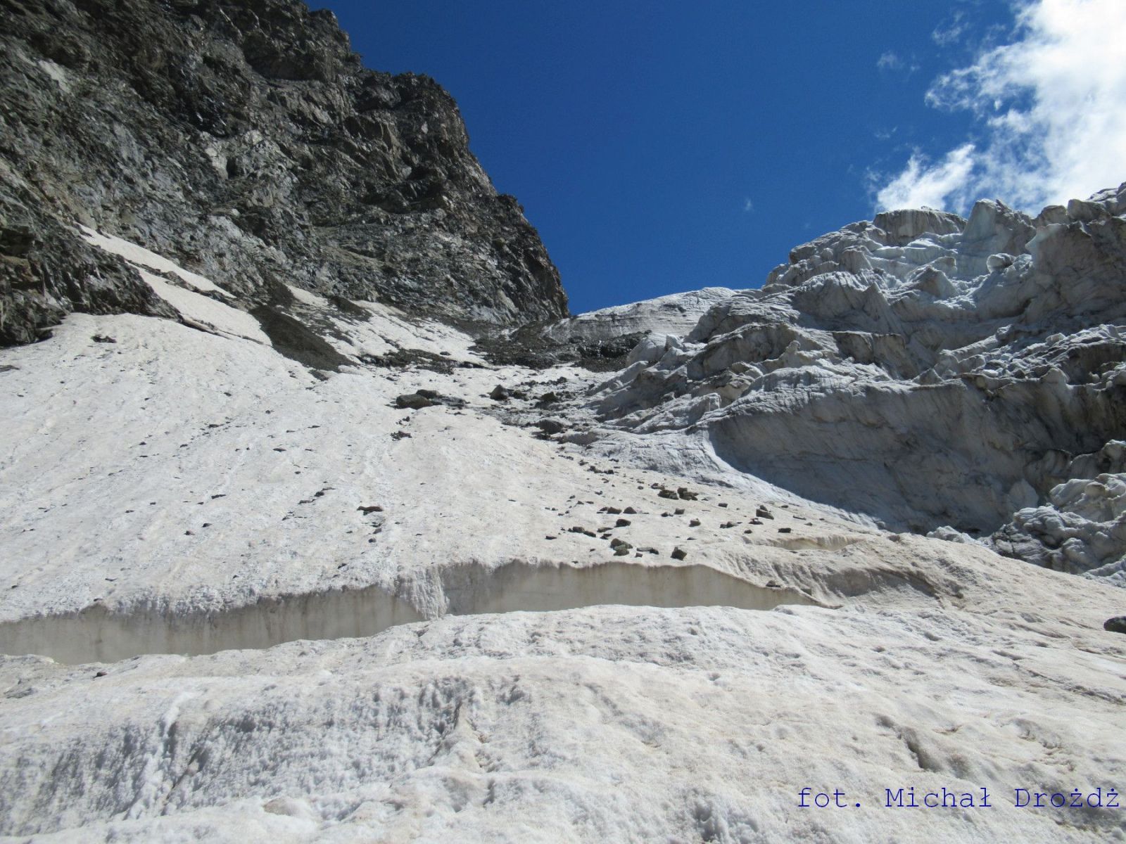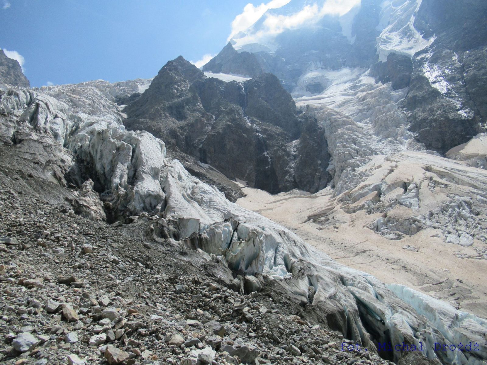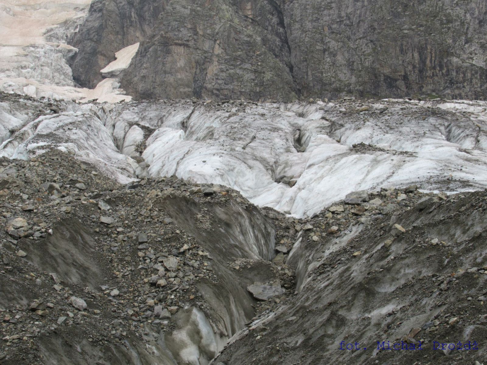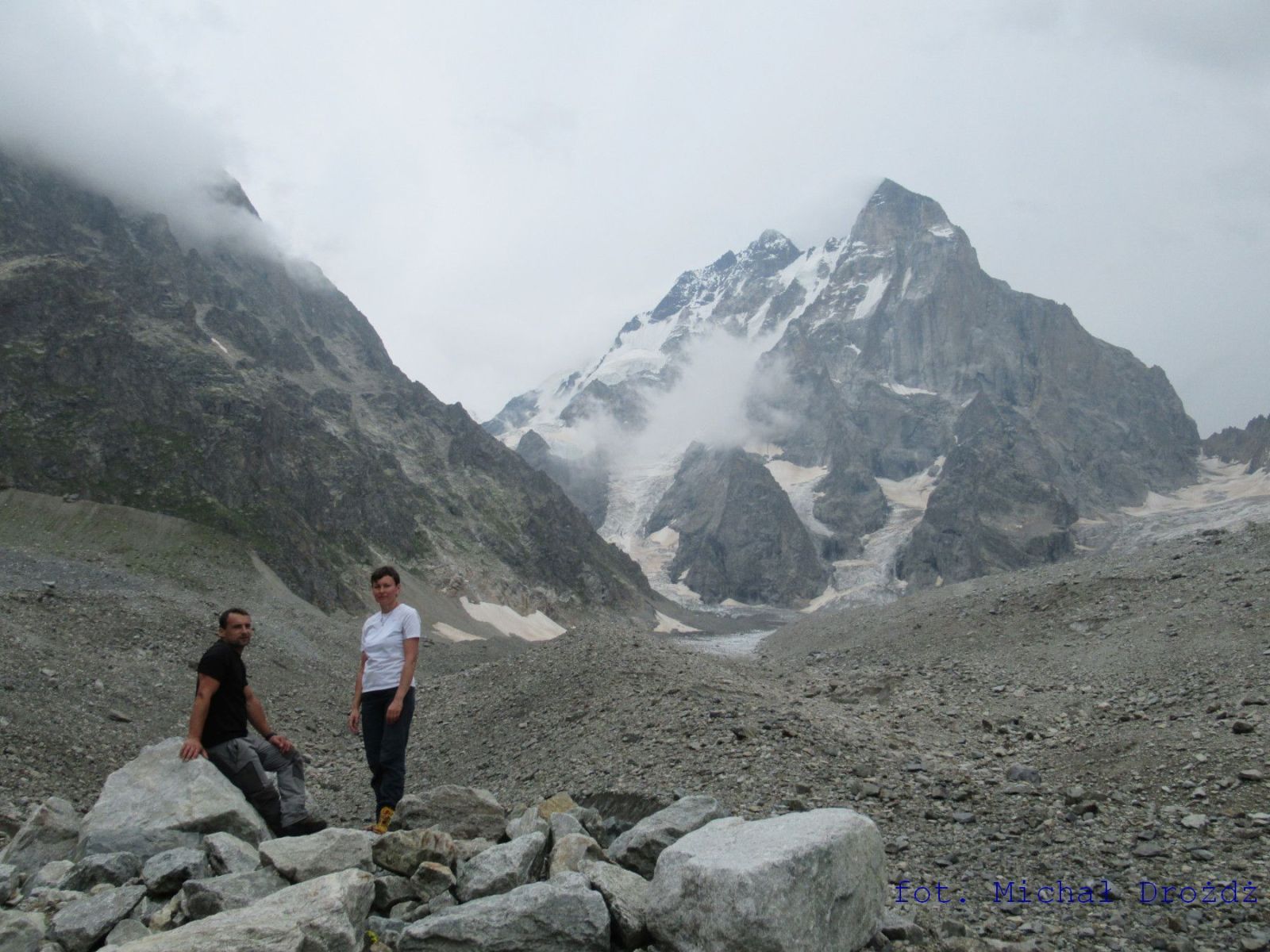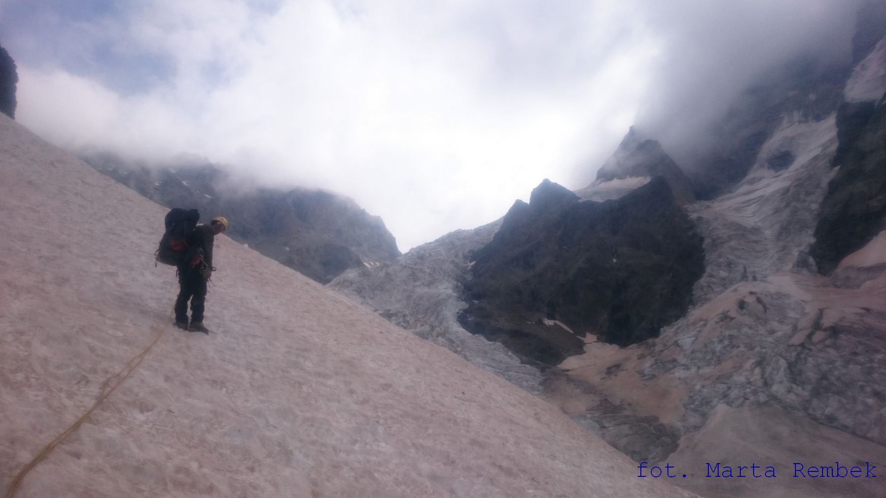 Kolejny dzień postawił przed nami poważniejsze wyzwanie – musieliśmy przejść przez Uszbijski Lodowiec i dotrzeć na znajdujące się powyżej niego plateu. We wszystkich relacjach i przewodnikowych opisach znajdowały się informacje, że jest on mocno uszczeliniony i ostrzegano przed kamieniami spadającymi z okolicznych ścian i szczytów. Dlatego zalecany jest start we wczesnych godzinach rannych, kiedy wszystko było jeszcze w miarę zmrożone. Ze względu na opisane wyżej zagrożenia odradzane było robienie jakichkolwiek postojów na lodowcu. Wystartowaliśmy idąc kamienistym terenem, a następnie weszliśmy na dwa śnieżne pola przedzielone piarżystymi zboczami. Cały czas siąpił deszcz, a wierzchołek Uszby w dalszym ciągu był schowany za gęstymi chmurami. W końcu, po wspięciu się na lodowy prożek znaleźliśmy się na Uszbijskim Lodowcu (Lodospadzie). Był on jedną wielką plątaniną szczelin. Cały był pokryty drobnymi kamyczkami, które uniemożliwiały porządne wbijanie raków w lód. Z kolei zdjęcie raków i poruszanie się w samych butach nie wchodziło w rachubę – było na to zdecydowanie za ślisko. Na lodowiec weszliśmy podchodząc jego lewą stroną, a następnie kluczyliśmy wśród szczelin starając znaleźć właściwą drogę w tym labiryncie. Później zostało nam już tylko wejście długim śnieżnym zboczem, a następnie trawers po przykrytym drobnym żwirem lodzie i w końcu wyszliśmy na rozległe śnieżne plateu. Na jego drugim końcu znajdowało się coś w rodzaju skalnej wyspy, na której znajdowało się kilka platform pod namioty. I tam też zdecydowaliśmy się założyć kolejny obóz. Szczęśliwie po raz kolejny udało nam się znaleźć niewielki strumień płynący po lodowcu, co uchroniło nas przed długotrwałym topieniem śniegu. Niestety w dalszym ciągu padało: w ciągu dnia deszcz, a wieczorem gęsty śnieg.