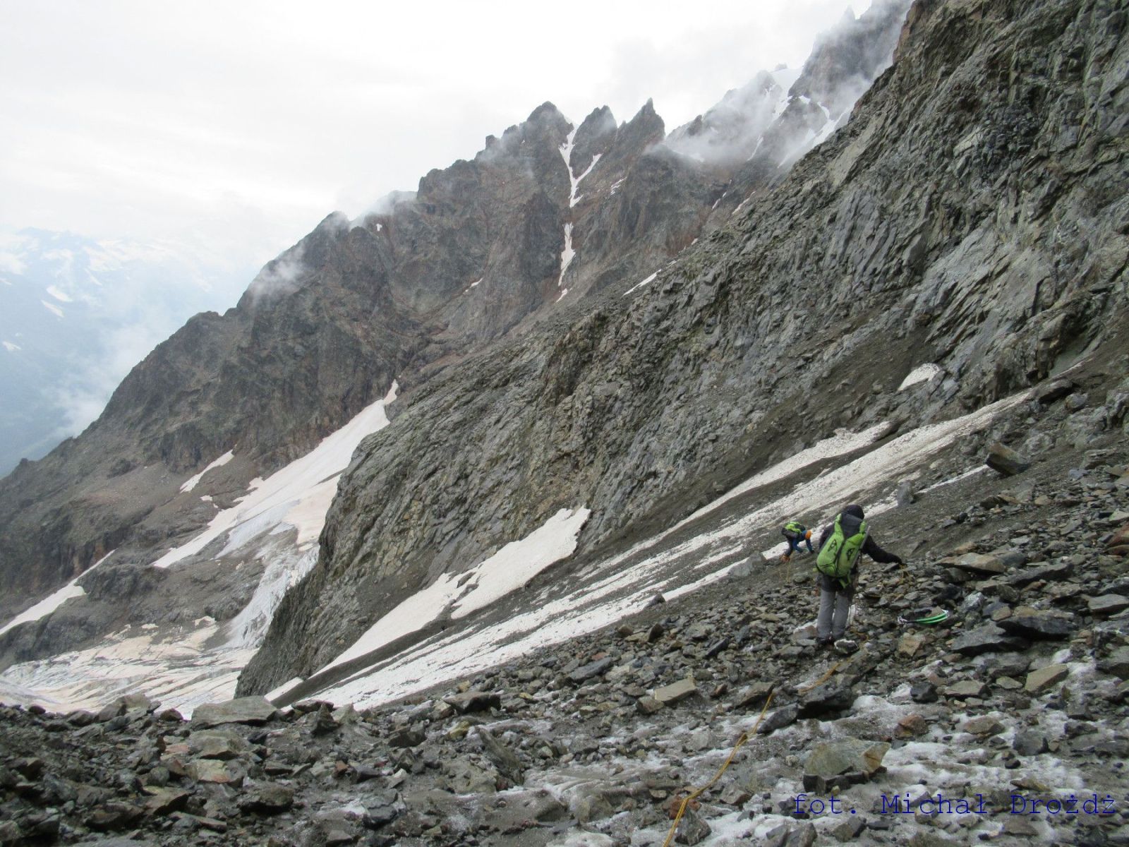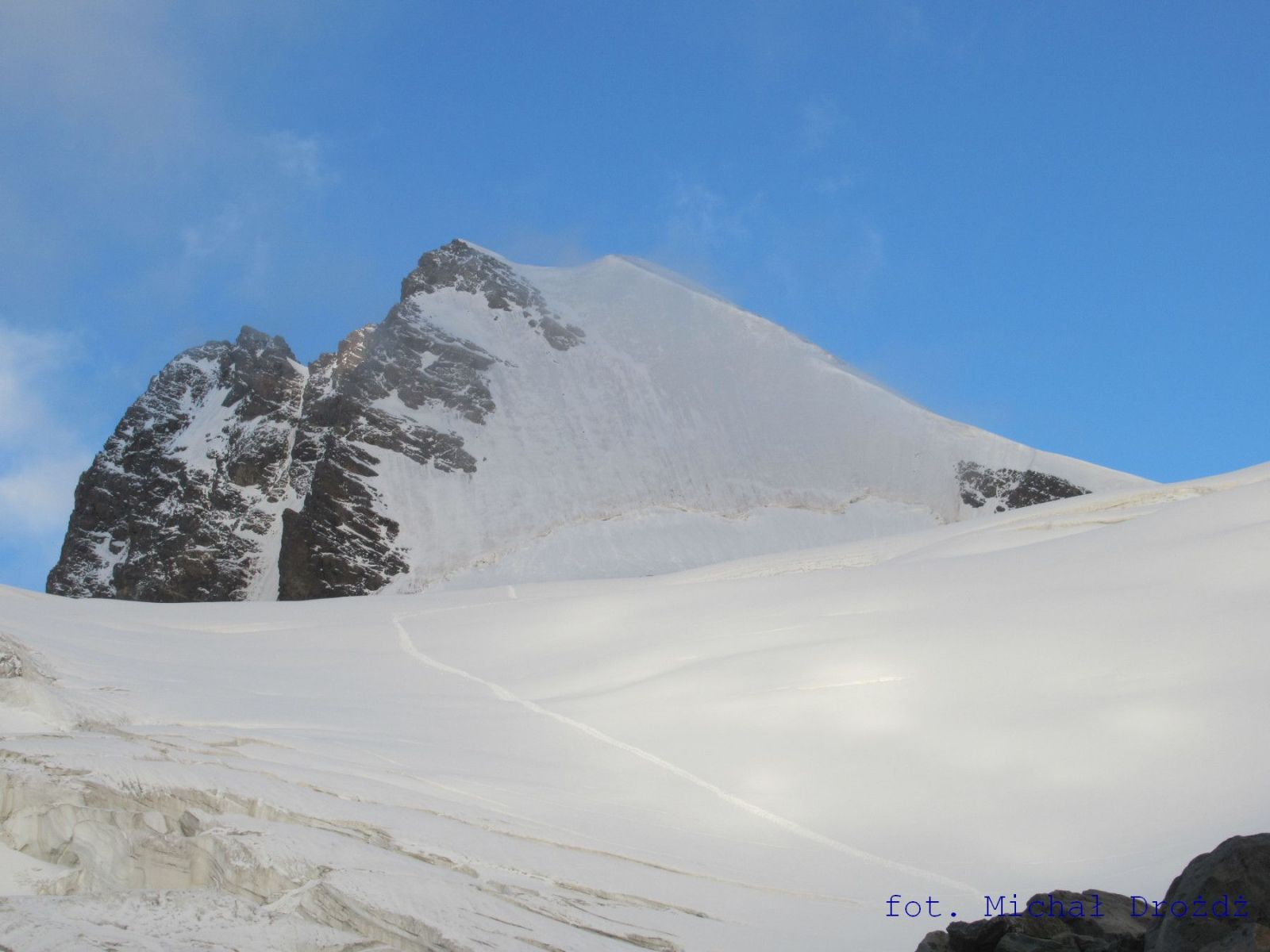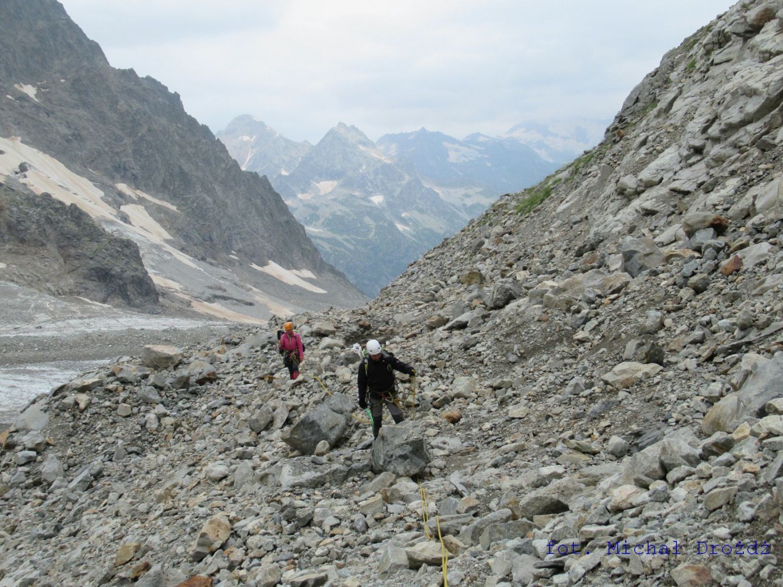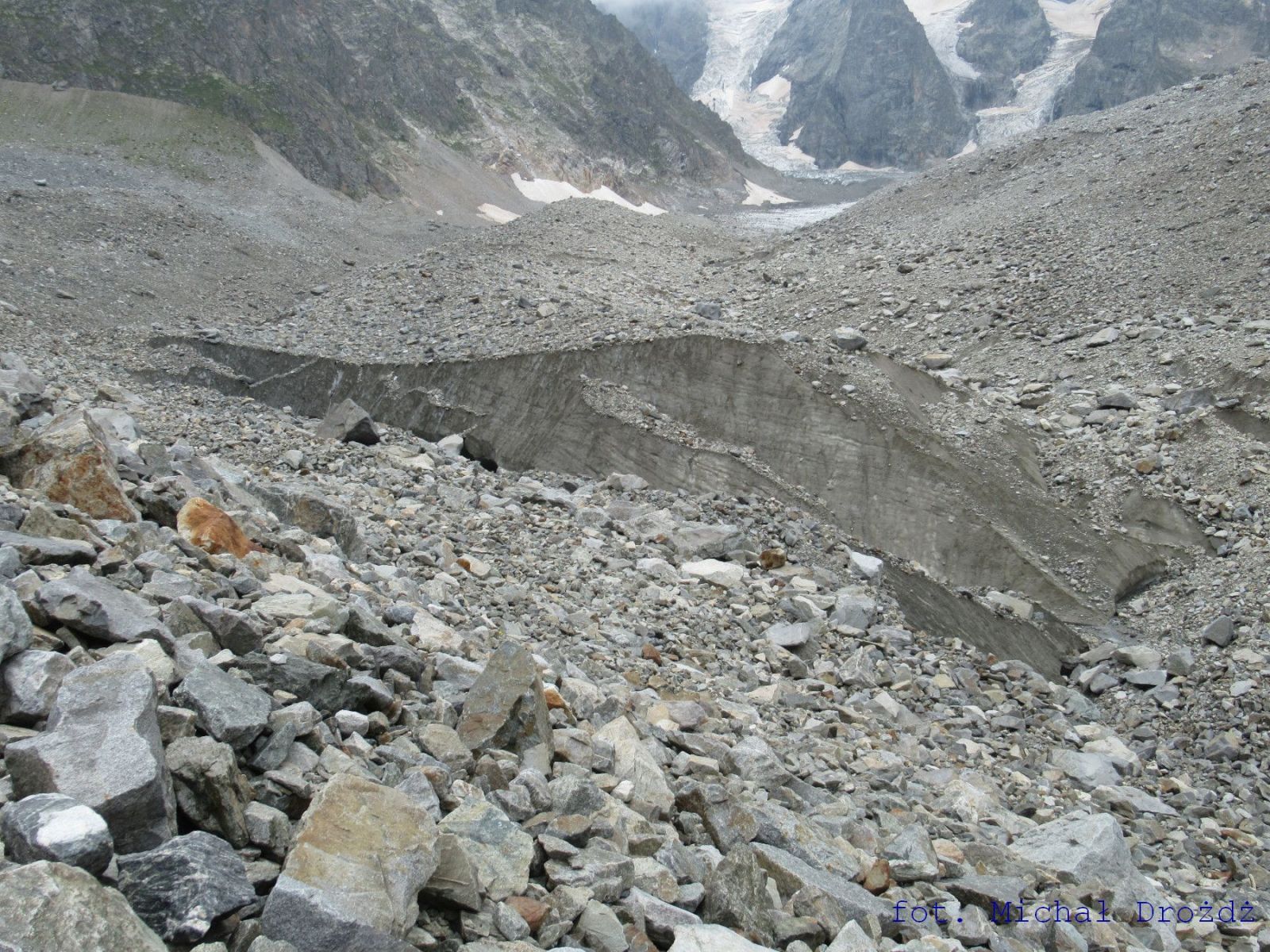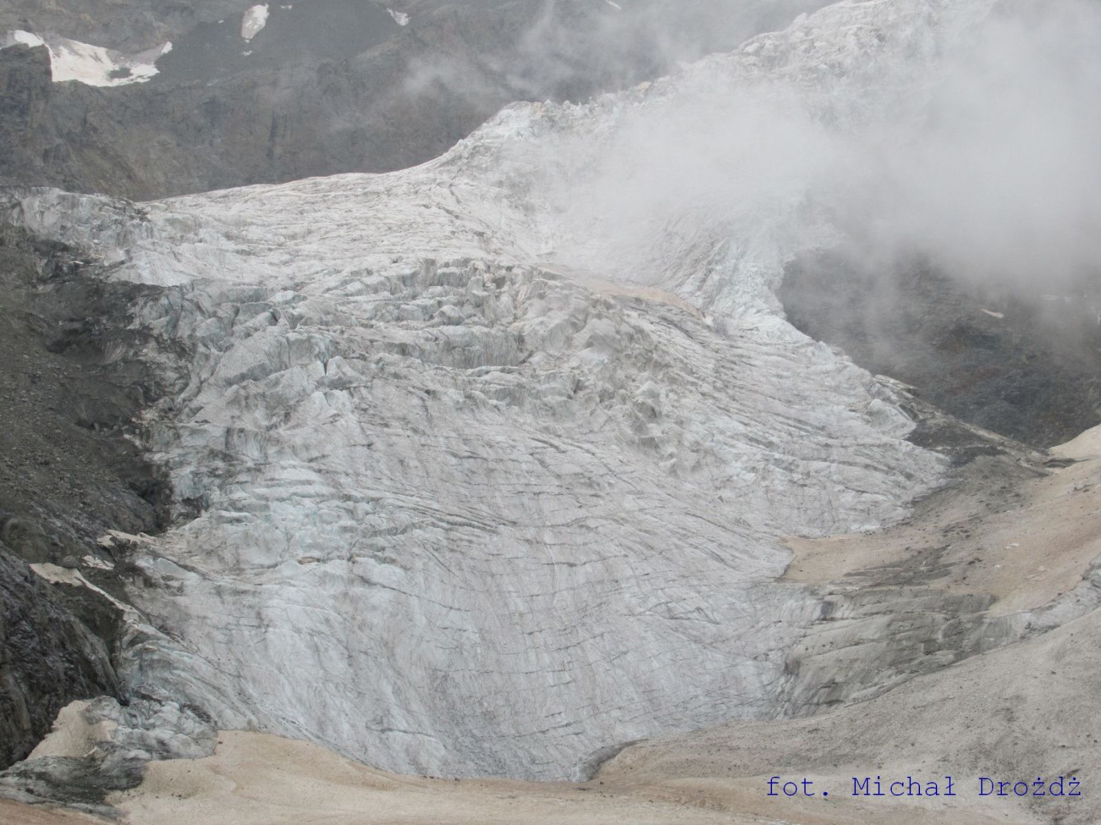 Kolejny dzień postawił przed nami poważniejsze wyzwanie – musieliśmy przejść przez Uszbijski Lodowiec i dotrzeć na znajdujące się powyżej niego plateu. We wszystkich relacjach i przewodnikowych opisach znajdowały się informacje, że jest on mocno uszczeliniony i ostrzegano przed kamieniami spadającymi z okolicznych ścian i szczytów. Dlatego zalecany jest start we wczesnych godzinach rannych, kiedy wszystko było jeszcze w miarę zmrożone. Ze względu na opisane wyżej zagrożenia odradzane było robienie jakichkolwiek postojów na lodowcu. Wystartowaliśmy idąc kamienistym terenem, a następnie weszliśmy na dwa śnieżne pola przedzielone piarżystymi zboczami. Cały czas siąpił deszcz, a wierzchołek Uszby w dalszym ciągu był schowany za gęstymi chmurami. W końcu, po wspięciu się na lodowy prożek znaleźliśmy się na Uszbijskim Lodowcu (Lodospadzie). Był on jedną wielką plątaniną szczelin. Cały był pokryty drobnymi kamyczkami, które uniemożliwiały porządne wbijanie raków w lód. Z kolei zdjęcie raków i poruszanie się w samych butach nie wchodziło w rachubę – było na to zdecydowanie za ślisko. Na lodowiec weszliśmy podchodząc jego lewą stroną, a następnie kluczyliśmy wśród szczelin starając znaleźć właściwą drogę w tym labiryncie. Później zostało nam już tylko wejście długim śnieżnym zboczem, a następnie trawers po przykrytym drobnym żwirem lodzie i w końcu wyszliśmy na rozległe śnieżne plateu. Na jego drugim końcu znajdowało się coś w rodzaju skalnej wyspy, na której znajdowało się kilka platform pod namioty. I tam też zdecydowaliśmy się założyć kolejny obóz. Szczęśliwie po raz kolejny udało nam się znaleźć niewielki strumień płynący po lodowcu, co uchroniło nas przed długotrwałym topieniem śniegu. Niestety w dalszym ciągu padało: w ciągu dnia deszcz, a wieczorem gęsty śnieg.