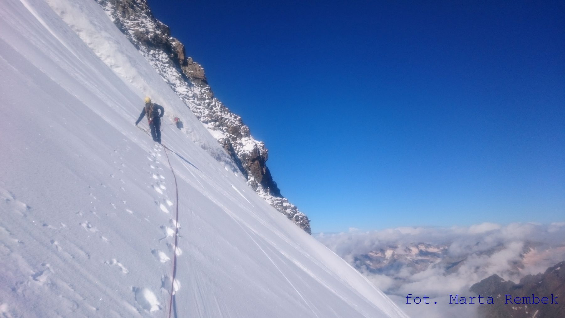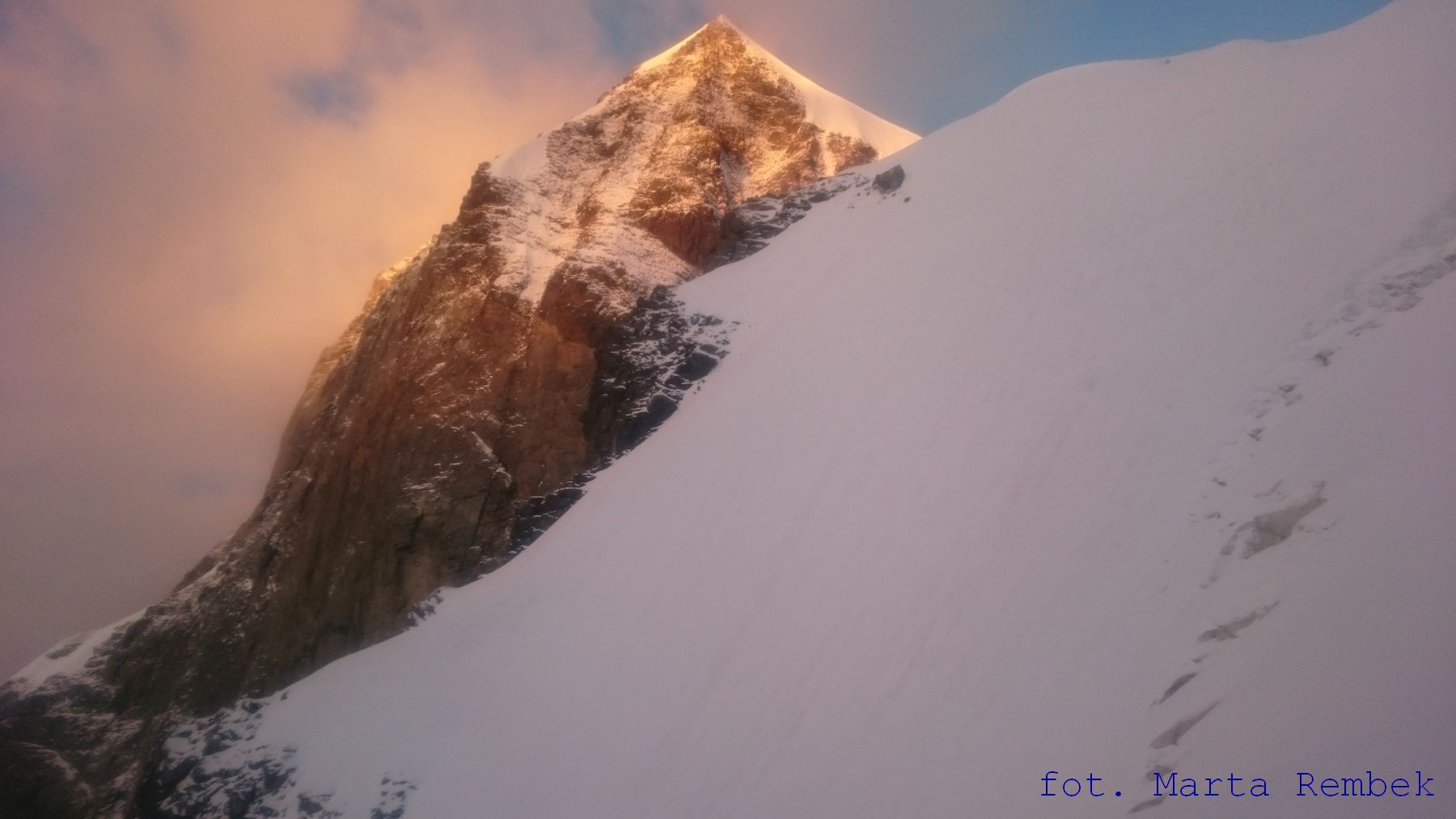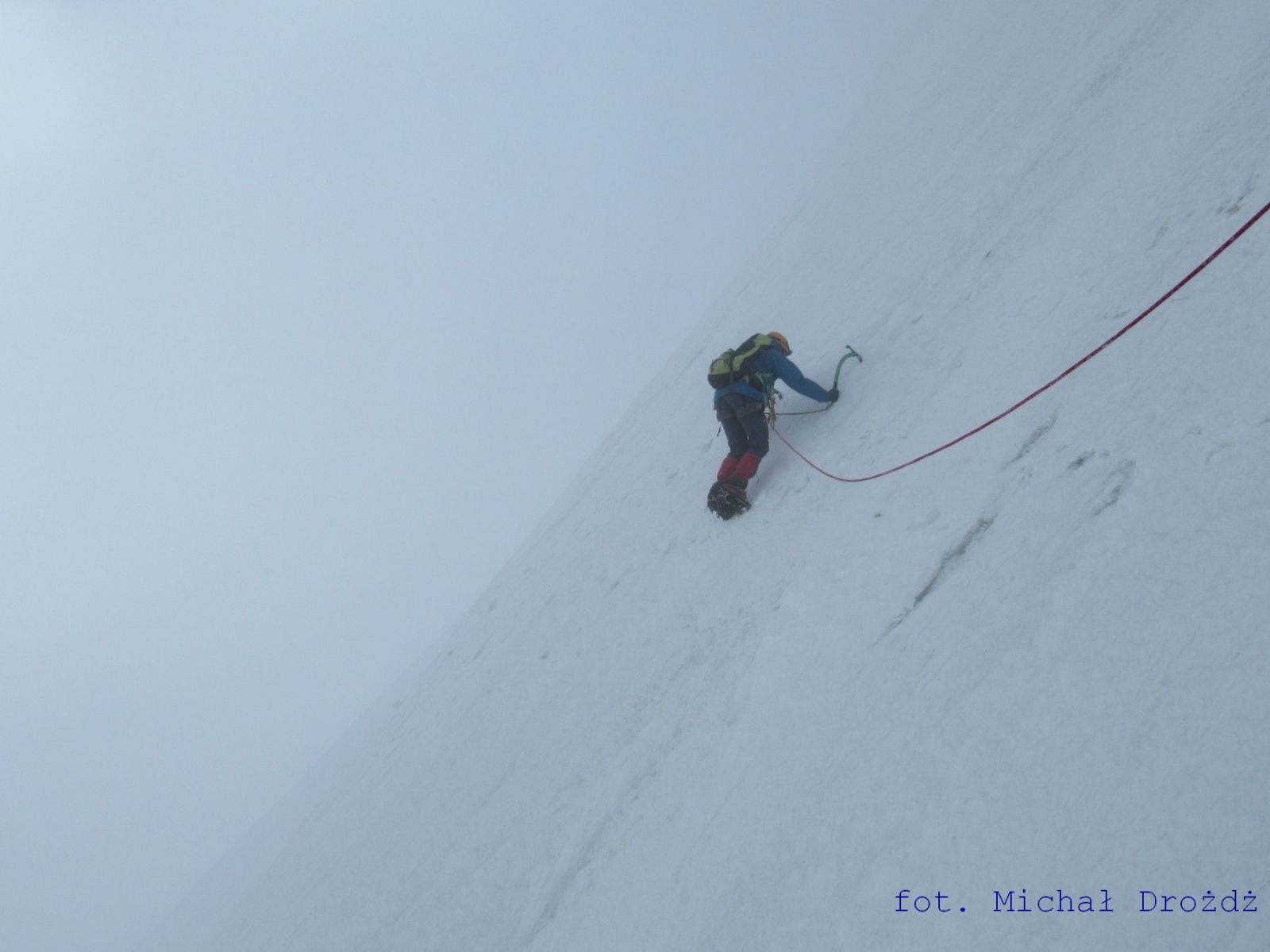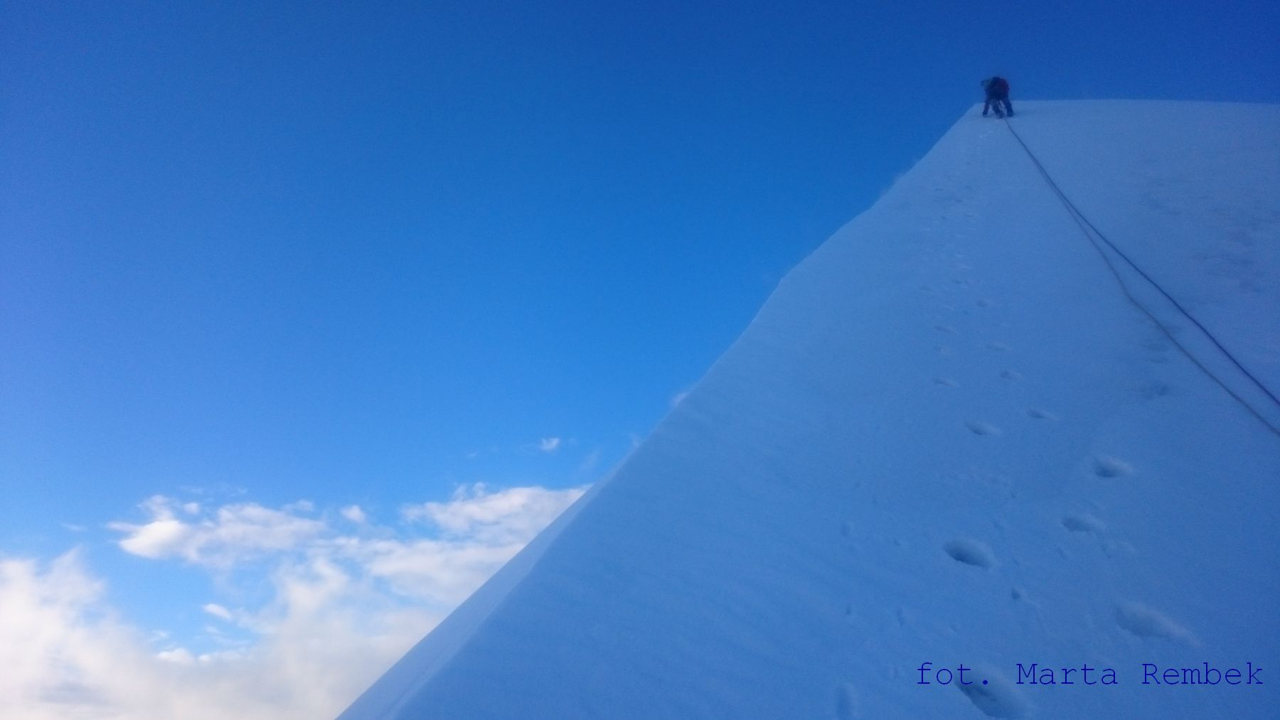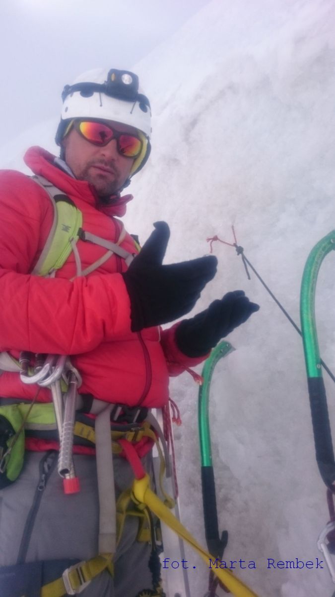 Niespodziewanie jednak po porannej pobudce przed godziną czwartą naszym oczom ukazało się niebo pełne gwiazd, a na horyzoncie nie było widać ani jednej chmury. Chcąc, nie chcąc zebraliśmy się i ruszyliśmy do ataku szczytowego. Po przejściu plateu skręciliśmy w prawo i zaczęliśmy trawers stromego pola śnieżnego. Szliśmy pod ogromnym serakiem nazywanym „Bolster”, a następnie wspięliśmy się na niego. Wspinaliśmy się dalej nachylonym pod kątem około 70 stopni śnieżnym zboczem w kierunku tzw. Uszba Pillow położonej na wysokości 4234 m n.p.m. Tutaj teren chwilowo się wypłaszczył, a my szliśmy dalej w kierunku Uszbijskiego Lodospadu i Skał Nastenki. Żeby tam dotrzeć trzeba było przetrawersować kolejne strome zbocze, nad którym znajdował się ogromny śnieżny nawis. Postanowiliśmy nie ryzykować przechodzenia tego miejsca na lotnej i przed wejściem w trawers założyliśmy stanowisko z czekanów, a na samym zboczu zakładaliśmy przeloty z szabli śnieżnych. Kolejne stanowisko powstało pod lodowym, dwumetrowym prożkiem. Lód był fatalnej jakości i pomimo, że nasze stanowisko było zbudowane z pięciu punktów to wcale nie czuliśmy się w nim zbyt pewnie. Po pokonaniu prożka czekał nas kolejny trawers po nieasekurowalnym lodzie (wkręcone śruby lodowe można było wyjąć jednym palcem, z kolei szabli śnieżnych nie można było wbić) do skał, gdzie Kuba założył kolejny stan. I w tym miejscu zaczęliśmy się zastanawiać nad sensem dalszej wspinaczki w tych warunkach. Temperatura była już na plusie, a na lodospadzie nie można było założyć żadnej asekuracji. Teoretycznie można było iść jeszcze bardziej na prawo, po skalnym terenie (widzieliśmy tam nawet jakieś stanowisko 30-40 metrów nad nami), ale był on bardzo kruchy i co chwilę spadały tamtędy kamienie. Zapewne wszystko wyglądałoby dużo lepiej chociaż przy minimalnym mrozie. Podjęcie decyzji ułatwił kolejny spadający kamień wielkości piłki do koszykówki, który przeleciał metr obok od naszych głów. Wracamy!