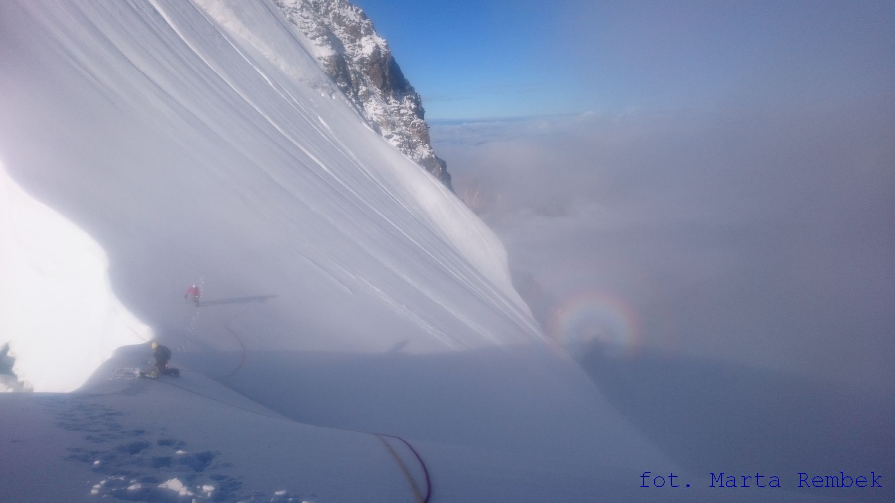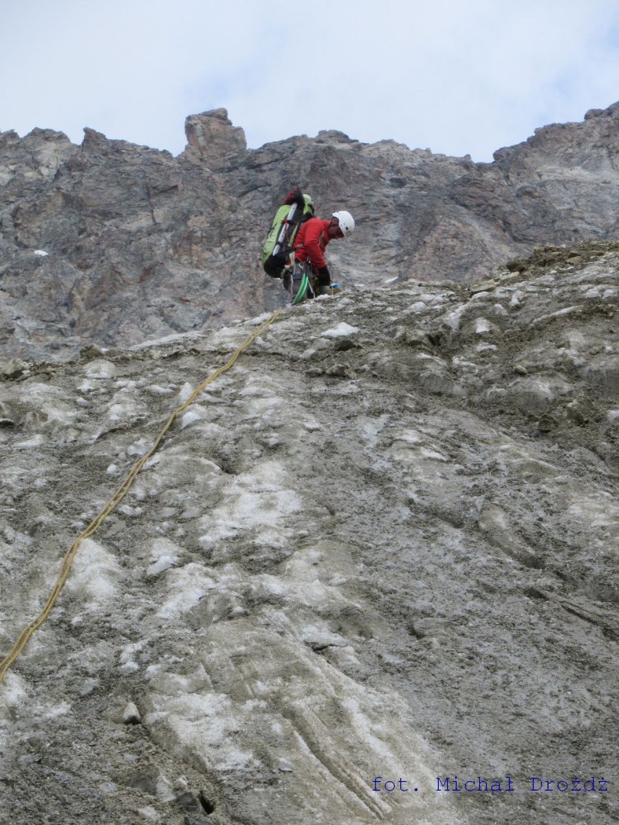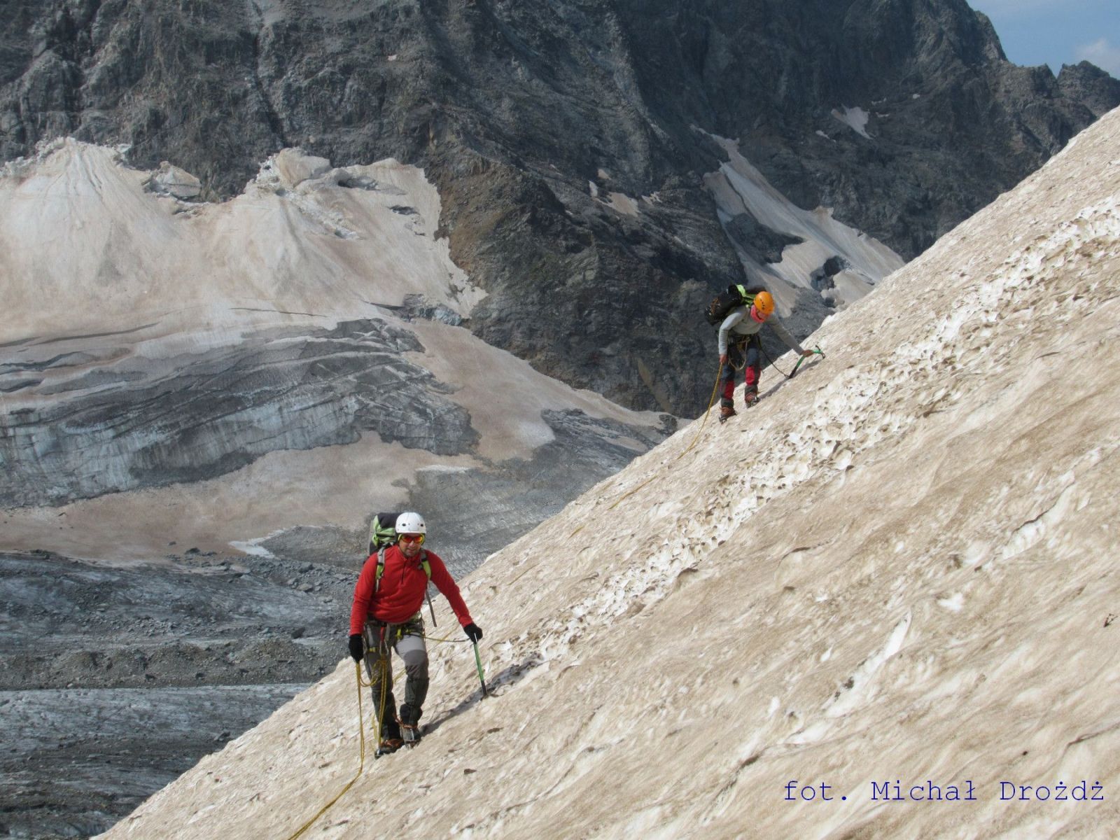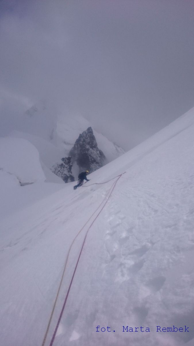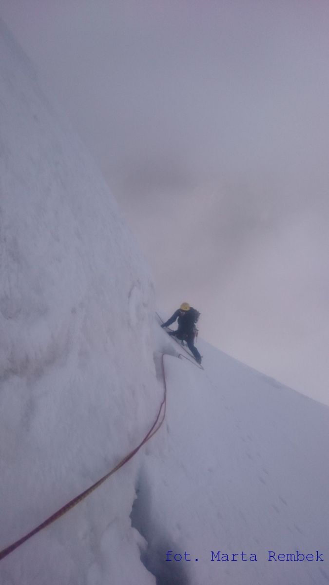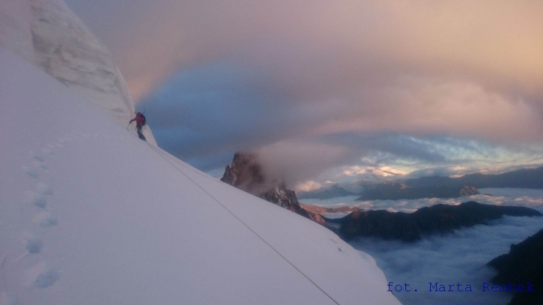 Niespodziewanie jednak po porannej pobudce przed godziną czwartą naszym oczom ukazało się niebo pełne gwiazd, a na horyzoncie nie było widać ani jednej chmury. Chcąc, nie chcąc zebraliśmy się i ruszyliśmy do ataku szczytowego. Po przejściu plateu skręciliśmy w prawo i zaczęliśmy trawers stromego pola śnieżnego. Szliśmy pod ogromnym serakiem nazywanym „Bolster”, a następnie wspięliśmy się na niego. Wspinaliśmy się dalej nachylonym pod kątem około 70 stopni śnieżnym zboczem w kierunku tzw. Uszba Pillow położonej na wysokości 4234 m n.p.m. Tutaj teren chwilowo się wypłaszczył, a my szliśmy dalej w kierunku Uszbijskiego Lodospadu i Skał Nastenki. Żeby tam dotrzeć trzeba było przetrawersować kolejne strome zbocze, nad którym znajdował się ogromny śnieżny nawis. Postanowiliśmy nie ryzykować przechodzenia tego miejsca na lotnej i przed wejściem w trawers założyliśmy stanowisko z czekanów, a na samym zboczu zakładaliśmy przeloty z szabli śnieżnych. Kolejne stanowisko powstało pod lodowym, dwumetrowym prożkiem. Lód był fatalnej jakości i pomimo, że nasze stanowisko było zbudowane z pięciu punktów to wcale nie czuliśmy się w nim zbyt pewnie. Po pokonaniu prożka czekał nas kolejny trawers po nieasekurowalnym lodzie (wkręcone śruby lodowe można było wyjąć jednym palcem, z kolei szabli śnieżnych nie można było wbić) do skał, gdzie Kuba założył kolejny stan. I w tym miejscu zaczęliśmy się zastanawiać nad sensem dalszej wspinaczki w tych warunkach. Temperatura była już na plusie, a na lodospadzie nie można było założyć żadnej asekuracji. Teoretycznie można było iść jeszcze bardziej na prawo, po skalnym terenie (widzieliśmy tam nawet jakieś stanowisko 30-40 metrów nad nami), ale był on bardzo kruchy i co chwilę spadały tamtędy kamienie. Zapewne wszystko wyglądałoby dużo lepiej chociaż przy minimalnym mrozie. Podjęcie decyzji ułatwił kolejny spadający kamień wielkości piłki do koszykówki, który przeleciał metr obok od naszych głów. Wracamy!
