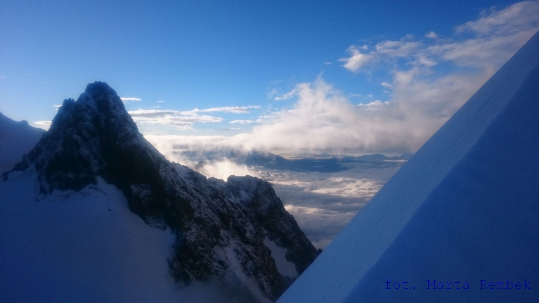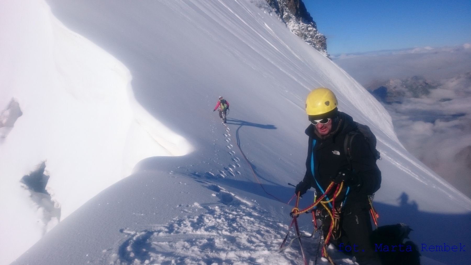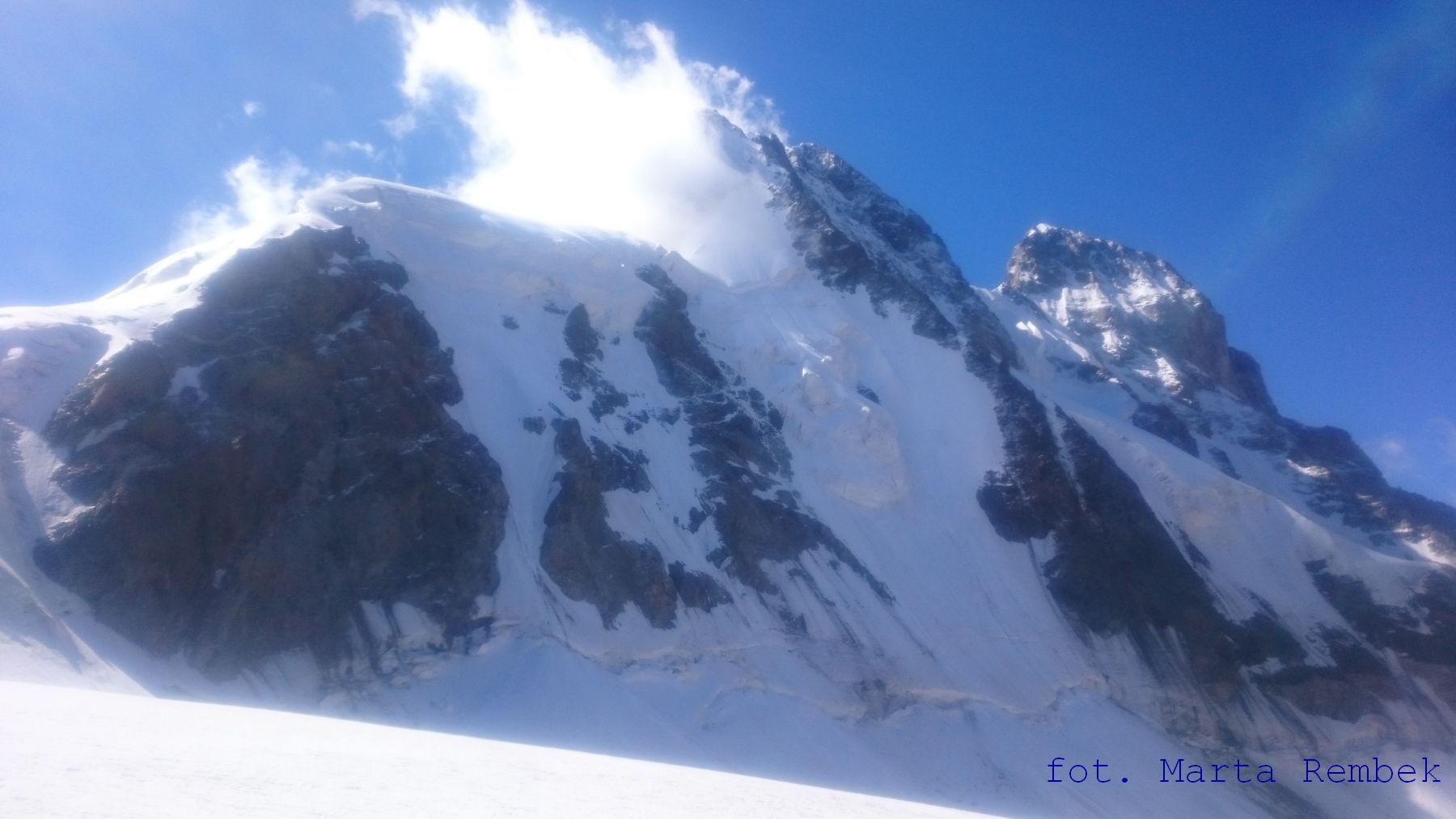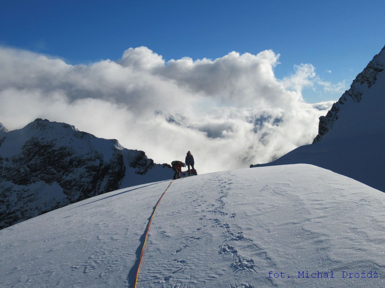 Niespodziewanie jednak po porannej pobudce przed godziną czwartą naszym oczom ukazało się niebo pełne gwiazd, a na horyzoncie nie było widać ani jednej chmury. Chcąc, nie chcąc zebraliśmy się i ruszyliśmy do ataku szczytowego. Po przejściu plateu skręciliśmy w prawo i zaczęliśmy trawers stromego pola śnieżnego. Szliśmy pod ogromnym serakiem nazywanym „Bolster”, a następnie wspięliśmy się na niego. Wspinaliśmy się dalej nachylonym pod kątem około 70 stopni śnieżnym zboczem w kierunku tzw. Uszba Pillow położonej na wysokości 4234 m n.p.m. Tutaj teren chwilowo się wypłaszczył, a my szliśmy dalej w kierunku Uszbijskiego Lodospadu i Skał Nastenki. Żeby tam dotrzeć trzeba było przetrawersować kolejne strome zbocze, nad którym znajdował się ogromny śnieżny nawis. Postanowiliśmy nie ryzykować przechodzenia tego miejsca na lotnej i przed wejściem w trawers założyliśmy stanowisko z czekanów, a na samym zboczu zakładaliśmy przeloty z szabli śnieżnych. Kolejne stanowisko powstało pod lodowym, dwumetrowym prożkiem. Lód był fatalnej jakości i pomimo, że nasze stanowisko było zbudowane z pięciu punktów to wcale nie czuliśmy się w nim zbyt pewnie. Po pokonaniu prożka czekał nas kolejny trawers po nieasekurowalnym lodzie (wkręcone śruby lodowe można było wyjąć jednym palcem, z kolei szabli śnieżnych nie można było wbić) do skał, gdzie Kuba założył kolejny stan. I w tym miejscu zaczęliśmy się zastanawiać nad sensem dalszej wspinaczki w tych warunkach. Temperatura była już na plusie, a na lodospadzie nie można było założyć żadnej asekuracji. Teoretycznie można było iść jeszcze bardziej na prawo, po skalnym terenie (widzieliśmy tam nawet jakieś stanowisko 30-40 metrów nad nami), ale był on bardzo kruchy i co chwilę spadały tamtędy kamienie. Zapewne wszystko wyglądałoby dużo lepiej chociaż przy minimalnym mrozie. Podjęcie decyzji ułatwił kolejny spadający kamień wielkości piłki do koszykówki, który przeleciał metr obok od naszych głów. Wracamy!