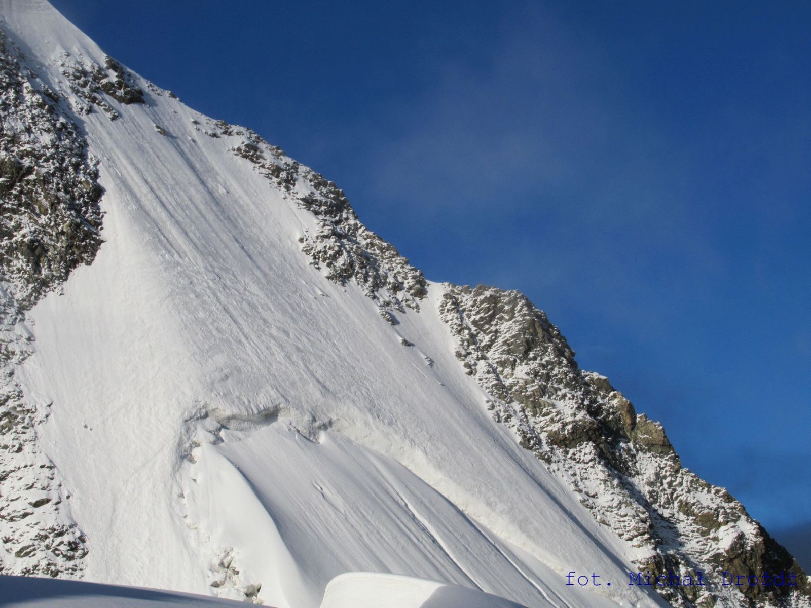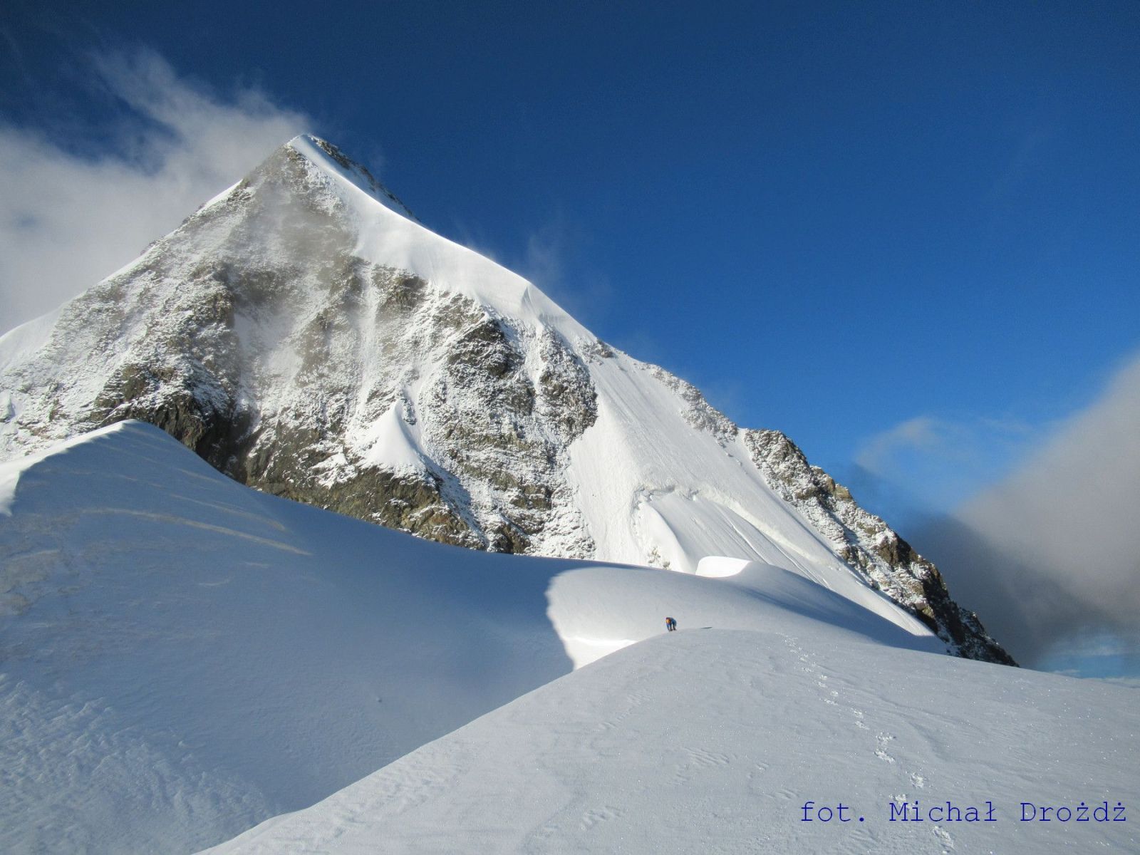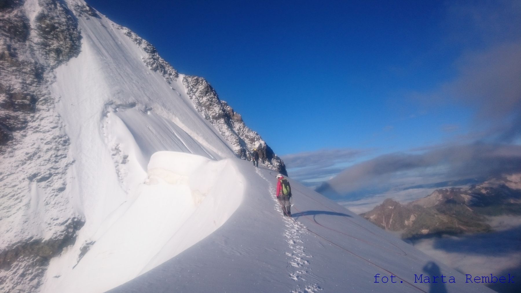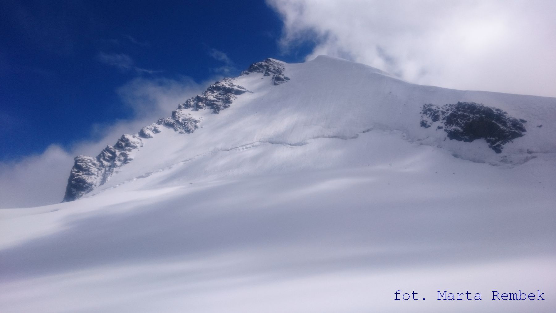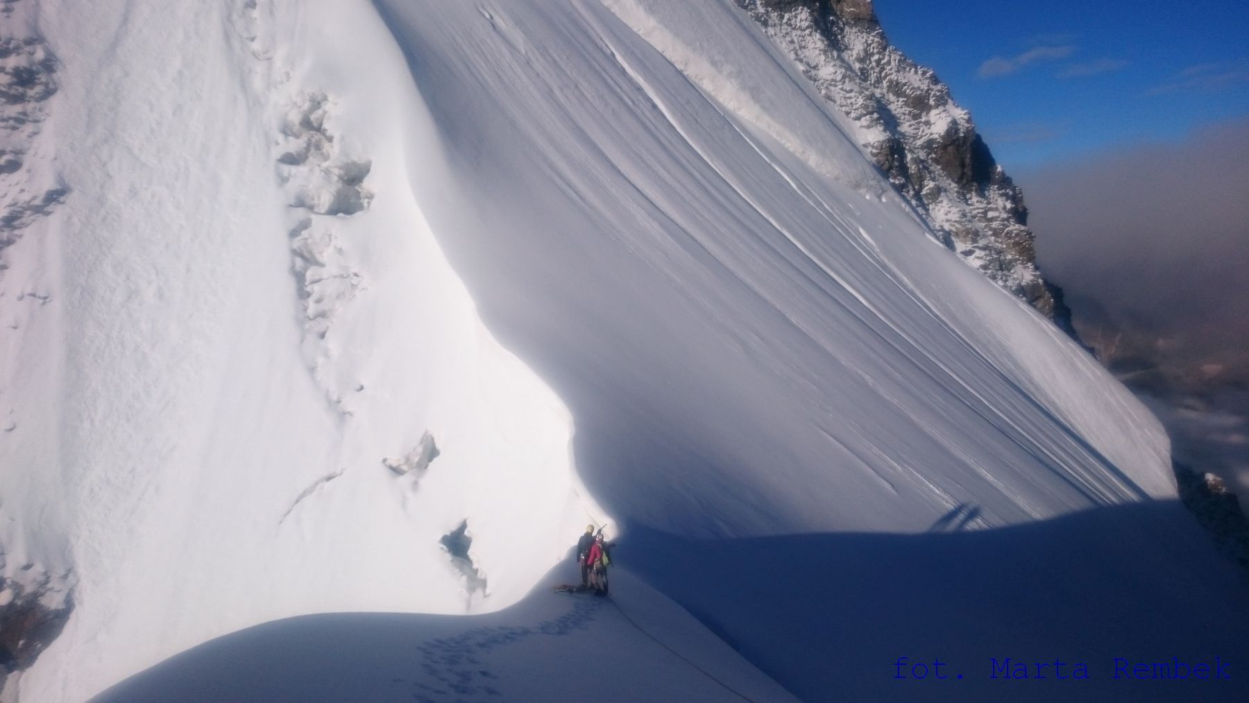 Niespodziewanie jednak po porannej pobudce przed godziną czwartą naszym oczom ukazało się niebo pełne gwiazd, a na horyzoncie nie było widać ani jednej chmury. Chcąc, nie chcąc zebraliśmy się i ruszyliśmy do ataku szczytowego. Po przejściu plateu skręciliśmy w prawo i zaczęliśmy trawers stromego pola śnieżnego. Szliśmy pod ogromnym serakiem nazywanym „Bolster”, a następnie wspięliśmy się na niego. Wspinaliśmy się dalej nachylonym pod kątem około 70 stopni śnieżnym zboczem w kierunku tzw. Uszba Pillow położonej na wysokości 4234 m n.p.m. Tutaj teren chwilowo się wypłaszczył, a my szliśmy dalej w kierunku Uszbijskiego Lodospadu i Skał Nastenki. Żeby tam dotrzeć trzeba było przetrawersować kolejne strome zbocze, nad którym znajdował się ogromny śnieżny nawis. Postanowiliśmy nie ryzykować przechodzenia tego miejsca na lotnej i przed wejściem w trawers założyliśmy stanowisko z czekanów, a na samym zboczu zakładaliśmy przeloty z szabli śnieżnych. Kolejne stanowisko powstało pod lodowym, dwumetrowym prożkiem. Lód był fatalnej jakości i pomimo, że nasze stanowisko było zbudowane z pięciu punktów to wcale nie czuliśmy się w nim zbyt pewnie. Po pokonaniu prożka czekał nas kolejny trawers po nieasekurowalnym lodzie (wkręcone śruby lodowe można było wyjąć jednym palcem, z kolei szabli śnieżnych nie można było wbić) do skał, gdzie Kuba założył kolejny stan. I w tym miejscu zaczęliśmy się zastanawiać nad sensem dalszej wspinaczki w tych warunkach. Temperatura była już na plusie, a na lodospadzie nie można było założyć żadnej asekuracji. Teoretycznie można było iść jeszcze bardziej na prawo, po skalnym terenie (widzieliśmy tam nawet jakieś stanowisko 30-40 metrów nad nami), ale był on bardzo kruchy i co chwilę spadały tamtędy kamienie. Zapewne wszystko wyglądałoby dużo lepiej chociaż przy minimalnym mrozie. Podjęcie decyzji ułatwił kolejny spadający kamień wielkości piłki do koszykówki, który przeleciał metr obok od naszych głów. Wracamy!
