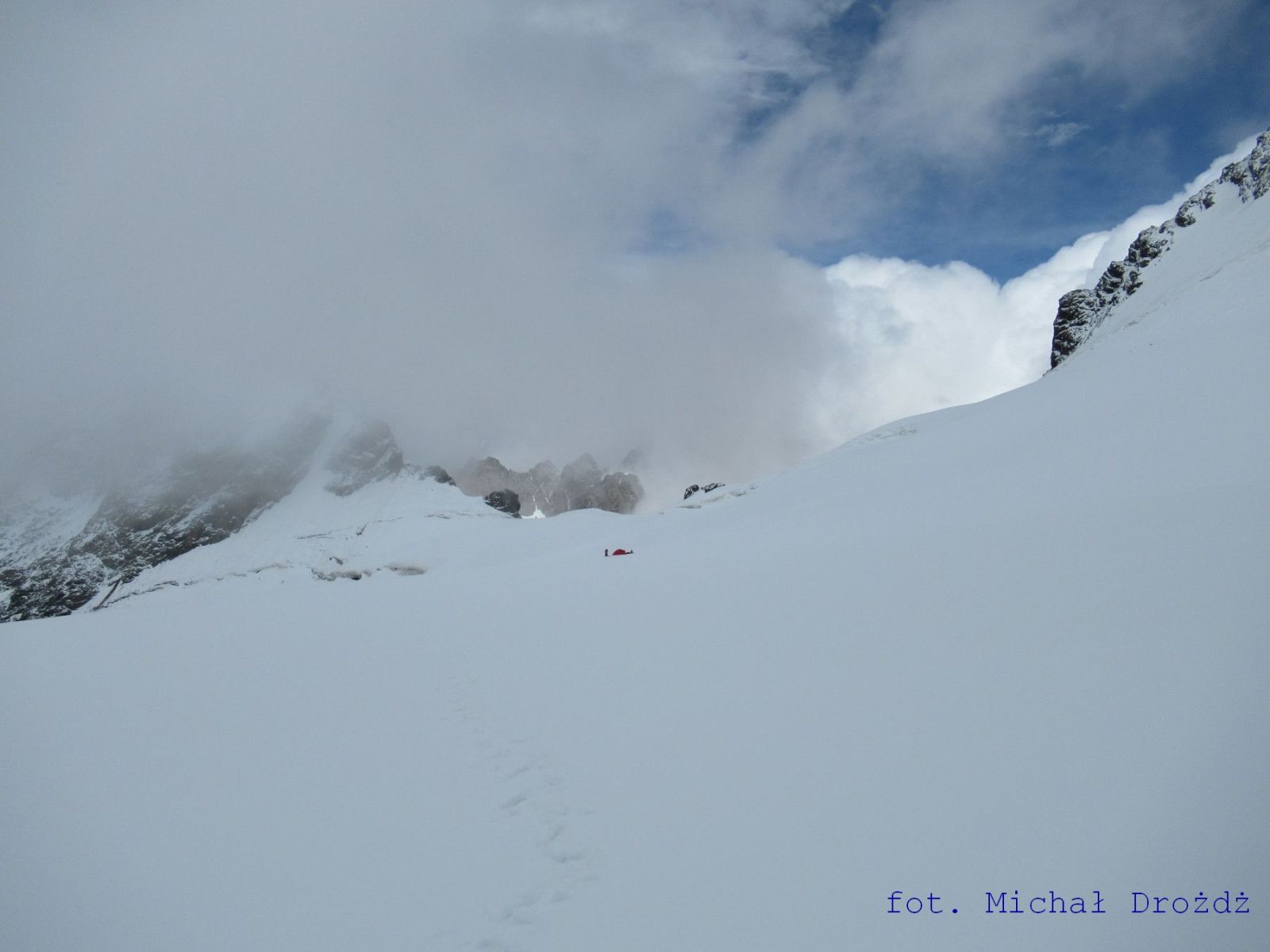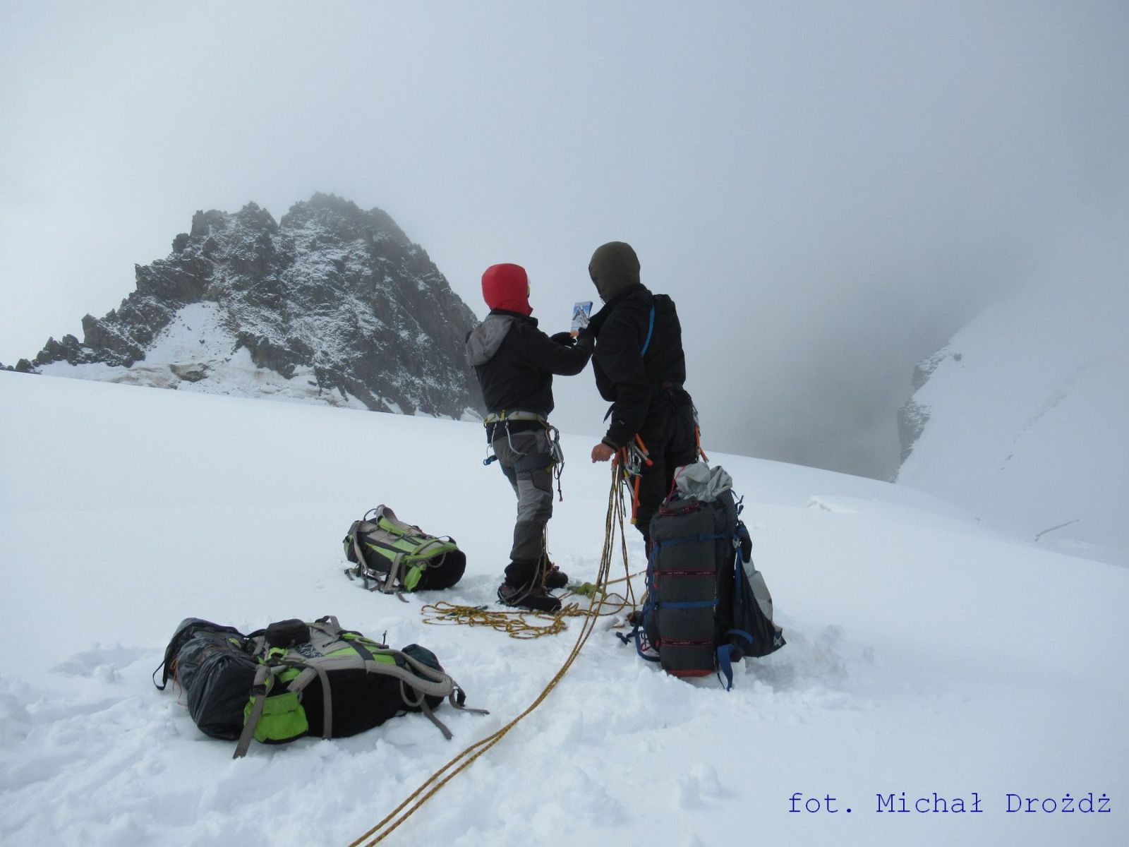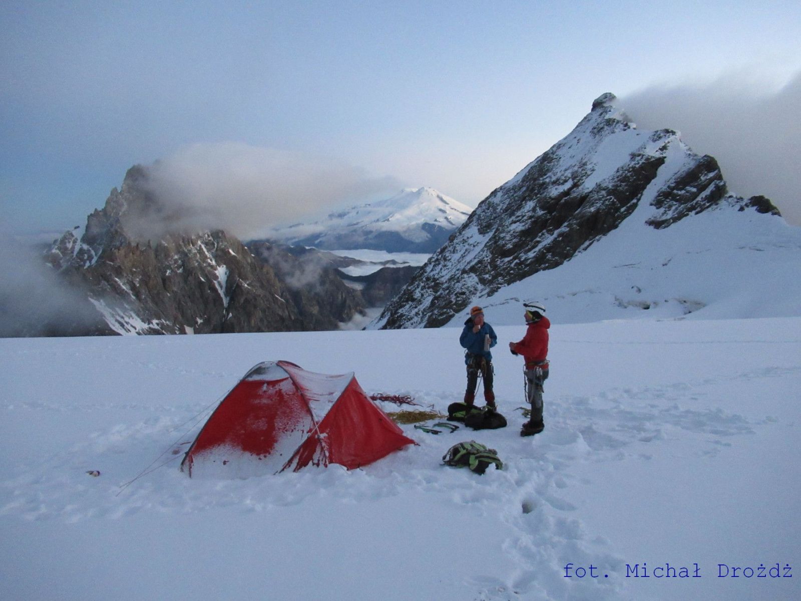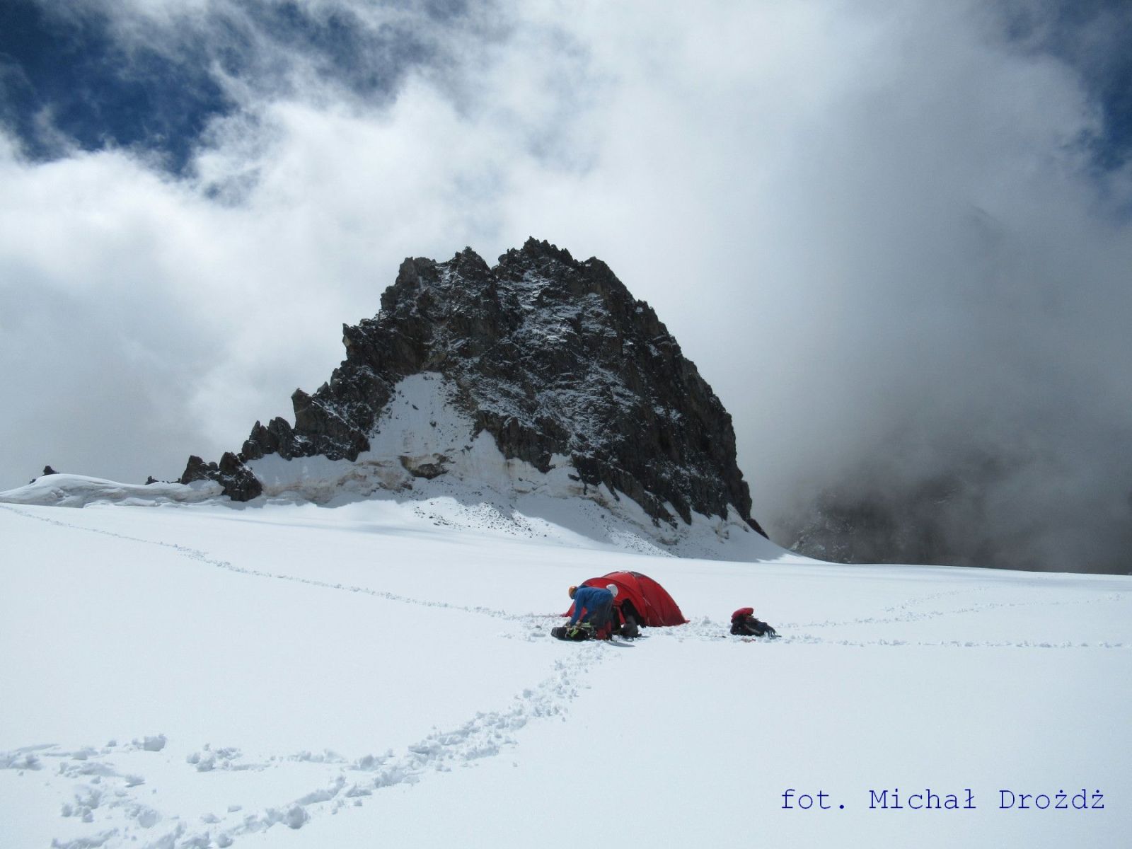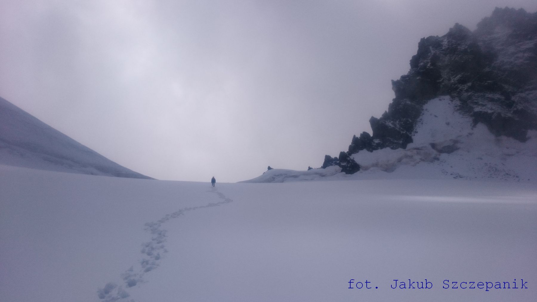 Kiedy wstaliśmy kolejnego dnia rano cała okolica była spowita gęstymi chmurami, a widoczność, nie licząc chwilowych przejaśnień, wynosiła maksymalnie dziesięć metrów. Mimo to ruszyliśmy w kierunku właściwego, położonego powyżej 4000 metrów (wg przewodnika 4070 m n.p.m.) Uszbijskiego Plateu, do którego brakowało nam około 150-200 metrów w pionie. Początkowo szliśmy śnieżnym ramieniem, na które wchodziło się wprost z obozu, a następnie skręciliśmy w lewo. Mieliśmy do przejścia kilka ogromnych szczelin, a znalezienie mostów śnieżnych i właściwej drogi przy takiej widoczności nie było łatwe. Chwilowe przejaśnienia wykorzystywaliśmy do określenia swojego położenia na lodowcu. Orientację w takich momentach ułatwiały wyłaniające się zza chmur wierzchołki Chatynia i Piku Shchurovskiego. Ostatecznie jakoś dotarliśmy na miejsce i rozstawiliśmy namiot na Uszbijskim Plateu. Tym razem wodę do gotowania musieliśmy już topić ze śniegu. Późnym popołudniem, ku naszej ogromnej frustracji znowu zaczął padać gęsty śnieg. Opad trwał do godziny trzeciej nad ranem co nieco zachwiało nasza wiarę w możliwość przeprowadzenia tego dnia ataku szczytowego.