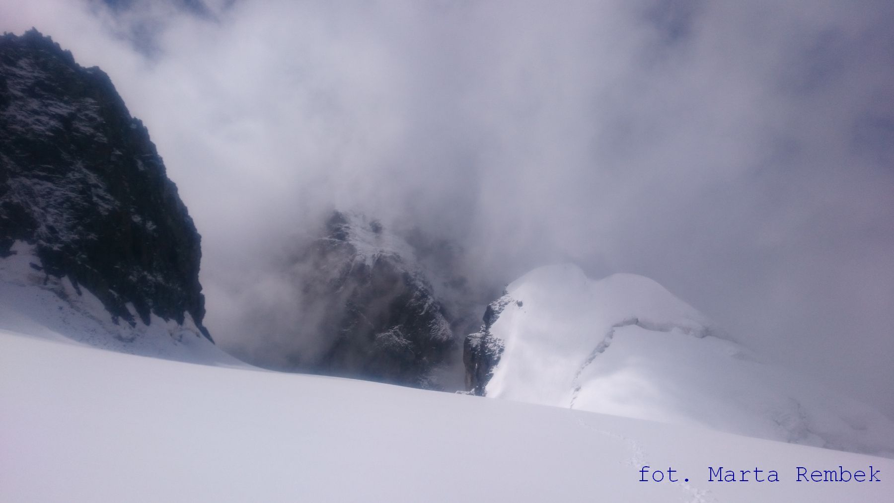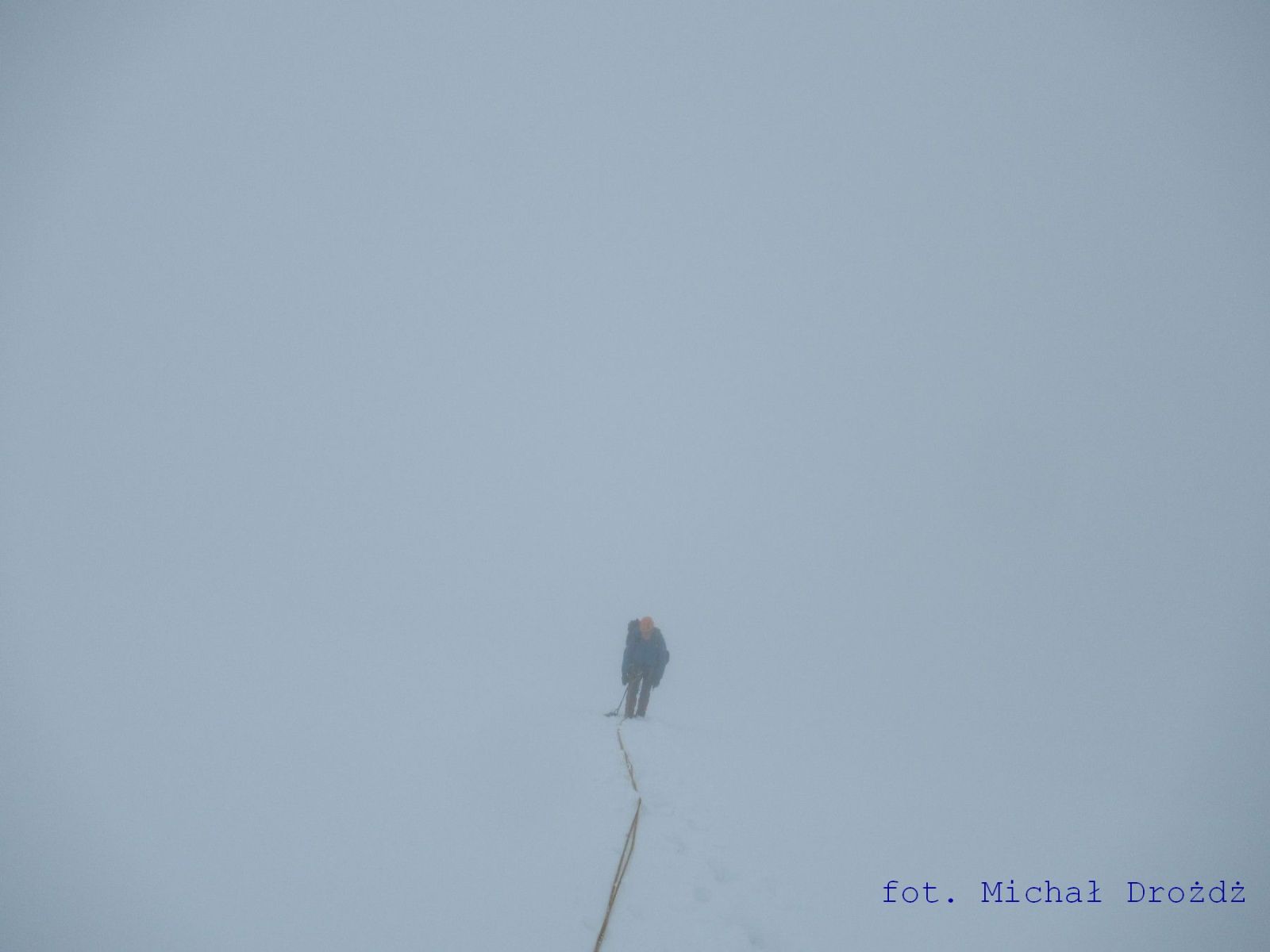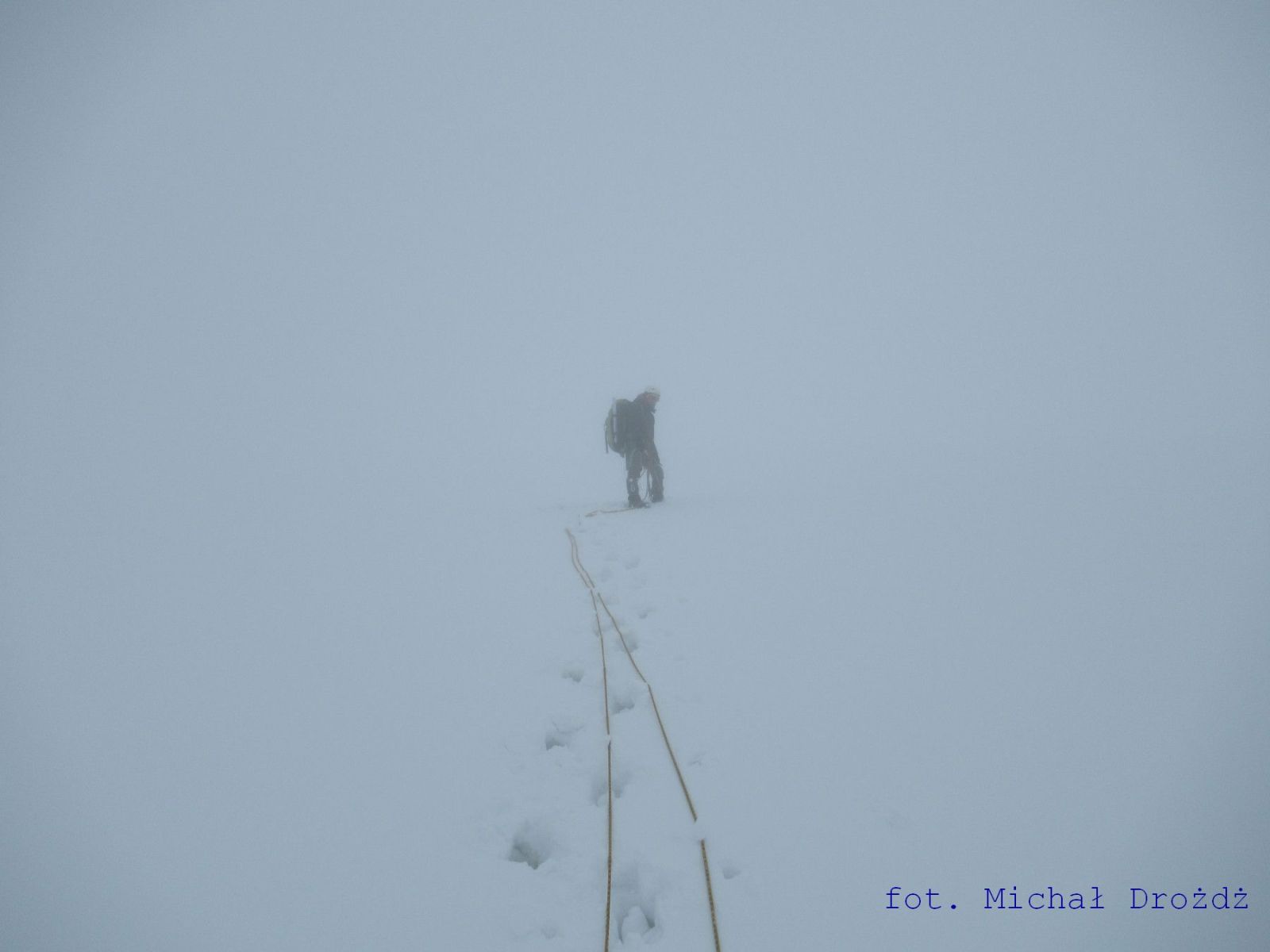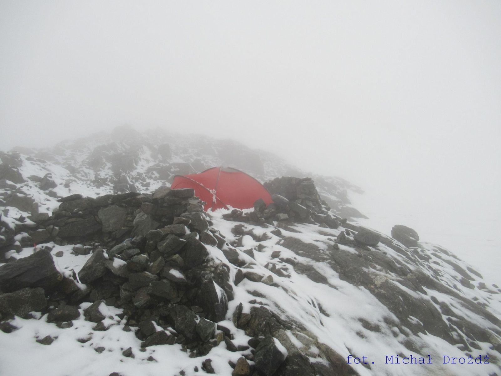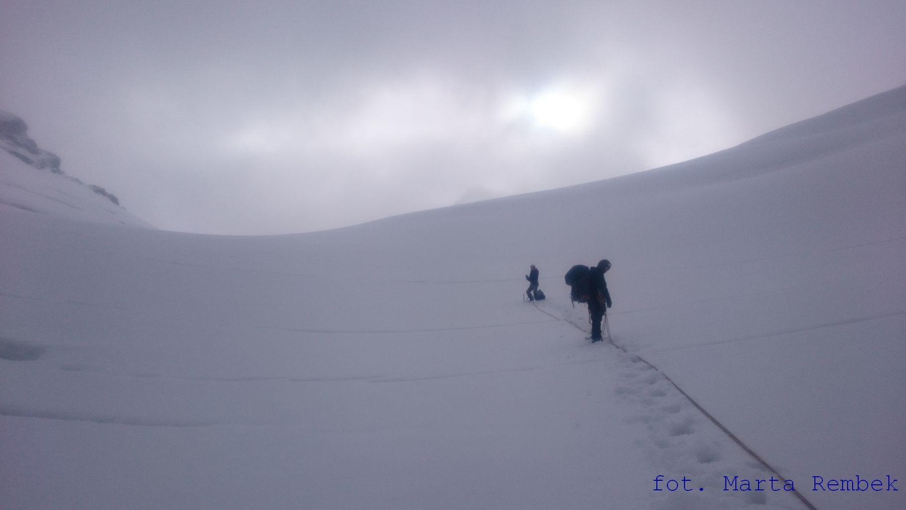 Kiedy wstaliśmy kolejnego dnia rano cała okolica była spowita gęstymi chmurami, a widoczność, nie licząc chwilowych przejaśnień, wynosiła maksymalnie dziesięć metrów. Mimo to ruszyliśmy w kierunku właściwego, położonego powyżej 4000 metrów (wg przewodnika 4070 m n.p.m.) Uszbijskiego Plateu, do którego brakowało nam około 150-200 metrów w pionie. Początkowo szliśmy śnieżnym ramieniem, na które wchodziło się wprost z obozu, a następnie skręciliśmy w lewo. Mieliśmy do przejścia kilka ogromnych szczelin, a znalezienie mostów śnieżnych i właściwej drogi przy takiej widoczności nie było łatwe. Chwilowe przejaśnienia wykorzystywaliśmy do określenia swojego położenia na lodowcu. Orientację w takich momentach ułatwiały wyłaniające się zza chmur wierzchołki Chatynia i Piku Shchurovskiego. Ostatecznie jakoś dotarliśmy na miejsce i rozstawiliśmy namiot na Uszbijskim Plateu. Tym razem wodę do gotowania musieliśmy już topić ze śniegu. Późnym popołudniem, ku naszej ogromnej frustracji znowu zaczął padać gęsty śnieg. Opad trwał do godziny trzeciej nad ranem co nieco zachwiało nasza wiarę w możliwość przeprowadzenia tego dnia ataku szczytowego.
