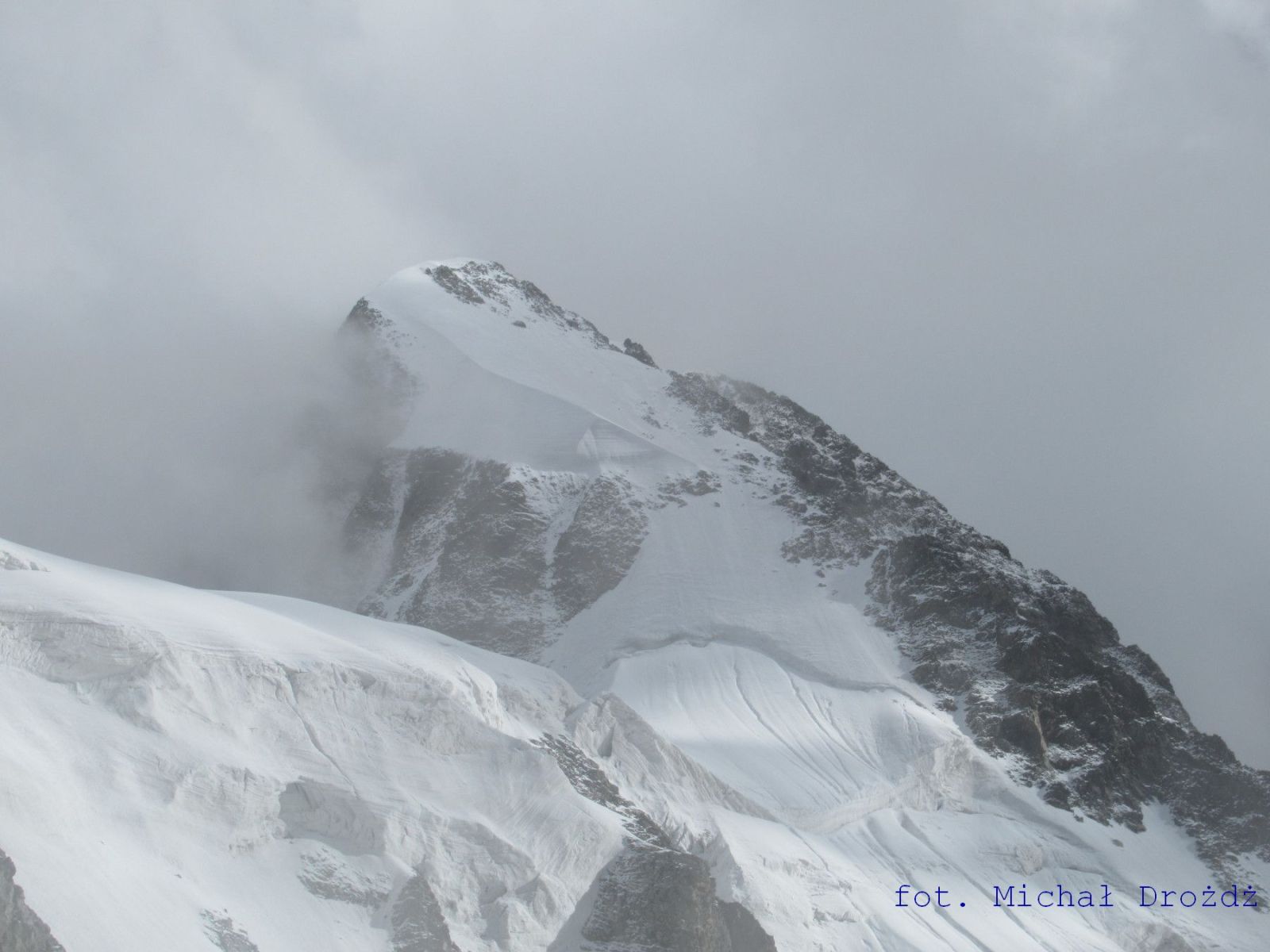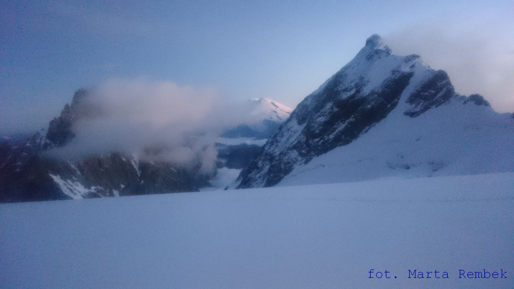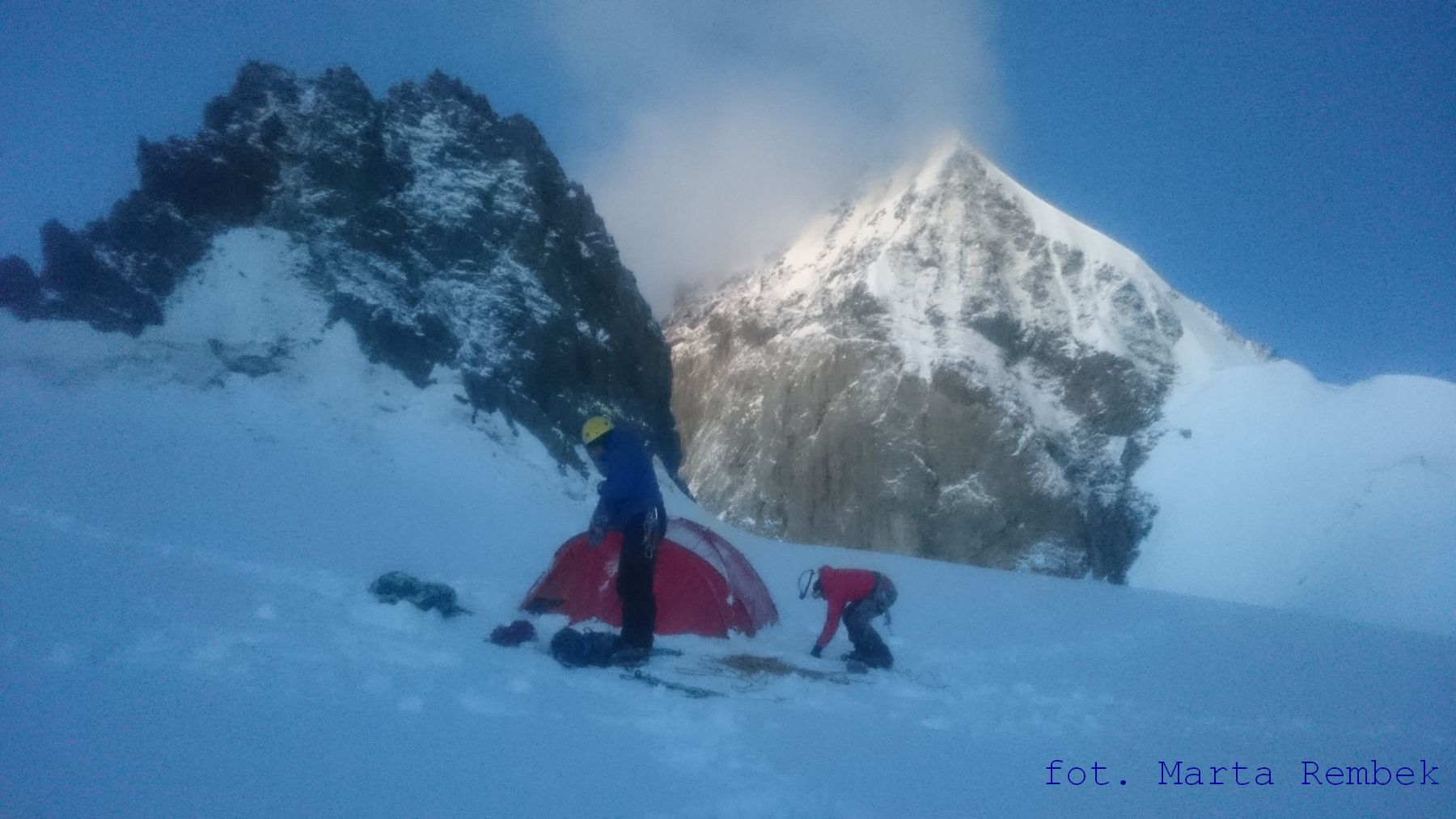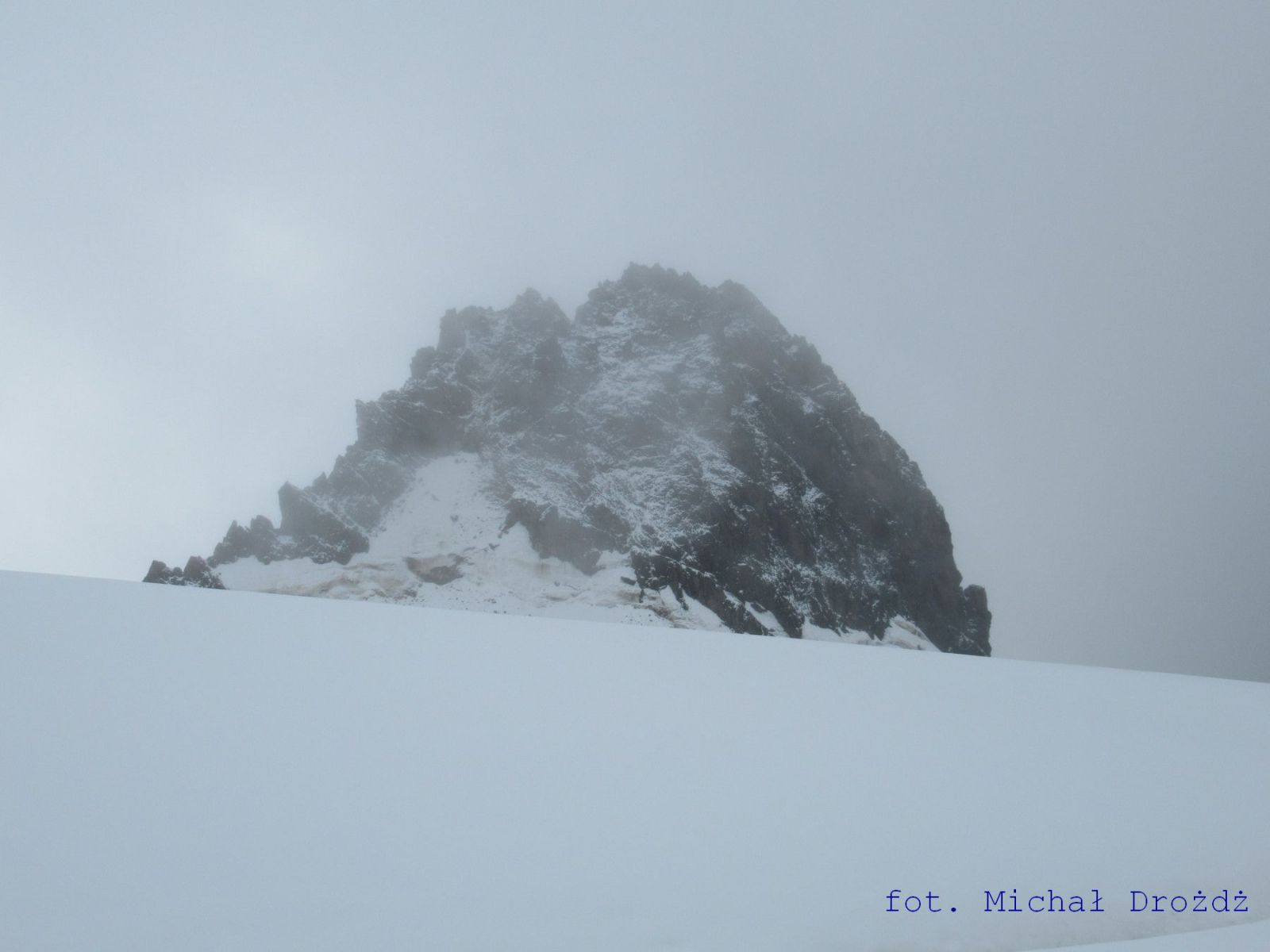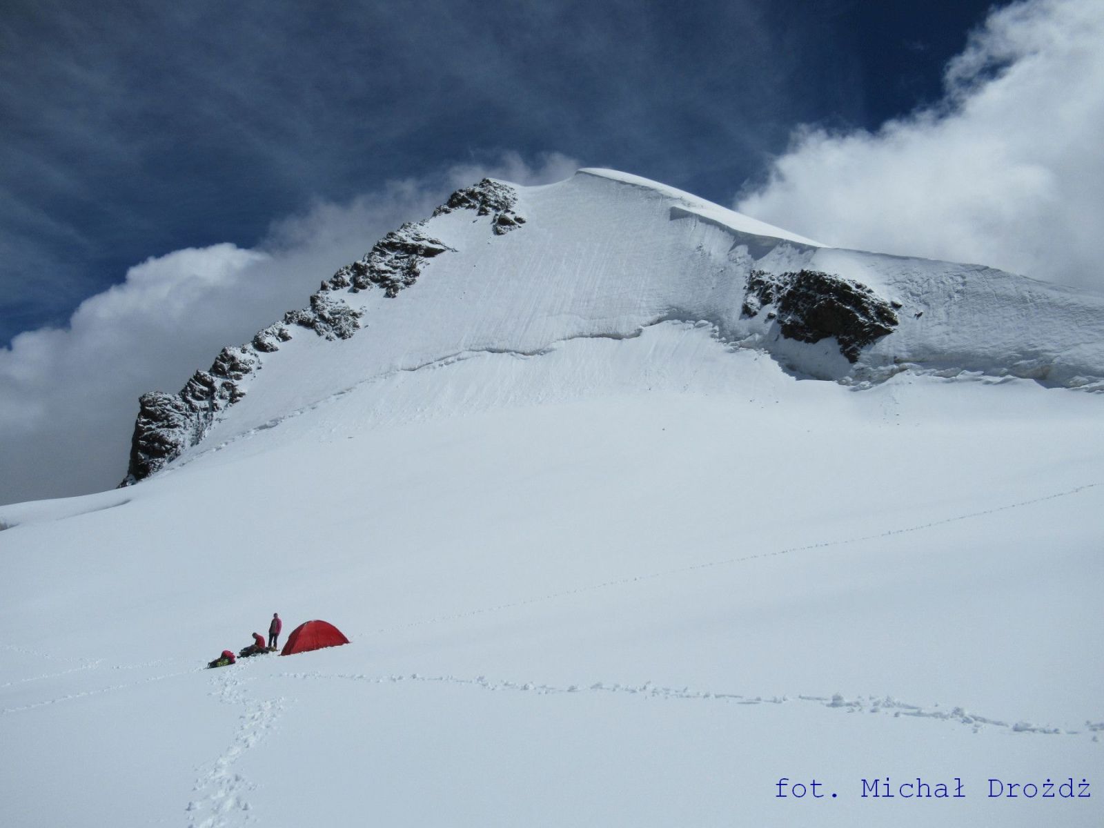 Kiedy wstaliśmy kolejnego dnia rano cała okolica była spowita gęstymi chmurami, a widoczność, nie licząc chwilowych przejaśnień, wynosiła maksymalnie dziesięć metrów. Mimo to ruszyliśmy w kierunku właściwego, położonego powyżej 4000 metrów (wg przewodnika 4070 m n.p.m.) Uszbijskiego Plateu, do którego brakowało nam około 150-200 metrów w pionie. Początkowo szliśmy śnieżnym ramieniem, na które wchodziło się wprost z obozu, a następnie skręciliśmy w lewo. Mieliśmy do przejścia kilka ogromnych szczelin, a znalezienie mostów śnieżnych i właściwej drogi przy takiej widoczności nie było łatwe. Chwilowe przejaśnienia wykorzystywaliśmy do określenia swojego położenia na lodowcu. Orientację w takich momentach ułatwiały wyłaniające się zza chmur wierzchołki Chatynia i Piku Shchurovskiego. Ostatecznie jakoś dotarliśmy na miejsce i rozstawiliśmy namiot na Uszbijskim Plateu. Tym razem wodę do gotowania musieliśmy już topić ze śniegu. Późnym popołudniem, ku naszej ogromnej frustracji znowu zaczął padać gęsty śnieg. Opad trwał do godziny trzeciej nad ranem co nieco zachwiało nasza wiarę w możliwość przeprowadzenia tego dnia ataku szczytowego.