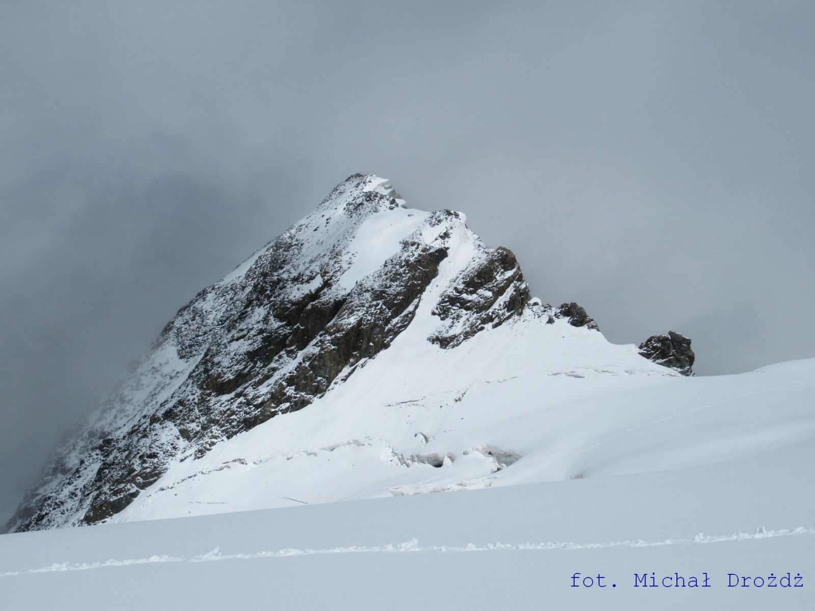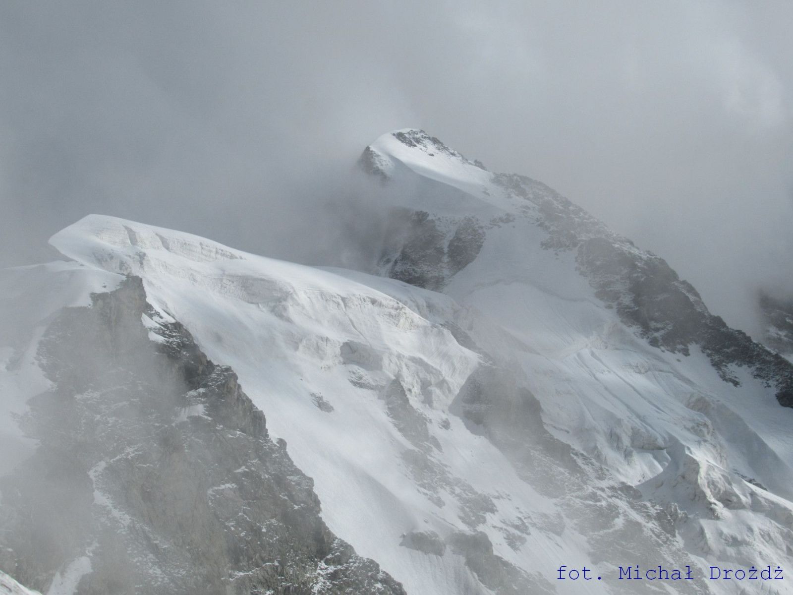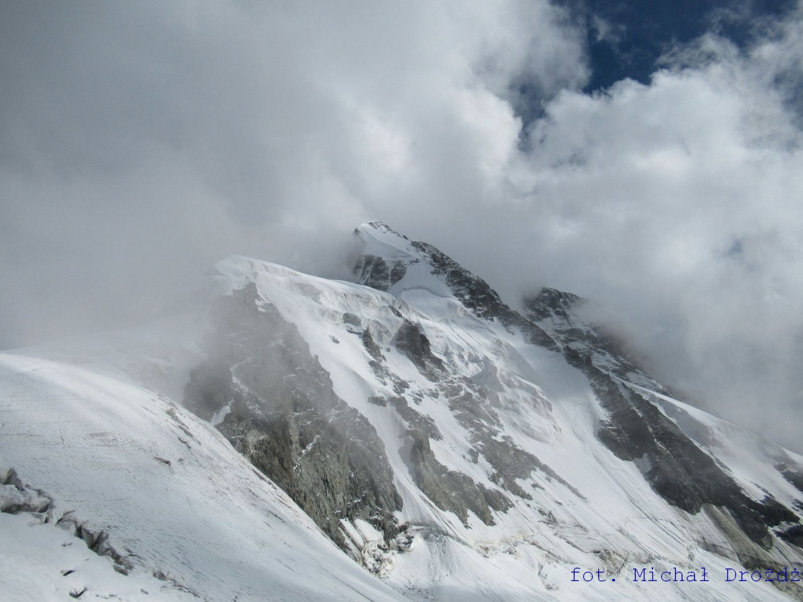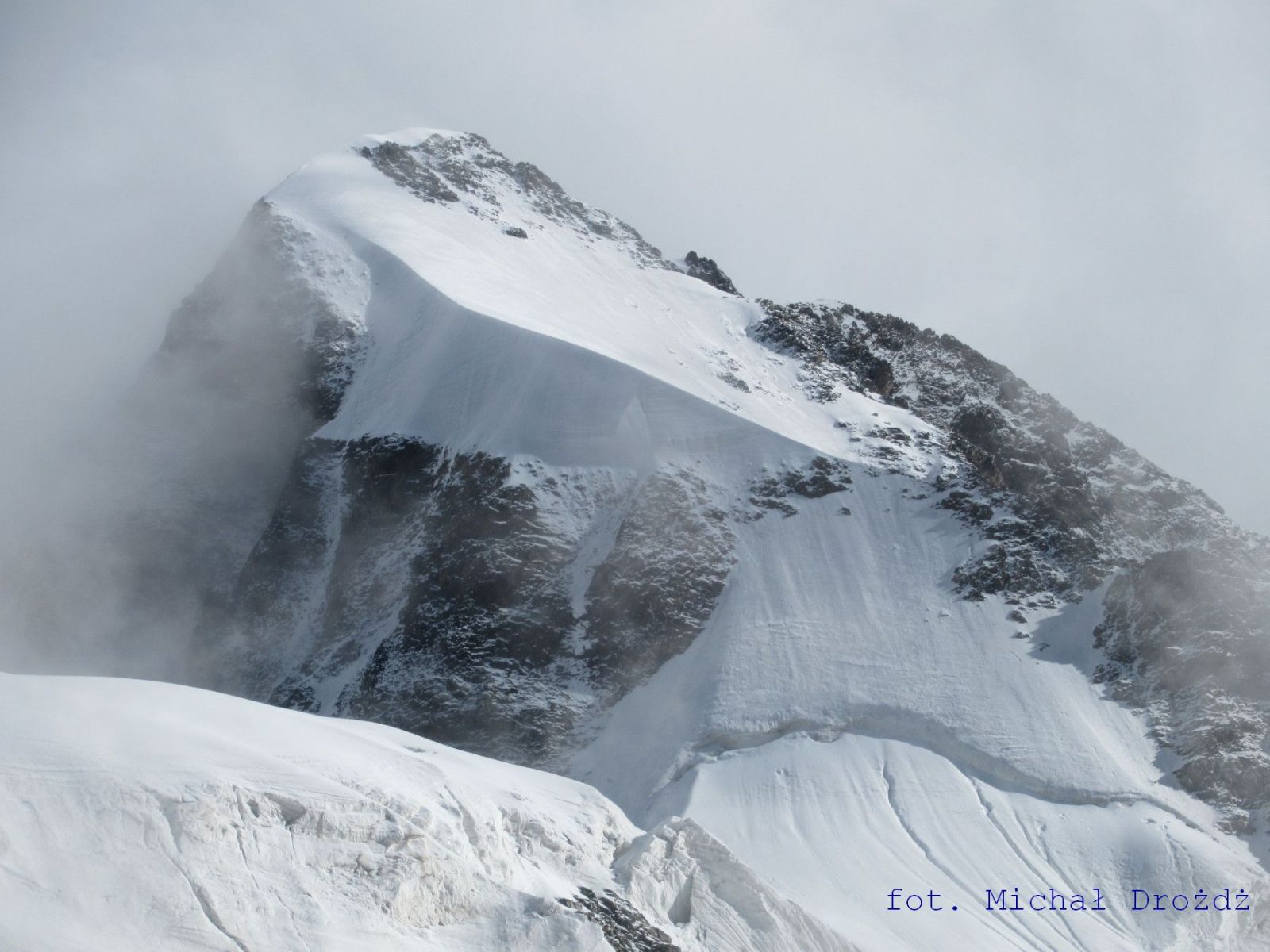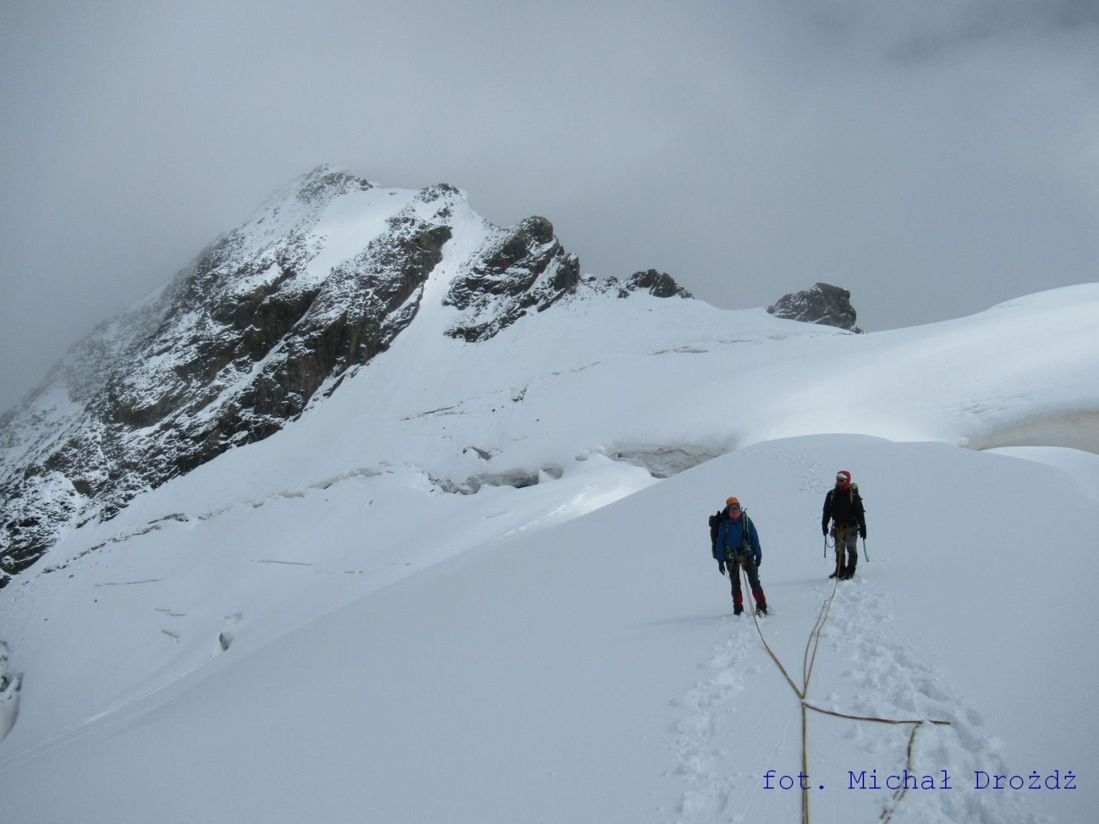 Kiedy wstaliśmy kolejnego dnia rano cała okolica była spowita gęstymi chmurami, a widoczność, nie licząc chwilowych przejaśnień, wynosiła maksymalnie dziesięć metrów. Mimo to ruszyliśmy w kierunku właściwego, położonego powyżej 4000 metrów (wg przewodnika 4070 m n.p.m.) Uszbijskiego Plateu, do którego brakowało nam około 150-200 metrów w pionie. Początkowo szliśmy śnieżnym ramieniem, na które wchodziło się wprost z obozu, a następnie skręciliśmy w lewo. Mieliśmy do przejścia kilka ogromnych szczelin, a znalezienie mostów śnieżnych i właściwej drogi przy takiej widoczności nie było łatwe. Chwilowe przejaśnienia wykorzystywaliśmy do określenia swojego położenia na lodowcu. Orientację w takich momentach ułatwiały wyłaniające się zza chmur wierzchołki Chatynia i Piku Shchurovskiego. Ostatecznie jakoś dotarliśmy na miejsce i rozstawiliśmy namiot na Uszbijskim Plateu. Tym razem wodę do gotowania musieliśmy już topić ze śniegu. Późnym popołudniem, ku naszej ogromnej frustracji znowu zaczął padać gęsty śnieg. Opad trwał do godziny trzeciej nad ranem co nieco zachwiało nasza wiarę w możliwość przeprowadzenia tego dnia ataku szczytowego.