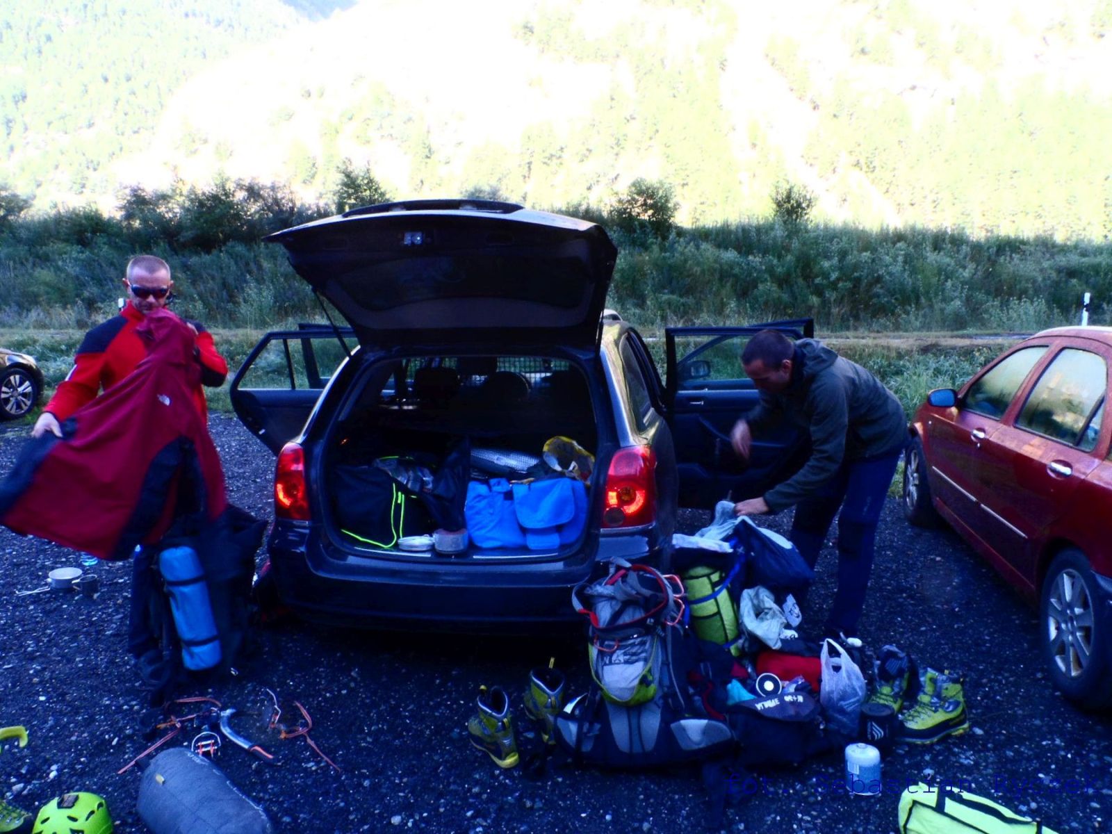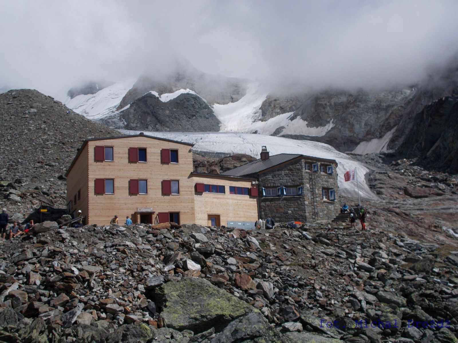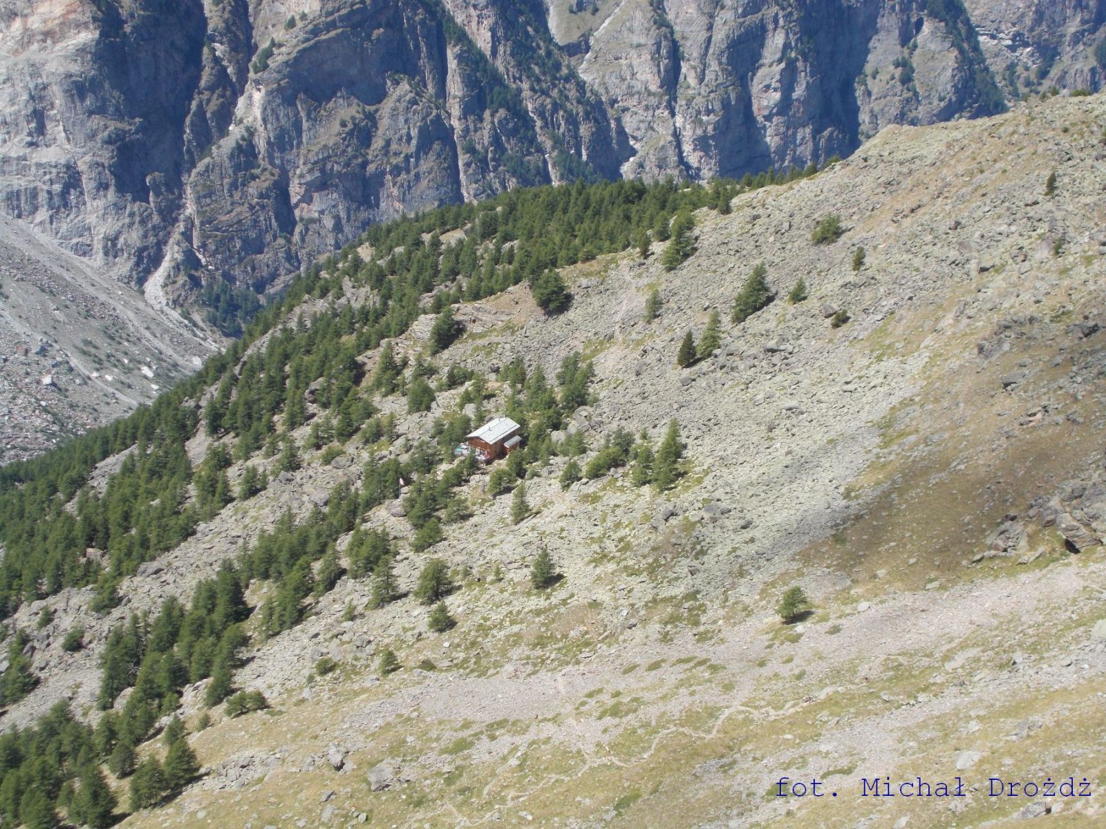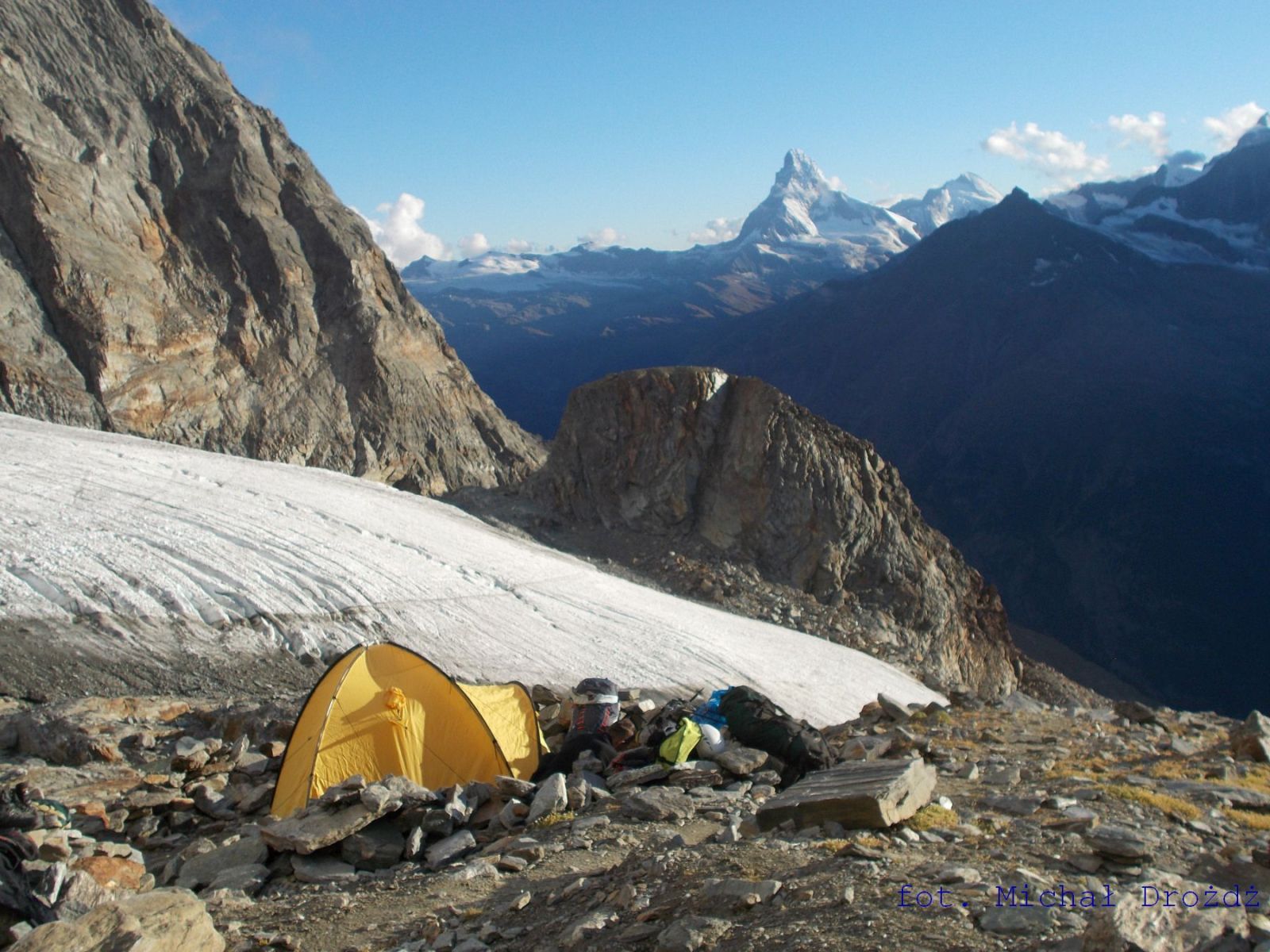 Samochód zostawiliśmy na parkingu w miejscowości Randa (przy campingu, cena 5 euro/franków za dobę) i ruszyliśmy w stronę schroniska Dom położonego na wysokości 2940 m n.p.m. Żeby dotrzeć na szlak prowadzący w tamtym kierunku trzeba było przejść przez całą miejscowość mijając m.in. kościół. Droga szła dalej zakosami najpierw lasem, a później przez alpejskie łąki. Tutaj otworzył się przed nami fantastyczny widok na leżący po drugiej stronie doliny Weisshorn, a w szczególności na jego północną grań. Idąc dalej dotarliśmy do wysokiej bariery skalnej. Jej pokonanie ułatwiały zainstalowane w wielu miejscach na drodze stalowe liny i drabinki. Sprawne przejście tego odcinka ułatwił niewątpliwie fakt, że na szlaku nie spotkaliśmy zbyt wielu ludzi. Następnie przeszliśmy jeszcze krótki, piarżysty fragment drogi i dotarliśmy do wyznaczonego na ten dzień celu – schroniska Dom. Tutaj okazało się, że przy samym schronisku obowiązywał zakaz biwakowania, dlatego musieliśmy podejść ścieżką dodatkowe dwieście metrów do góry. Tam znaleźliśmy niewielkie wypłaszczenie terenu, z czterema przygotowanymi platformami pod namioty. Jakieś 50 metrów dalej znajdował się podobny „camping” z kilkoma dodatkowymi miejscami. Naszymi sąsiadami okazała się kilkuosobowa grupa Hiszpanów, którzy głośno gadali pomiędzy sobą przez całą noc oraz dwóch Austriaków. Tuż obok obozu znajdowała się ścieżka prowadząca w kierunku wierzchołka Dom de Mischabel. Sporym mankamentem tego miejsca była dość duża odległość od wody; dojście do najbliższego strumienia zajmowało minimum 20 minut drogi po niezbyt przyjemnym piarżysku.