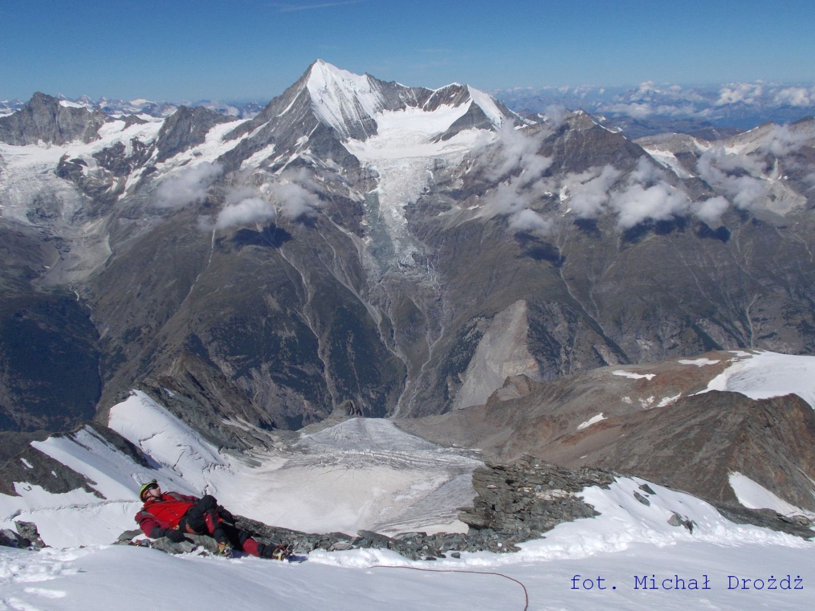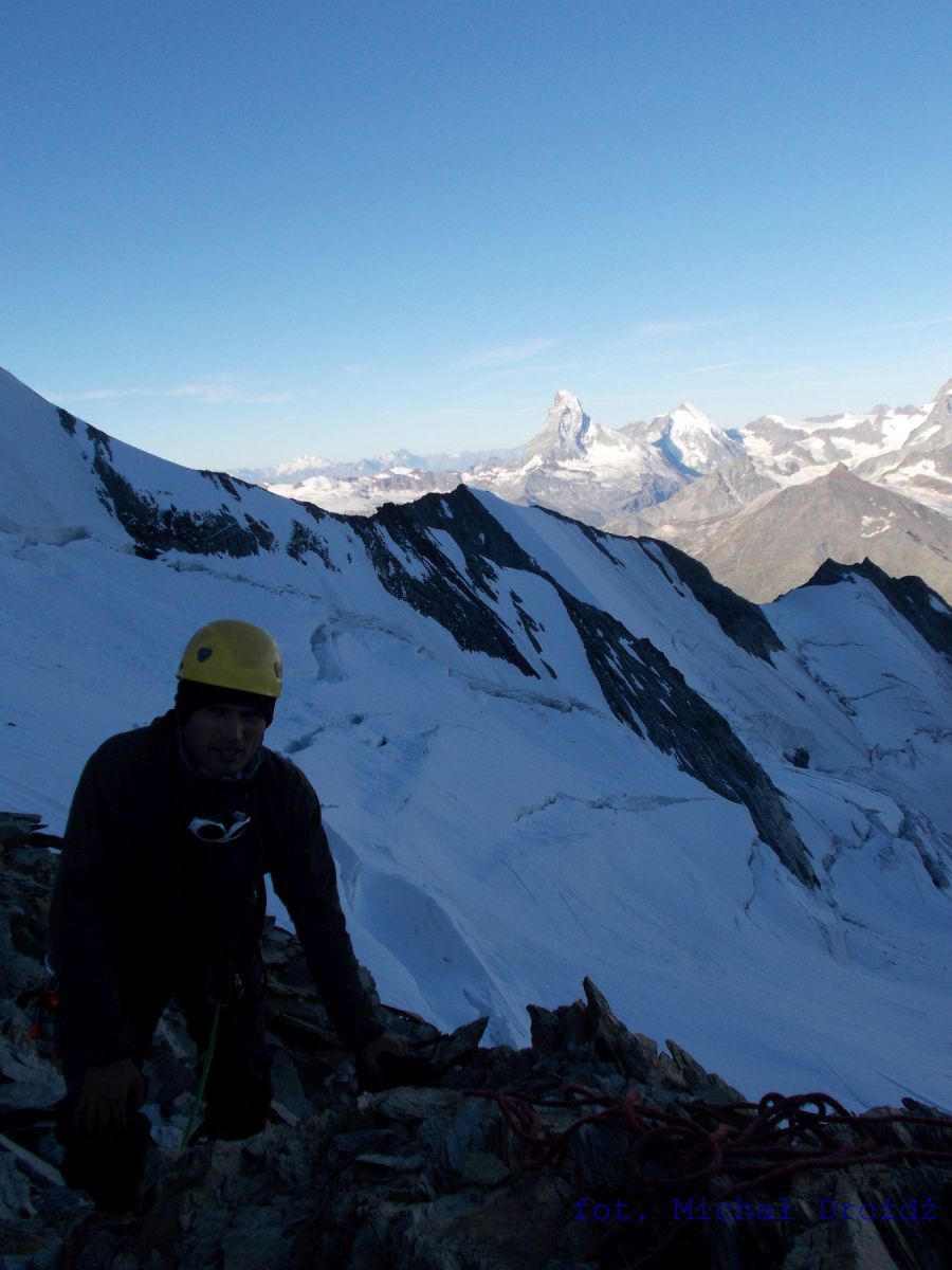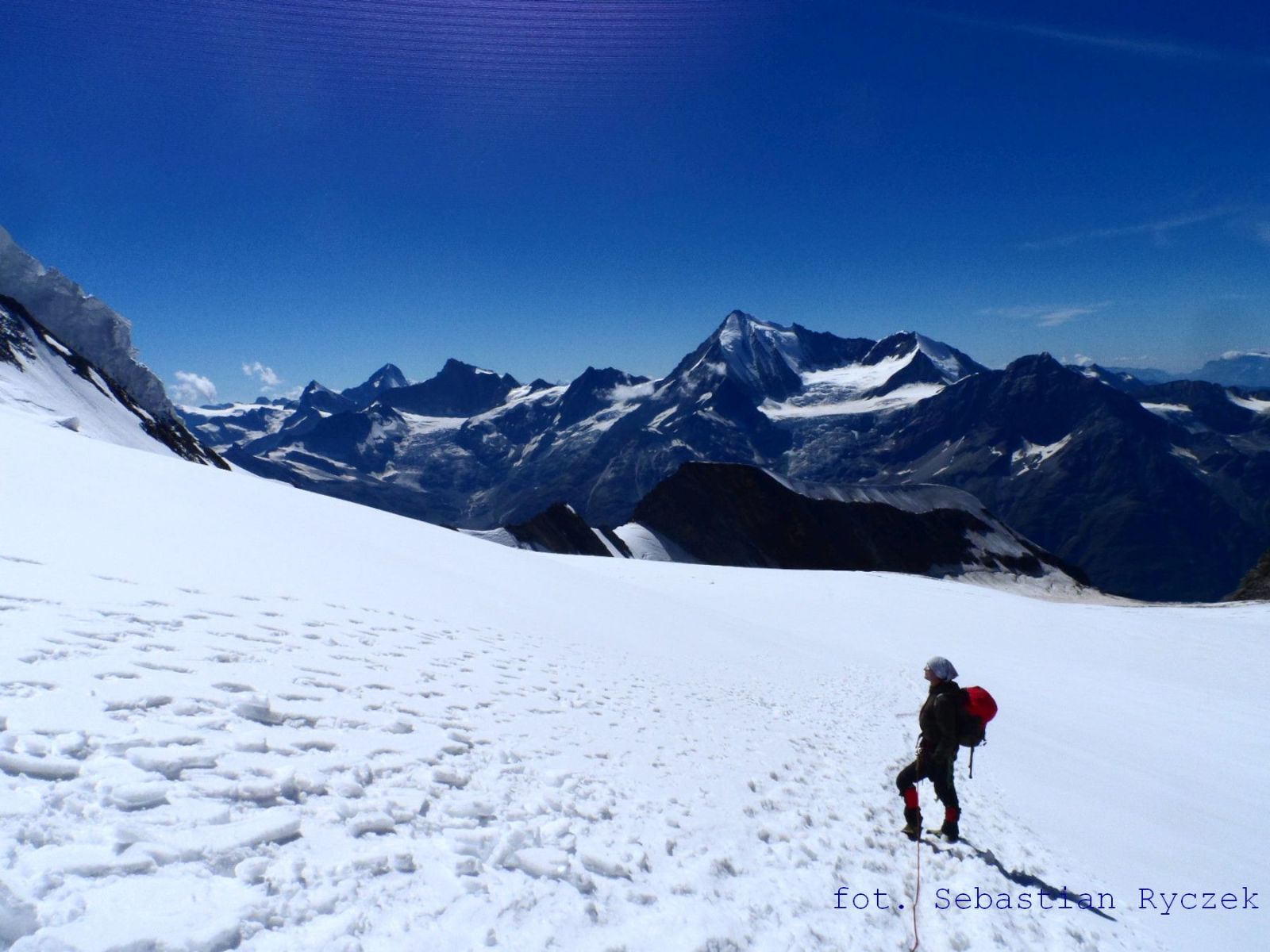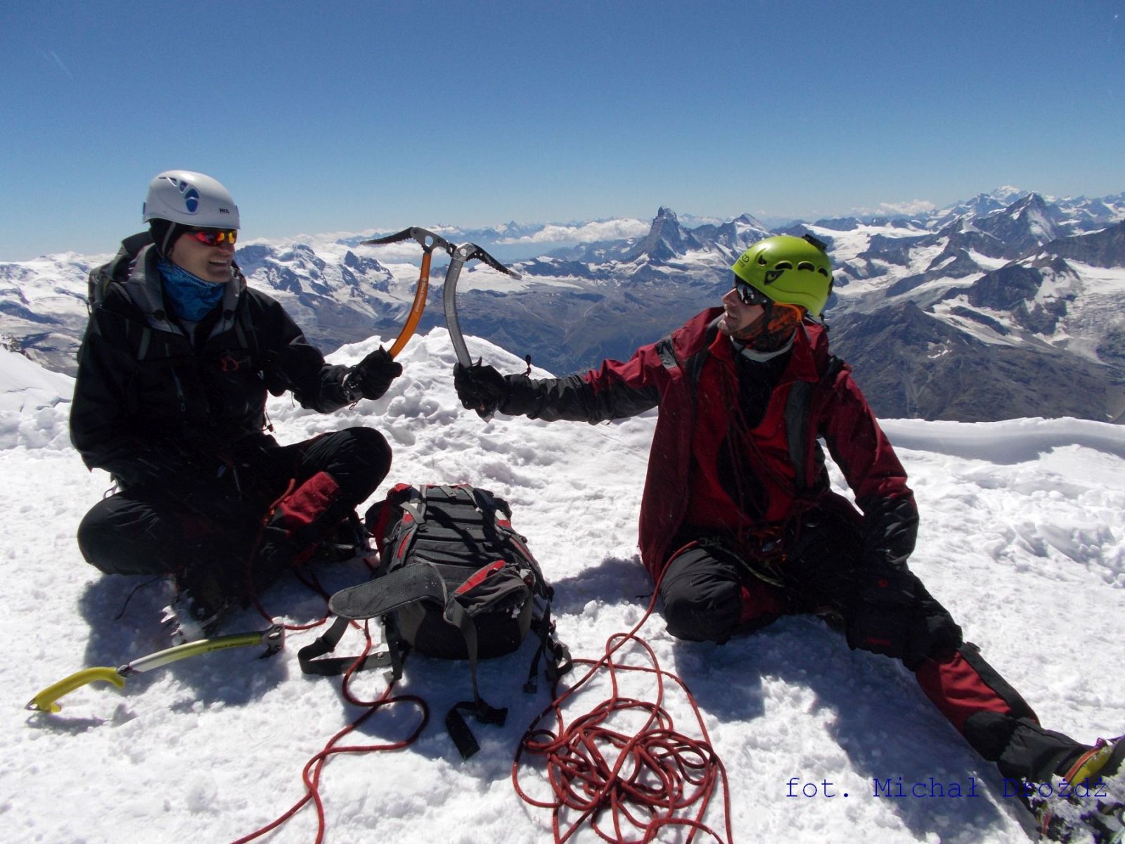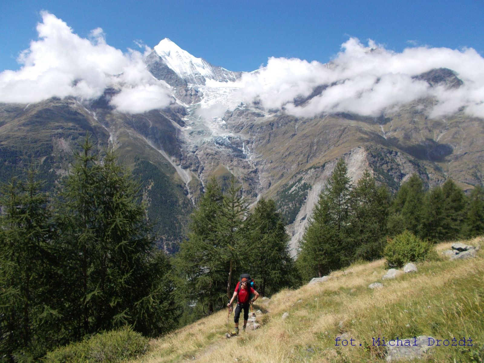 W sierpniu 2015 roku pojechaliśmy trzyosobową ekipą (Michał Drożdż, Sebastian Ryczek, Marek Zdybel) w rejon Zermatt, który znajduje się w Alpach Walijskich. Naszym pierwszym celem był mierzący 4545 m n.p.m. Dom de Mischabel („katedra”). Chcieliśmy wejść na niego drogą północno – wschodnią czyli Granią Festi o trudnościach PD, z miejscami skalnymi wycenionymi na II.