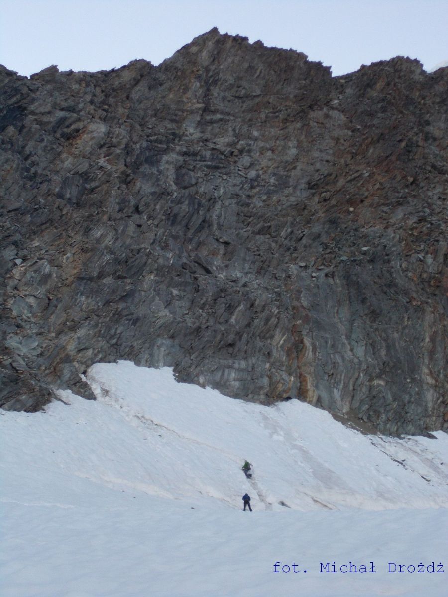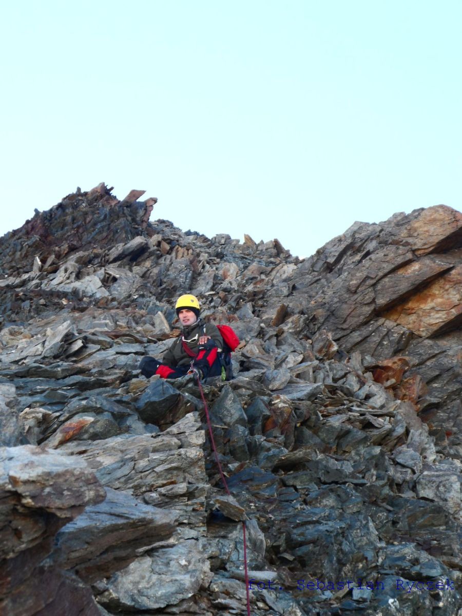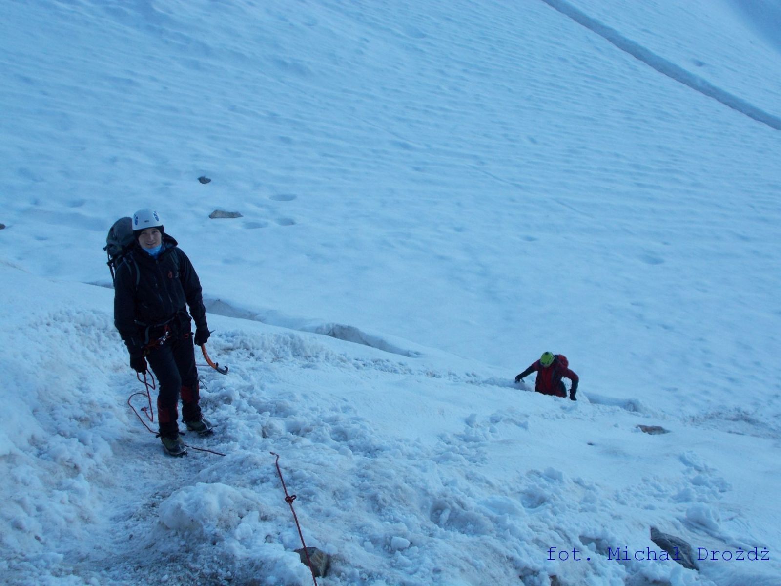 Dalsza droga prowadziła do góry ostrzem grani, najpierw po skałach, a później na przemian raz skałami, a raz śniegiem. Cały czas znajdowaliśmy się w cieniu, temperatura była jednak zupełnie znośna. Nachylenie terenu zarówno śnieżnego jak i skał wahało się w granicach 35 – 40 stopni. Jedynym wyjątkiem okazał kilkunastometrowy śnieżno-lodowy prożek. W czasie późniejszej analizy naszego przejścia doszliśmy do wniosku, że był to ten fragment drogi, który został przedstawiony w niektórych opisach jako wymagający użycia śruby lodowej. W czasie naszej akcji warunki w tym miejscu były jednak na tyle dobre, że nie było potrzeby zakładania żadnych punktów asekuracyjnych.