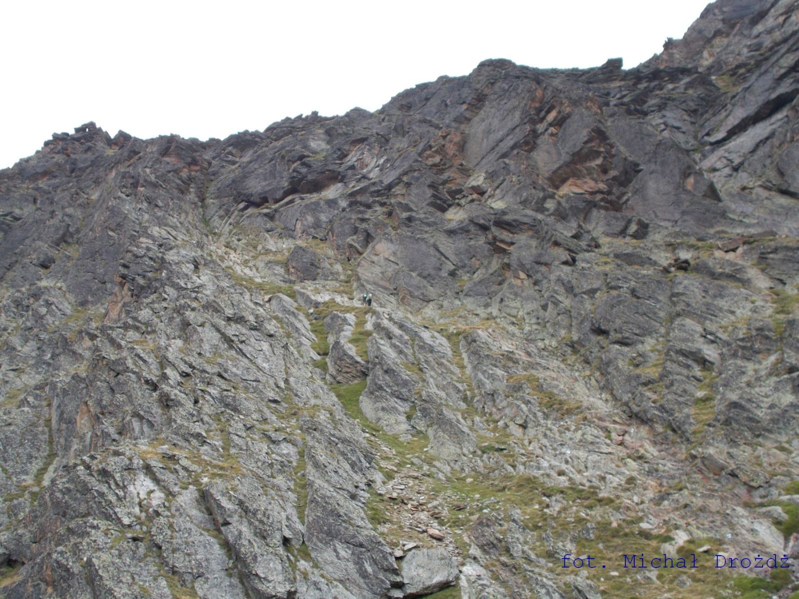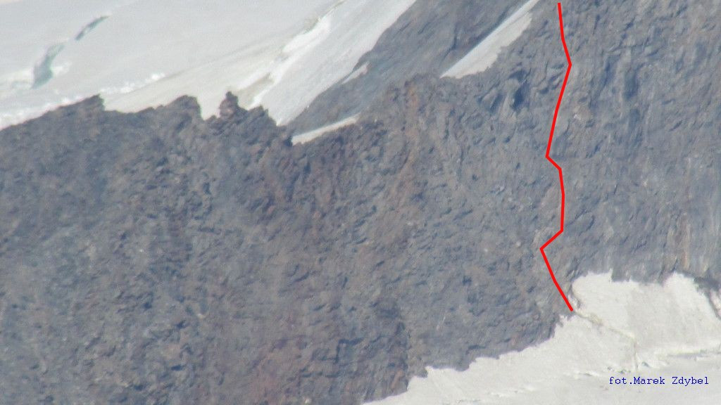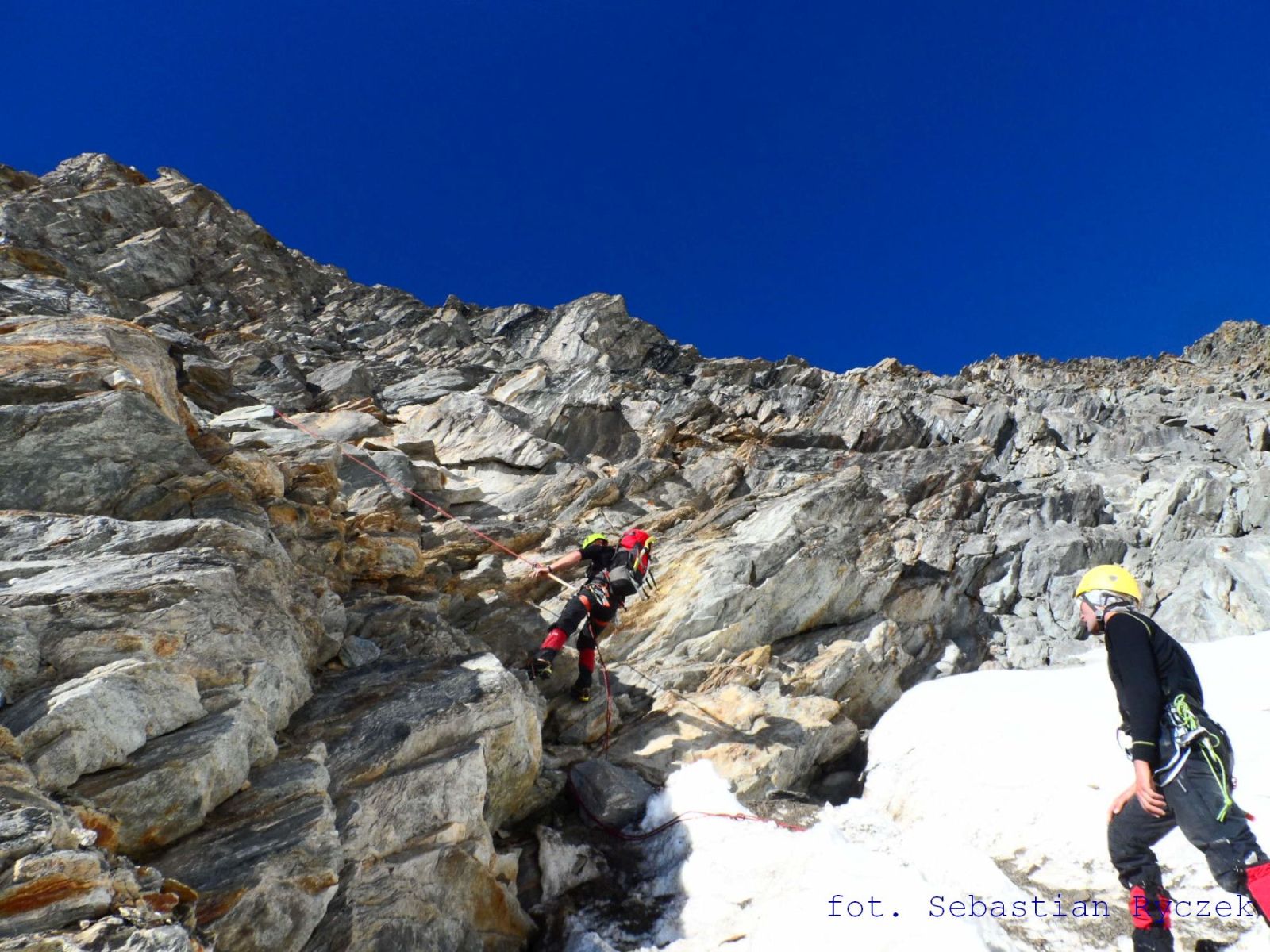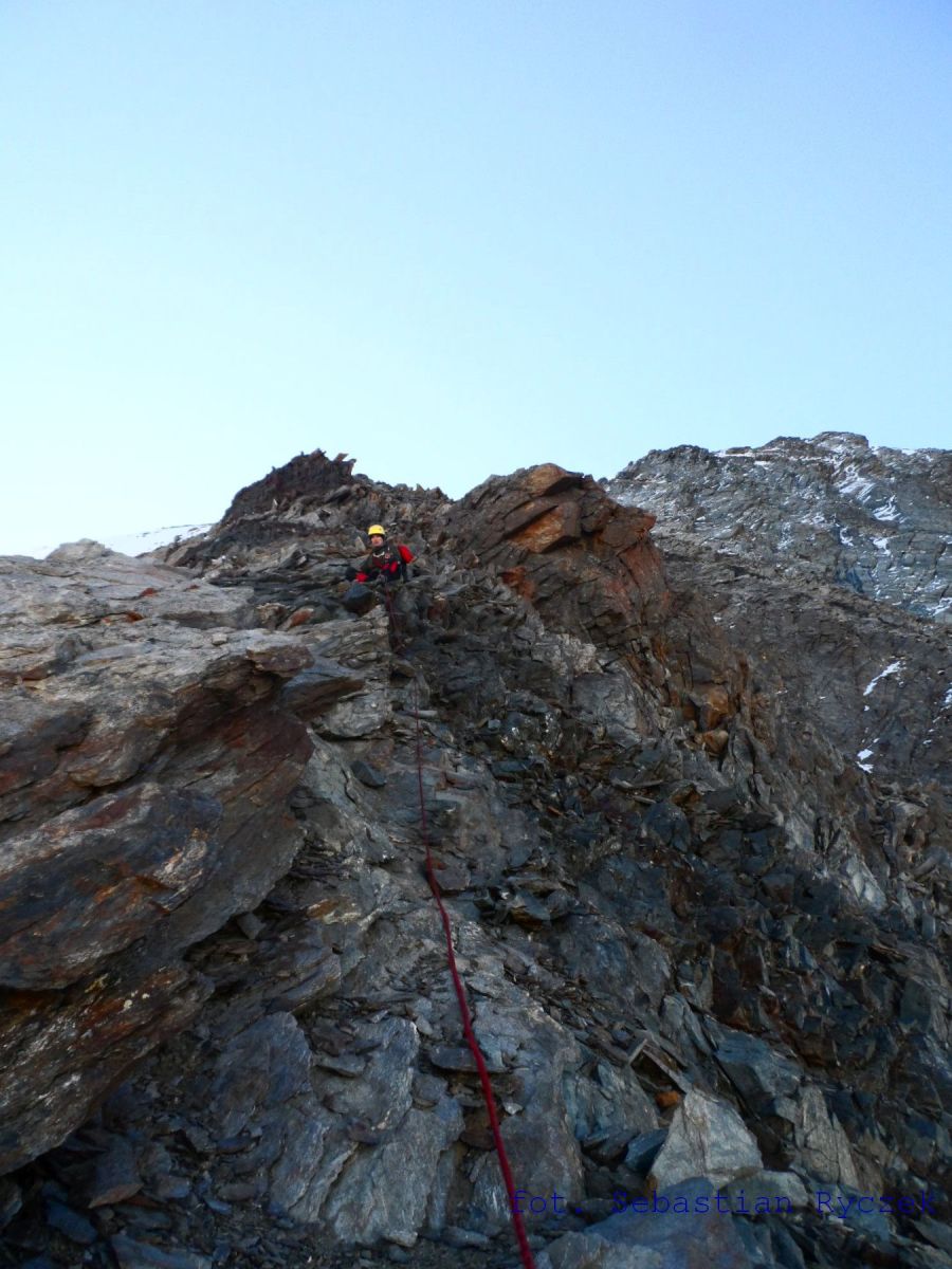 Dalsza droga prowadziła do góry ostrzem grani, najpierw po skałach, a później na przemian raz skałami, a raz śniegiem. Cały czas znajdowaliśmy się w cieniu, temperatura była jednak zupełnie znośna. Nachylenie terenu zarówno śnieżnego jak i skał wahało się w granicach 35 – 40 stopni. Jedynym wyjątkiem okazał kilkunastometrowy śnieżno-lodowy prożek. W czasie późniejszej analizy naszego przejścia doszliśmy do wniosku, że był to ten fragment drogi, który został przedstawiony w niektórych opisach jako wymagający użycia śruby lodowej. W czasie naszej akcji warunki w tym miejscu były jednak na tyle dobre, że nie było potrzeby zakładania żadnych punktów asekuracyjnych.