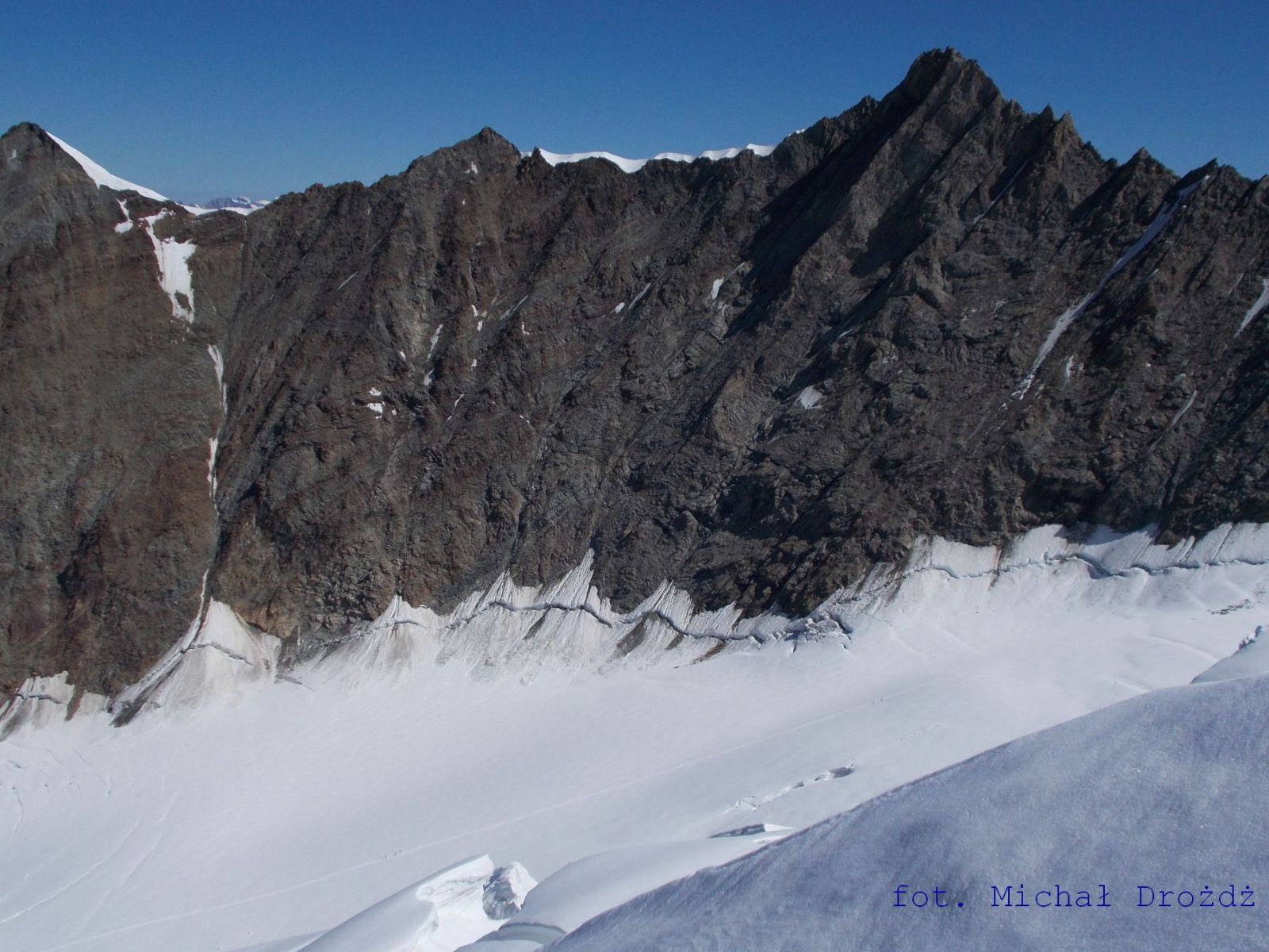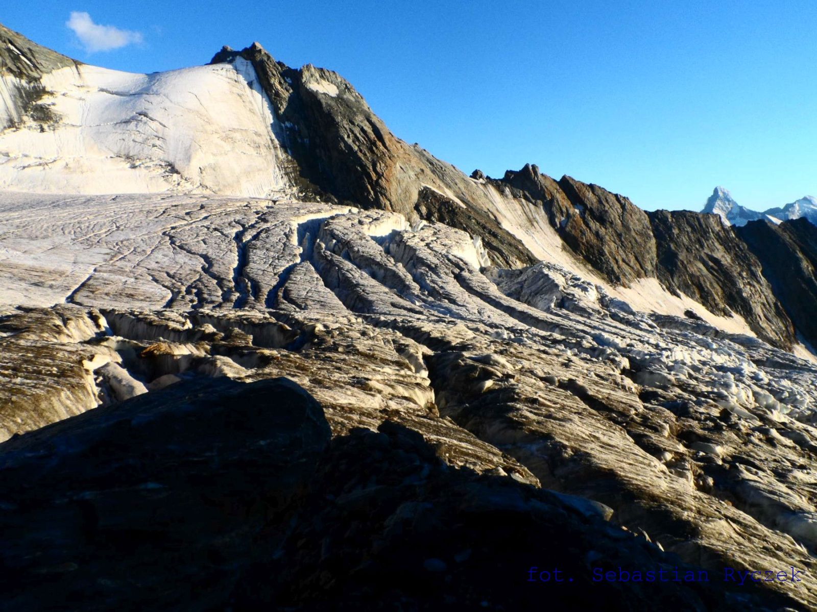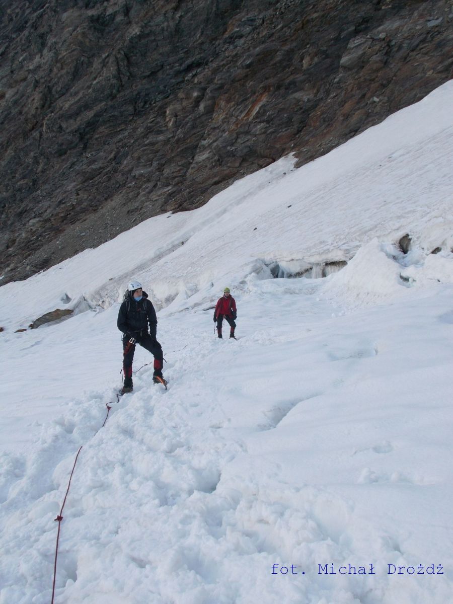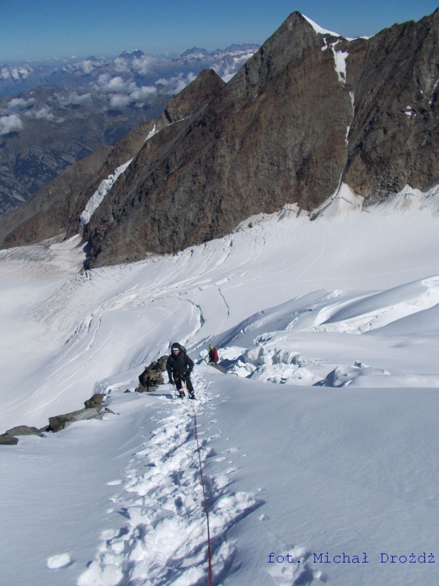 Schodziliśmy tzw. Północną Flanką, która jest też określana mianem normalnej drogi na szczyt. Droga prowadziła prosto do dołu śnieżnymi zboczami. Później, żeby ominąć szczeliny, musieliśmy odbić nieco na prawo. W końcu dotarliśmy do lodowca Hohberg. Wydeptana ścieżka prowadziła w taki sposób, żeby zachować bezpieczny dystans zarówno od seraków znajdujących się po naszej lewej stronie jak i spadających od strony Hohberghornu i Stecknadelhornu kamiennych lawin. Słońce operowało już na tyle mocno, że czułem się jakbym wszedł do mikrofalówki. W miarę jak zbliżaliśmy się do Przełęczy Festinjoch lodowiec stawał się coraz bardziej uszczeliniony. Przekraczanie szczelin przy rozmiękłym o tej porze dnia śniegu wcale nie było takie łatwe. Zwłaszcza, że musieliśmy trzymać dystans do wiszących nad nami potężnych seraków, z których co chwila odrywały się bryły lodu.