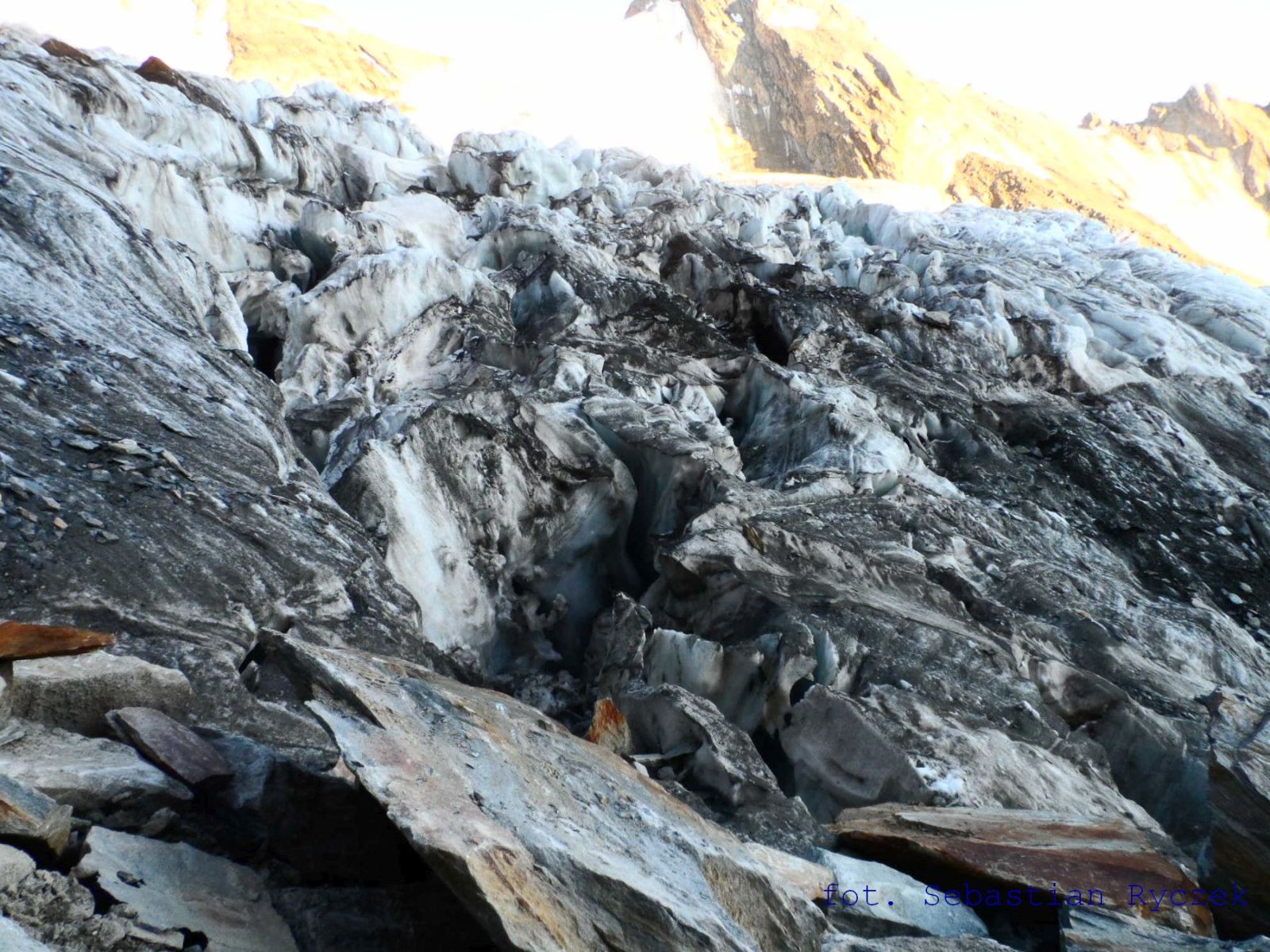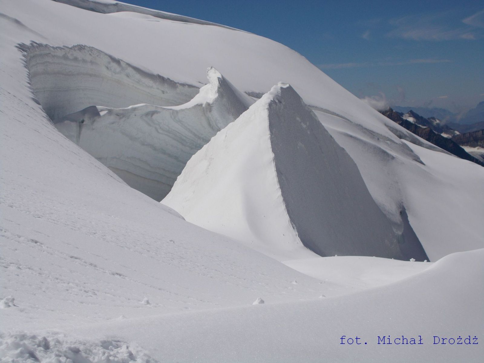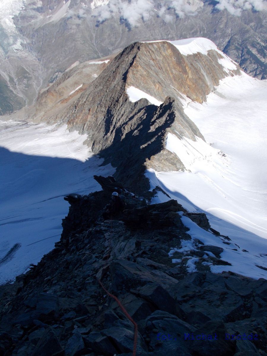 Schodziliśmy tzw. Północną Flanką, która jest też określana mianem normalnej drogi na szczyt. Droga prowadziła prosto do dołu śnieżnymi zboczami. Później, żeby ominąć szczeliny, musieliśmy odbić nieco na prawo. W końcu dotarliśmy do lodowca Hohberg. Wydeptana ścieżka prowadziła w taki sposób, żeby zachować bezpieczny dystans zarówno od seraków znajdujących się po naszej lewej stronie jak i spadających od strony Hohberghornu i Stecknadelhornu kamiennych lawin. Słońce operowało już na tyle mocno, że czułem się jakbym wszedł do mikrofalówki. W miarę jak zbliżaliśmy się do Przełęczy Festinjoch lodowiec stawał się coraz bardziej uszczeliniony. Przekraczanie szczelin przy rozmiękłym o tej porze dnia śniegu wcale nie było takie łatwe. Zwłaszcza, że musieliśmy trzymać dystans do wiszących nad nami potężnych seraków, z których co chwila odrywały się bryły lodu.