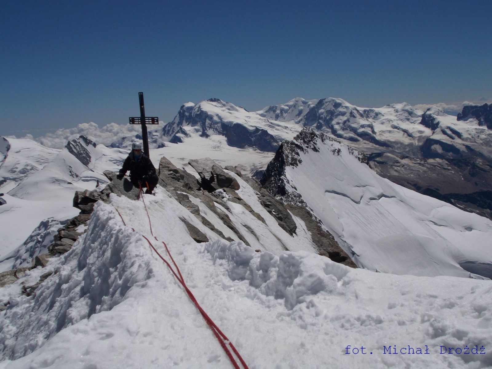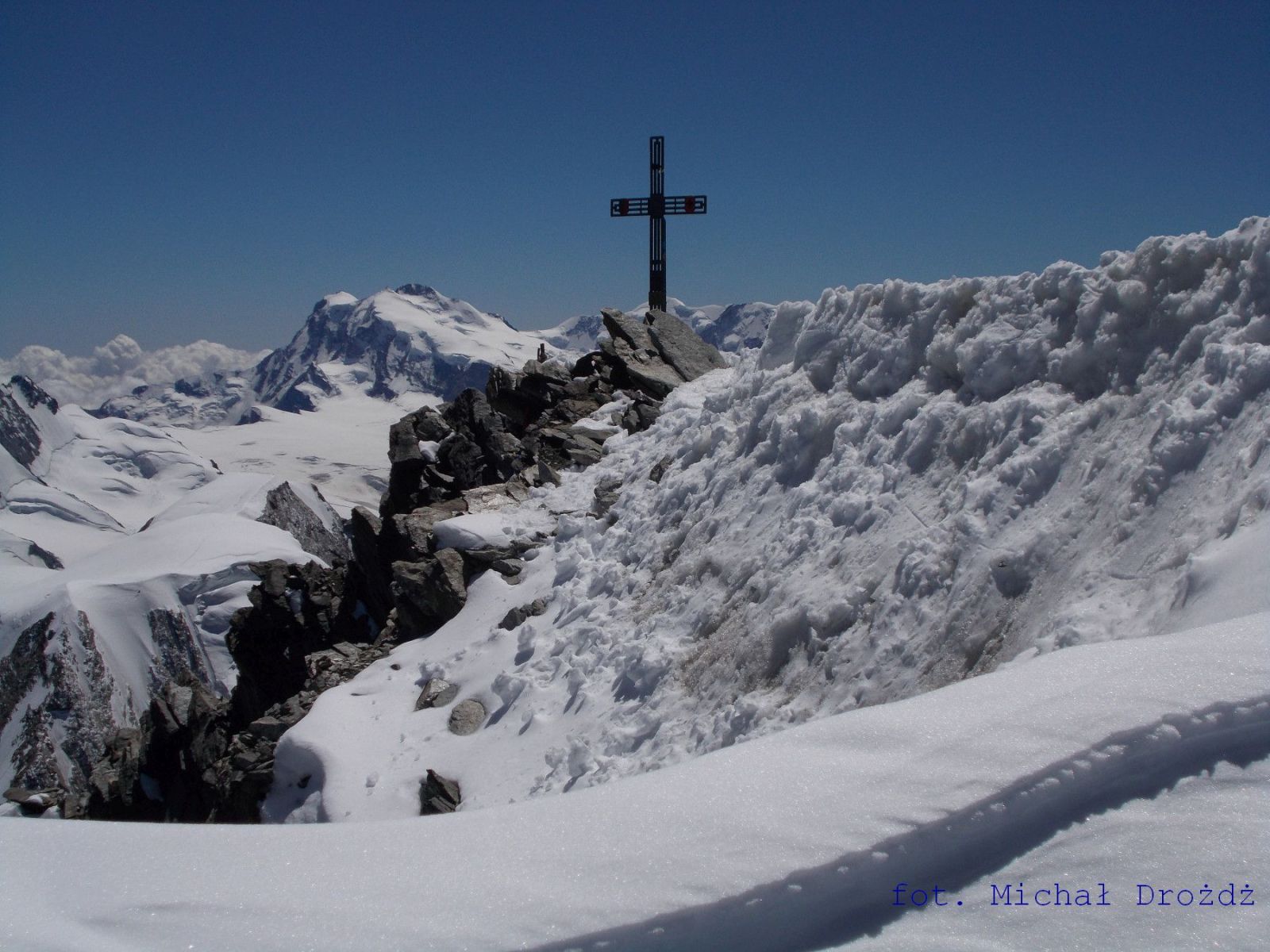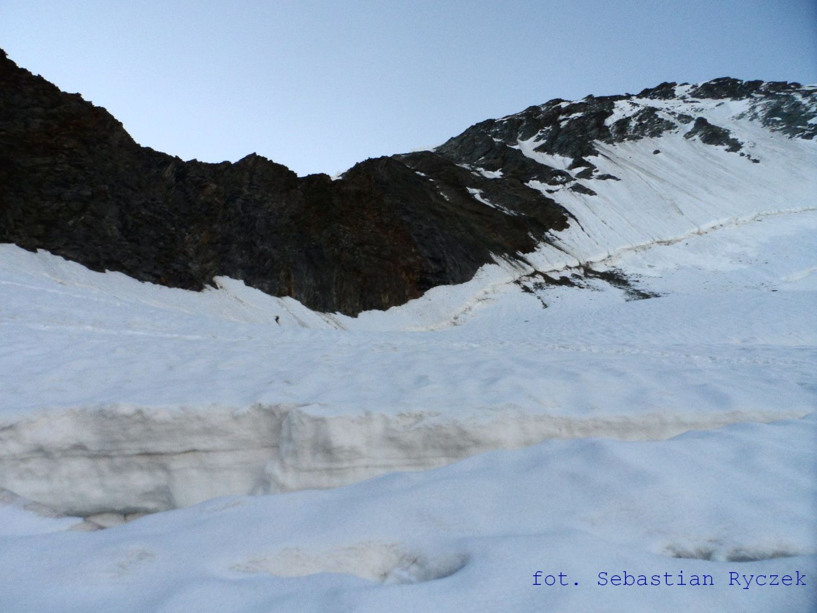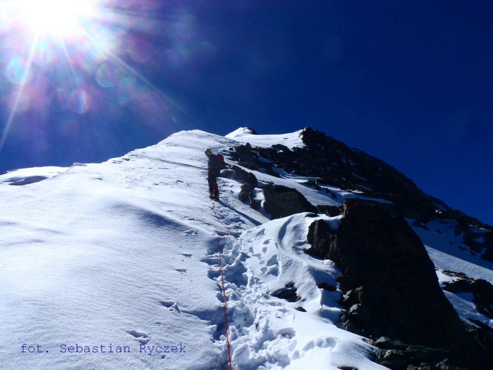 Po pokonaniu prożka wyszliśmy na niewielką, śnieżną półkę. Tutaj dotarły do nas pierwsze promienie słońca. Był to dobry pretekst do zatrzymania się na dłuższą przerwę. Później ruszyliśmy dalej. Przez jakiś czas kluczyliśmy jeszcze wśród skał, a następnie szliśmy już tylko po śniegu. Słońce zaczęło mocno przygrzewać, dlatego też tempo wspinaczki wyraźnie spadło. W końcu po lewej stronie zobaczyliśmy szczyt (wcześniej był on zasłonięty przez sąsiednie wierzchołki). Przed nami został jeszcze długi trawers po śniegu, przekroczenie dwóch ogromnych szczelin i strome podejście na wierzchołek. Mosty nad szczelinami nie wyglądały na zbyt mocne (było już po południu i śnieg zaczął rozmiękać) dlatego przechodziliśmy po nich najszybciej jak się dało. Jeszcze tylko kilkadziesiąt metrów w górę i dotarliśmy do celu. Żeby zrobić zdjęcia przy krzyżu trzeba było podejść jeszcze kilka metrów mocno eksponowaną mini-granią. Po krótkiej sesji zdjęciowej szybko zebraliśmy się i ruszyliśmy w dół.
