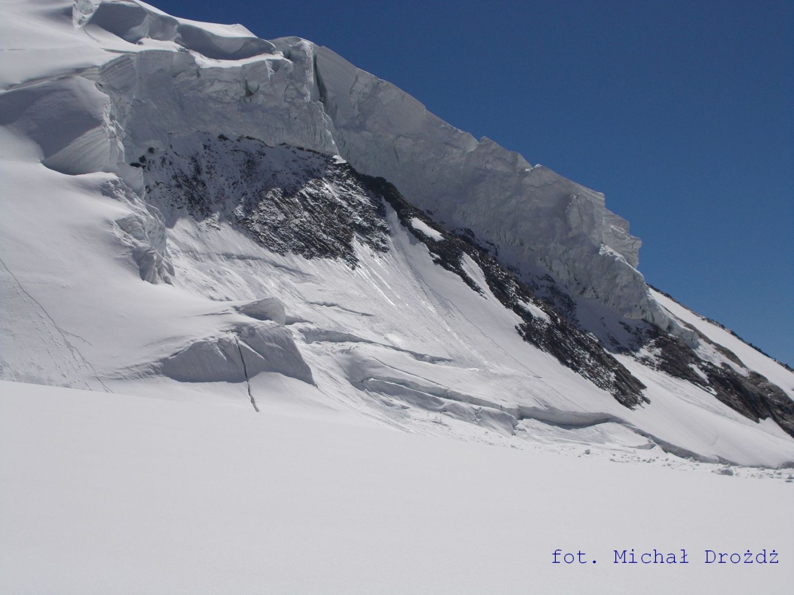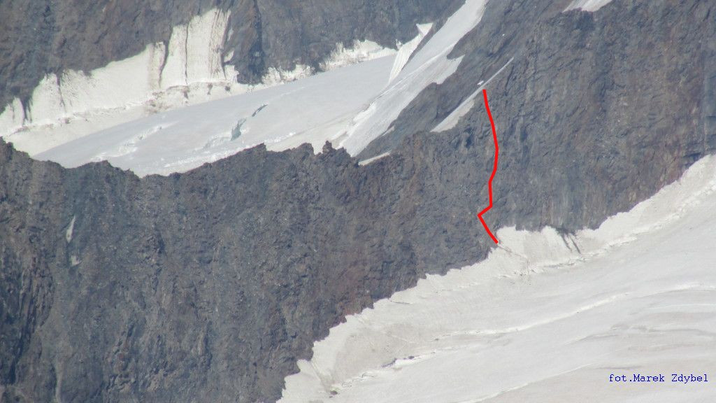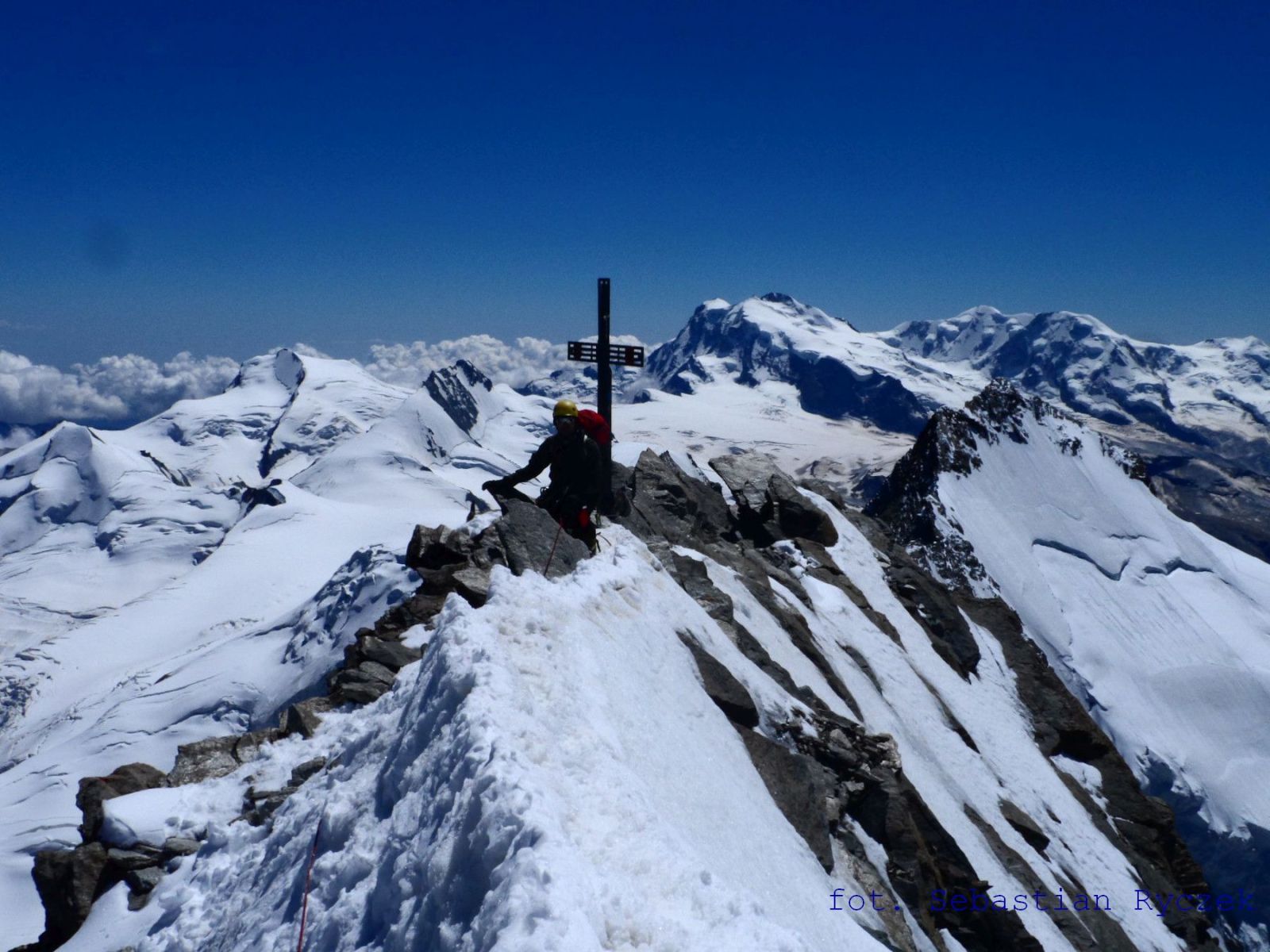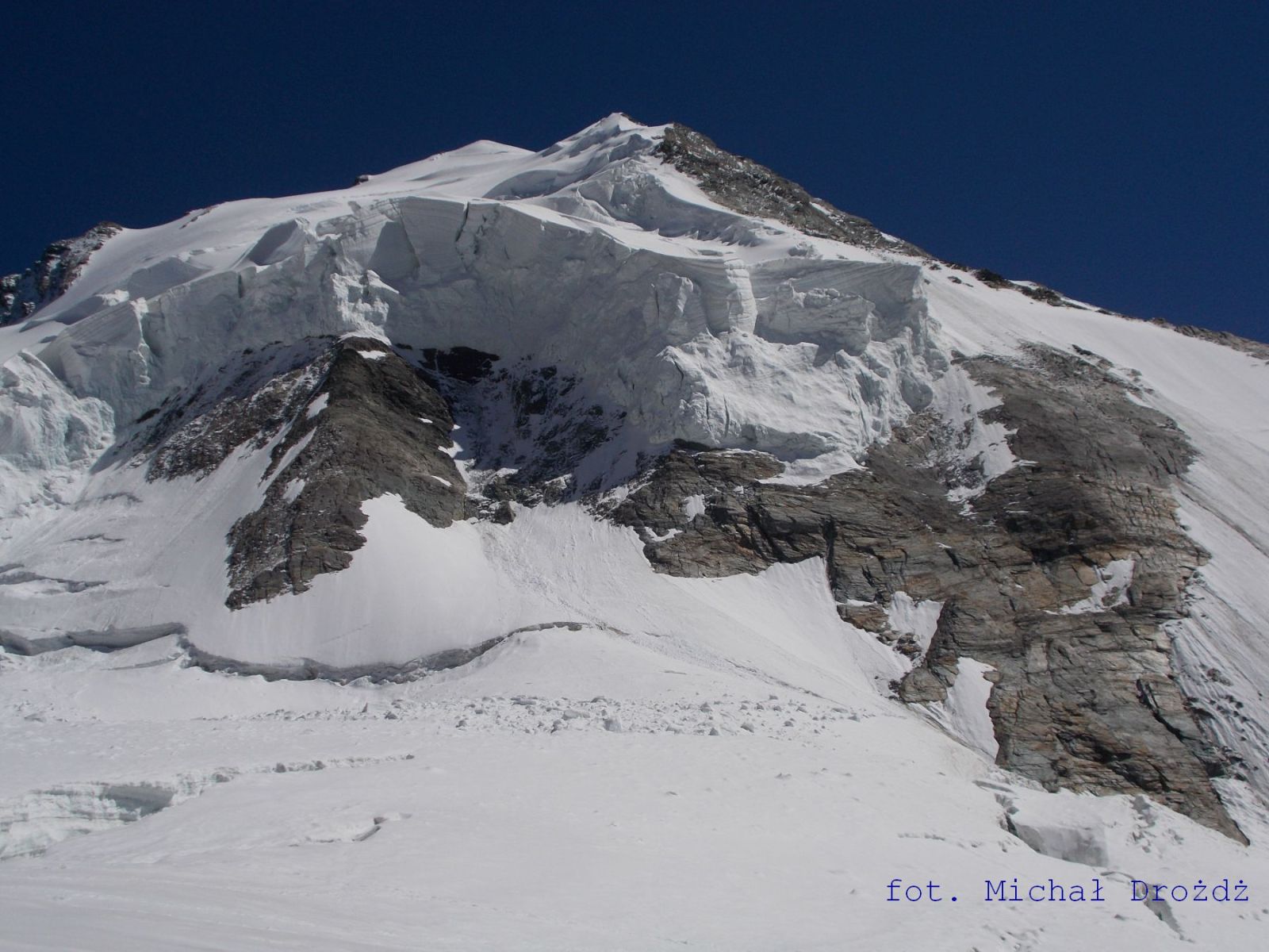Po pokonaniu prożka wyszliśmy na niewielką, śnieżną półkę. Tutaj dotarły do nas pierwsze promienie słońca. Był to dobry pretekst do zatrzymania się na dłuższą przerwę. Później ruszyliśmy dalej. Przez jakiś czas kluczyliśmy jeszcze wśród skał, a następnie szliśmy już tylko po śniegu. Słońce zaczęło mocno przygrzewać, dlatego też tempo wspinaczki wyraźnie spadło. W końcu po lewej stronie zobaczyliśmy szczyt (wcześniej był on zasłonięty przez sąsiednie wierzchołki). Przed nami został jeszcze długi trawers po śniegu, przekroczenie dwóch ogromnych szczelin i strome podejście na wierzchołek. Mosty nad szczelinami nie wyglądały na zbyt mocne (było już po południu i śnieg zaczął rozmiękać) dlatego przechodziliśmy po nich najszybciej jak się dało. Jeszcze tylko kilkadziesiąt metrów w górę i dotarliśmy do celu. Żeby zrobić zdjęcia przy krzyżu trzeba było podejść jeszcze kilka metrów mocno eksponowaną mini-granią. Po krótkiej sesji zdjęciowej szybko zebraliśmy się i ruszyliśmy w dół.