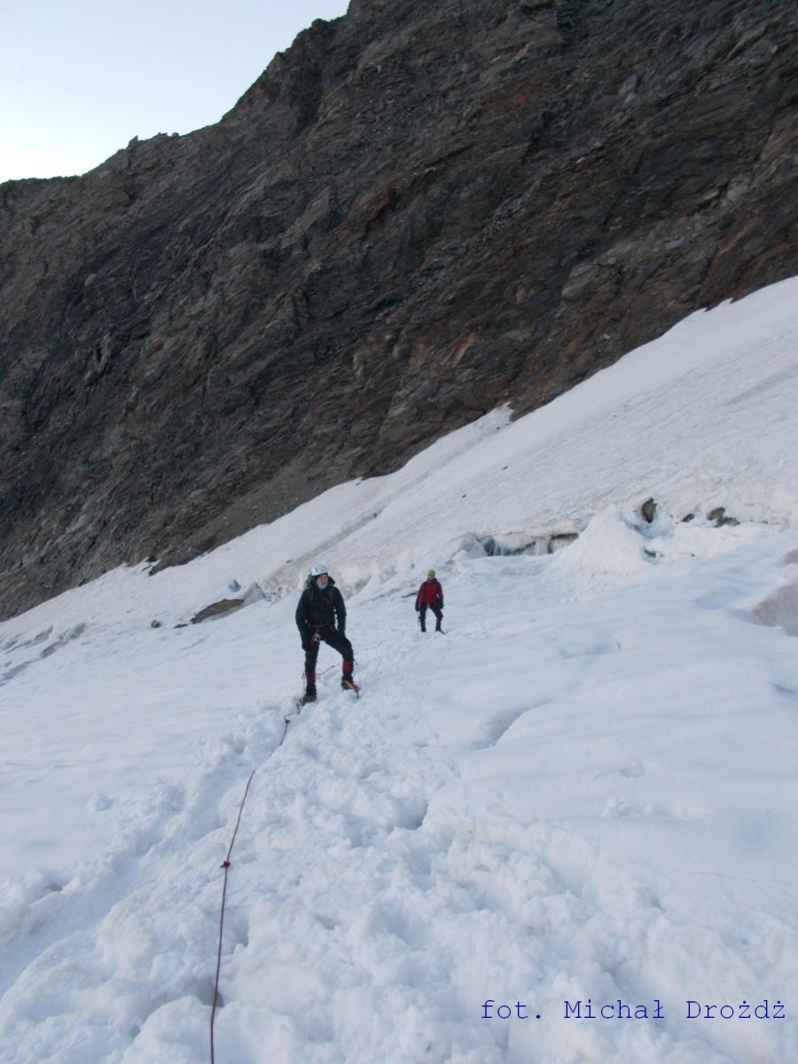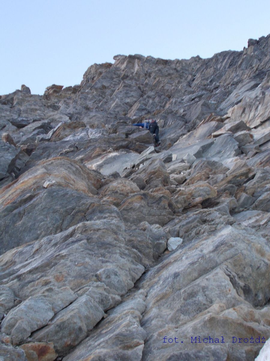 Budzik zadzwonił o 4 rano. Krzątając się koło namiotu widzieliśmy kolejne, mijające nas zespoły, które wyruszyły ze schroniska. Około godziny piątej my też już byliśmy gotowi do działania. Początkowo szliśmy grzbietem moreny, później weszliśmy na lodowiec. Poruszanie się po nim było w tym miejscu na tyle bezpieczne, że nie związaliśmy się ani nie założyliśmy raków. Dalej czekał nas fragment drogi przebiegający po kamieniach, a następnie kolejny odcinek lodowca. Był on na tyle mocno uszczeliniony, że tym razem konieczne okazało się założenie raków i związanie się liną. Maszerując staraliśmy się trzymać jego lewej strony. Idąc po wydeptanych na śniegu śladach dotarliśmy do szczeliny brzeżnej, a po jej przekroczeniu stanęliśmy pod stromą i wysoką na jakieś 100 metrów barierą skalną (w przewodniku wycenioną na II-kę). Po krótkich przygotowaniach rozpoczęliśmy wspinaczkę. Początek drogi był ewidentny – najpierw znaleźliśmy pojedynczego spita, a za chwilę kawałek liny służącej jako poręczówka. Później jednak zaczęły się problemy ze znalezieniem dalszego przebiegu drogi. Idący przed nami zespół niemiecki zaczął kluczyć i szukać właściwego wariantu. Wyprzedziliśmy Niemców i trawersując kilkadziesiąt metrów na prawo dotarliśmy do bardzo kruchego żlebu. Tędy ruszyliśmy wprost do góry. Pomimo wysiłków żeby iść w tym niepewnym terenie jak najostrożniej, co chwila zrzucaliśmy do dołu jakieś kamienie. Ponieważ jednak teren nie był zbyt trudny technicznie dość szybko poruszaliśmy się do przodu. Najbardziej wymagające było kilka ostatnich metrów ściany; po ich pokonaniu znaleźliśmy się już bezpośrednio na Grani Festi.